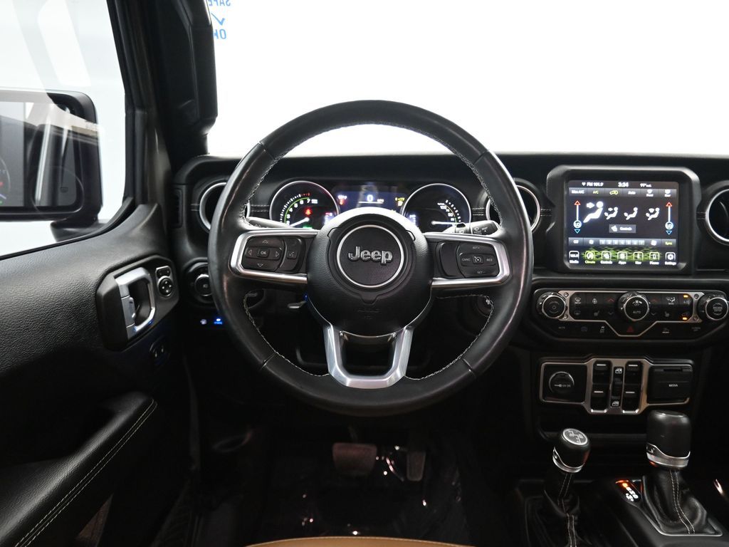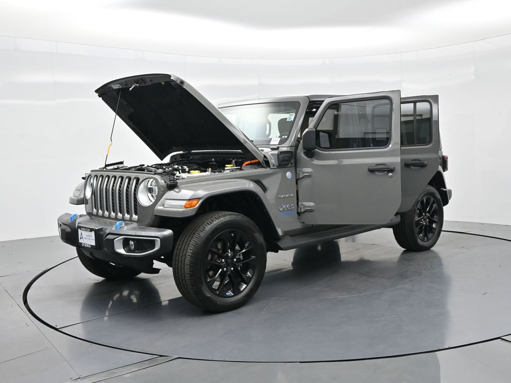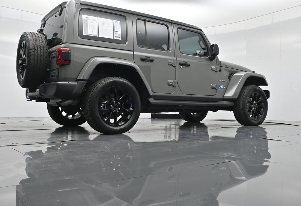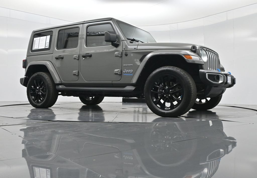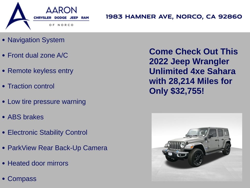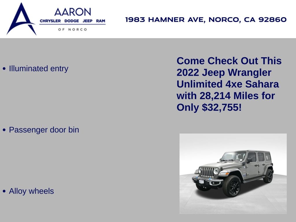 2022 Jeep Wrangler Unlimited Sahara 4xe, plug-in hybrid 2.0L I4 turbo, 8-speed auto 4x4, 1-Owner, no accidents, just over 28,000 miles, 49 MPGe / 20 MPG gas only.Equipped with Customer Preferred Package 29P, body-color 3-piece hard top, heated seats, heated steering wheel, remote start, Mopar all-weather mats, and rear window defroster/wiper. Para la version en espanol, vea abajo.Trail-rated capability includes Selec-Trac full-time 4WD, Dana axles, 3.73 rear axle ratio, skid plates, tow hooks, hill-start assist, electronic stability control, and regenerative braking for hybrid efficiency.Interior highlights bring Uconnect 4C NAV with 8.4-inch touchscreen, Alpine Premium Audio, Apple CarPlay, Android Auto, SiriusXM with subscription services, and dual-zone climate control.Convenience features include keyless entry, push-button start, power windows/locks, automatic headlamps, 20-inch aluminum wheels, LED lighting group, and premium McKinley-trimmed seats.We keep it straightforward with transparent pricing, thorough reconditioning, and easy financing. Our no-pressure team is ready to answer questions and provide a stress-free process. Ready to see it up close? Contact us today to schedule a no-obligation test drive or virtual tour.2022 Jeep Wrangler Unlimited Sahara 4xe, hibrido enchufable 2.0L I4 turbo, transmision automatica de 8 velocidades, 4x4, 1 dueno, sin accidentes, poco mas de 28,000 millas, 49 MPGe / 20 MPG solo gasolina.Equipado con paquete preferido 29P, techo rigido de 3 piezas al color de la carroceria, asientos calefactables, volante calefactable, encendido remoto, tapetes Mopar y desempanador/limpiador trasero.Su capacidad todoterreno incluye traccion 4WD Selec-Trac, ejes Dana, relacion trasera 3.73, placas protectoras, ganchos de remolque, asistente de arranque en pendiente, control de estabilidad y frenado regenerativo para eficiencia hibrida.En el interior ofrece Uconnect 4C NAV con pantalla de 8.4 pulgadas, sistema Alpine Premium, Apple CarPlay, Android Auto, SiriusXM con servicios de suscripcion y clima de doble zona.Las comodidades incluyen acceso sin llave, boton de encendido, vidrios/seguros electricos, faros automaticos, rines de aluminio de 20 pulgadas, grupo de luces LED y asientos McKinley premium.Mantenemos un proceso transparente, reacondicionamiento minucioso y financiamiento sencillo. Nuestro equipo sin presion esta listo para responder tus dudas y darte confianza. Da el siguiente paso escribiendonos para una cotizacion personalizada o para agendar una prueba de manejo conveniente.