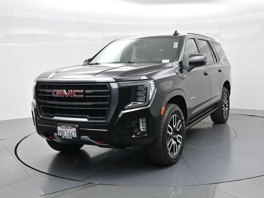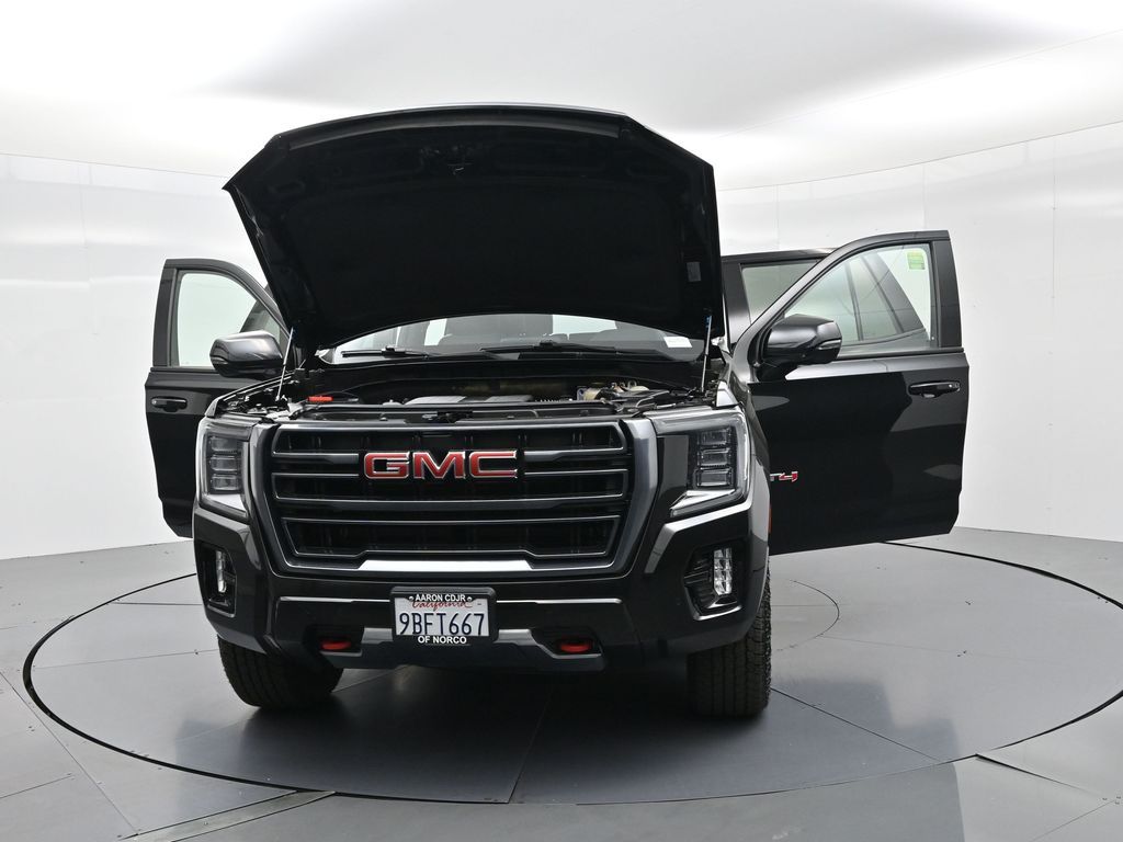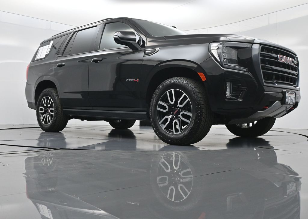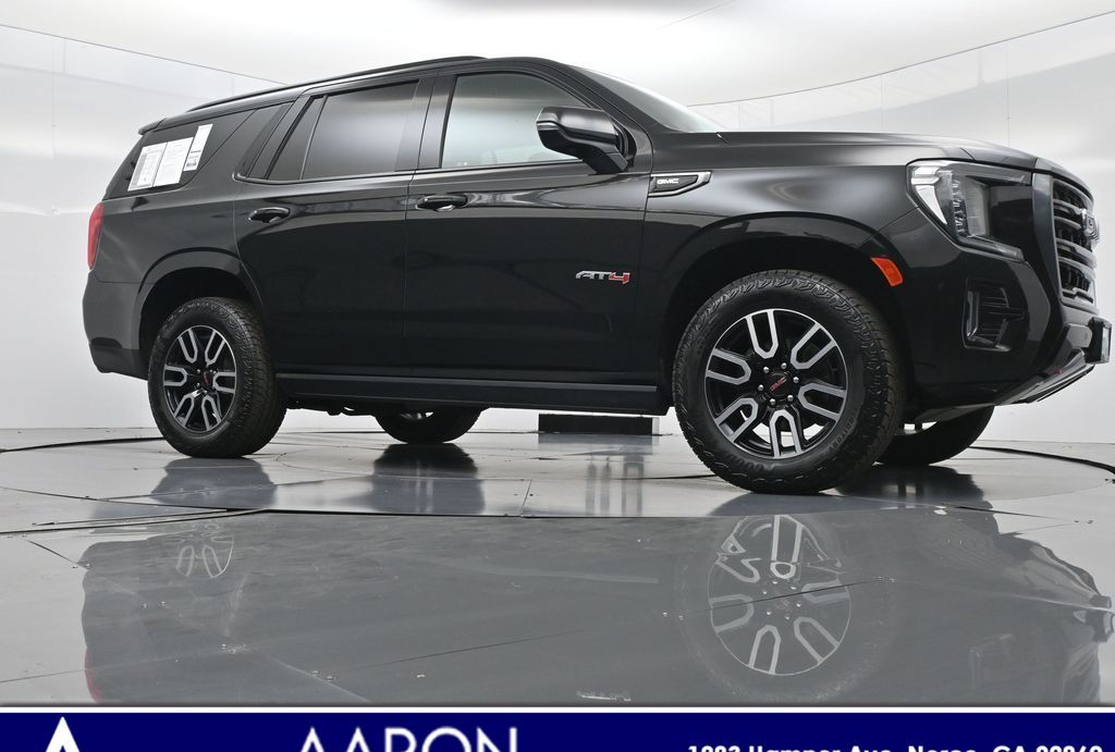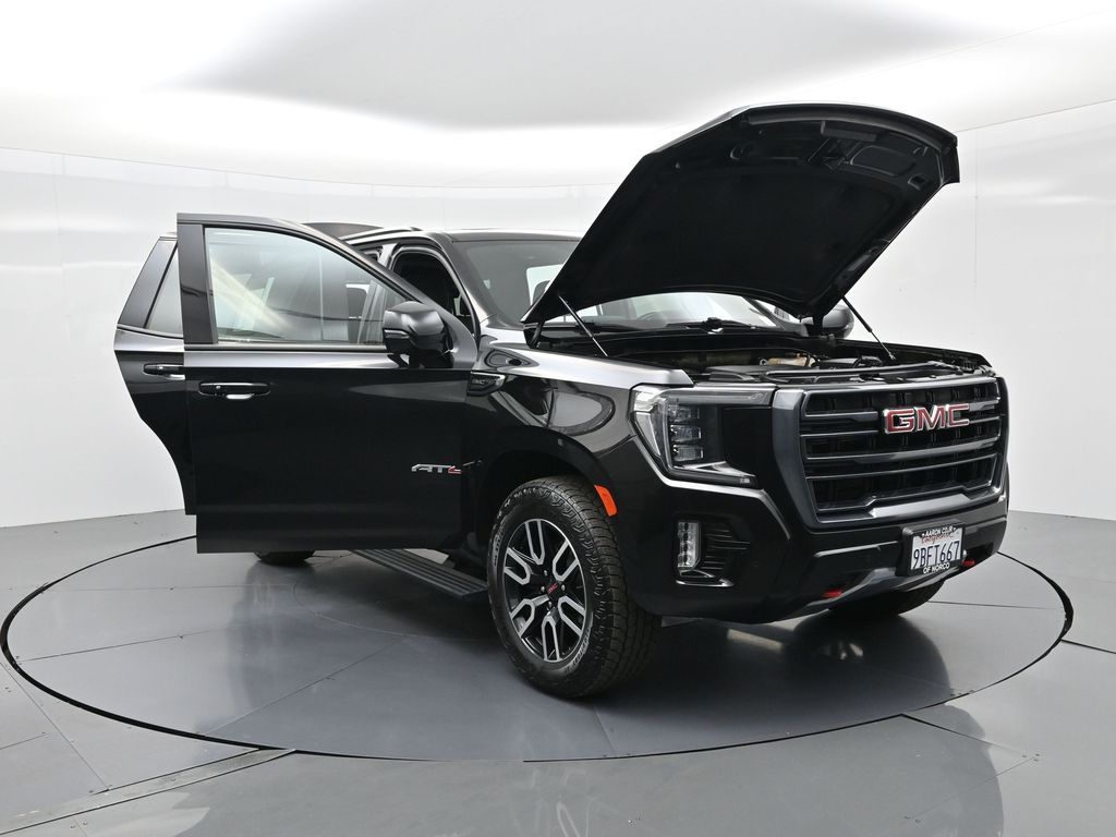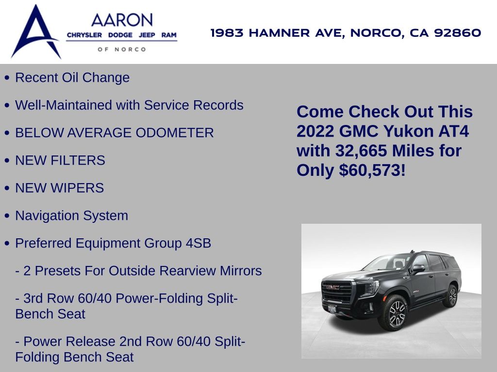 This 2022 GMC Yukon AT4 in striking Onyx Black is a premium full-size SUV that combines off-road capability, refined luxury, and advanced technology. Powered by the robust 6.2L EcoTec3 V8 paired with a smooth 10-speed automatic transmission, it delivers confident acceleration, 4WD capability, and the strength to handle towing and challenging terrain with ease. The AT4 trim is designed for adventure with a mechanical limited-slip differential, two-speed transfer case, hill descent control, skid plates, and 20-inch aluminum wheels with all-terrain tires. Exterior highlights include LED headlamps and taillamps, a bold black and chrome grille, recovery hooks, a power liftgate, and a panoramic power sunroof for open-air driving enjoyment. Inside, the Jet Black interior features heated and ventilated front bucket seats, heated second-row outboard seats, a heated steering wheel, and premium perforated leather upholstery. The 10.2-inch GMC Premium Infotainment System with Google Built-In offers navigation, wireless Apple CarPlay, Android Auto, Bluetooth, SiriusXM, and a premium Bose audio system. Added features like a head-up display, HD surround vision, rear pedestrian alert, and a rear camera mirror enhance safety and convenience. With 32,665 miles and a clean CARFAX history showing regular maintenance, this Yukon AT4 is well-cared-for and ready for its next chapter. Perfect for those who need the space and versatility of a three-row SUV without sacrificing luxury or off-road readiness, this Yukon AT4 offers the capability to handle rugged trails and the refinement to make every mile comfortable. Experience the premium all-terrain difference today.