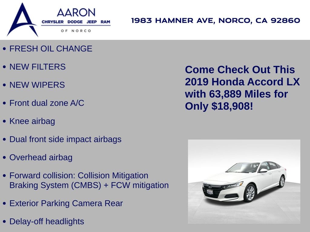 2019 Honda Accord LX Sedan with 1.5L Turbo I4, CVT, and Platinum White Pearl exterior. No accidents, personal vehicle, just under 64,000 miles.Equipped with LED headlights, Collision Mitigation Braking System, Forward Collision Warning, and a rearview camera, this Accord balances advanced safety with everyday convenience. Its interior features cloth seating, a 7" color display audio system, Bluetooth HandsFreeLink, and a USB smartphone interface. Para la version en espanol, vea abajo.Power comes from a 1.5L DOHC 16-valve turbocharged VTEC engine paired to a continuously variable transmission, delivering a smooth drive with an EPA-estimated 30 MPG city and 38 MPG highway. The suspension and steering system are tuned for stability, while Auto High-Beam Headlights and Adaptive Cruise Control enhance driver confidence.With its spacious trunk, fold-down rear seatbacks, and practical cabin storage, this Accord provides plenty of room for daily commuting or weekend travel. The five-passenger cabin also benefits from dual-zone automatic climate control, power windows, and speed-sensitive volume compensation.The 2019 Honda Accord earned an IIHS Top Safety Pick and NHTSA 5-Star Overall Safety Rating, cementing its reputation as one of the safest sedans in its class.Ready to see this vehicle up close? Contact us today to schedule a no-obligation test drive or virtual tour, and let's discuss how we can tailor financing to fit your needs. Our team is dedicated to addressing any concerns and guiding you every step of the way.---2019 Honda Accord LX Sedan con motor 1.5L Turbo I4, transmision CVT y exterior en Platinum White Pearl. Sin accidentes, vehiculo personal, poco menos de 64,000 millas.Equipado con faros LED, sistema de frenado con mitigacion de colision, advertencia de colision frontal y camara de reversa, este Accord combina seguridad avanzada con conveniencia diaria. Su interior incluye asientos de tela, sistema de audio con pantalla a color de 7", Bluetooth HandsFreeLink y puerto USB para smartphones.El motor 1.5L DOHC VTEC turboalimentado con transmision CVT ofrece una conduccion suave y eficiente, logrando un estimado EPA de 30 MPG en ciudad y 38 MPG en carretera. La suspension y direccion estan disenadas para estabilidad, mientras que los faros automaticos y el control de crucero adaptativo aumentan la confianza del conductor.Con su cajuela espaciosa, asientos traseros abatibles y multiples espacios de almacenamiento, este Accord brinda comodidad tanto en el manejo diario como en viajes de fin de semana. La cabina para cinco pasajeros cuenta con control de clima automatico de doble zona, ventanas electricas y sistema de volumen sensible a la velocidad.El Honda Accord 2019 fue galardonado con el premio IIHS Top Safety Pick y la calificacion de 5 estrellas de la NHTSA, reafirmando su posicion como uno de los sedanes mas seguros de su clase.Si estas listo para conocerlo en persona, contactanos hoy para programar una prueba de manejo sin compromiso o un recorrido virtual. Hablemos de opciones de financiamiento adaptadas a tus necesidades; nuestro equipo esta listo para guiarte en cada paso con transparencia.