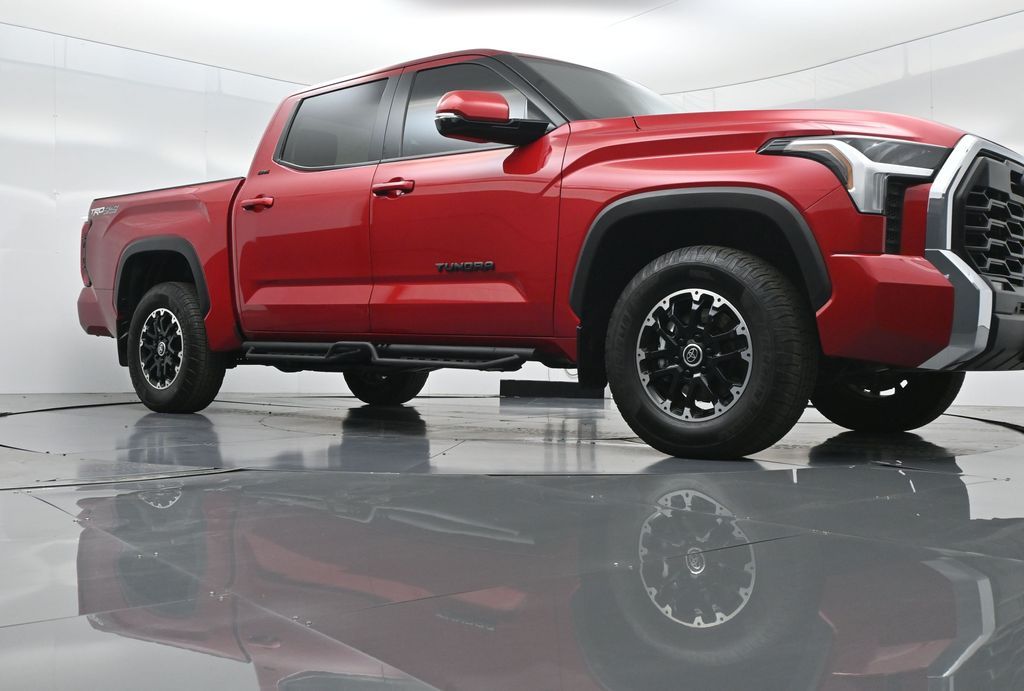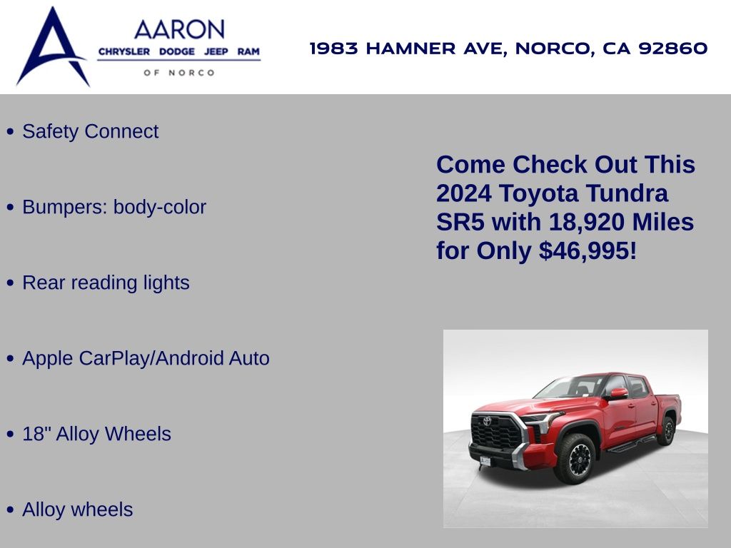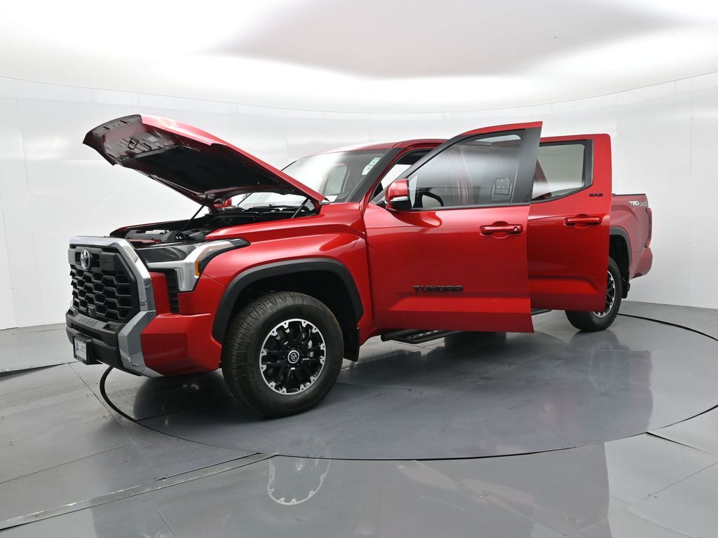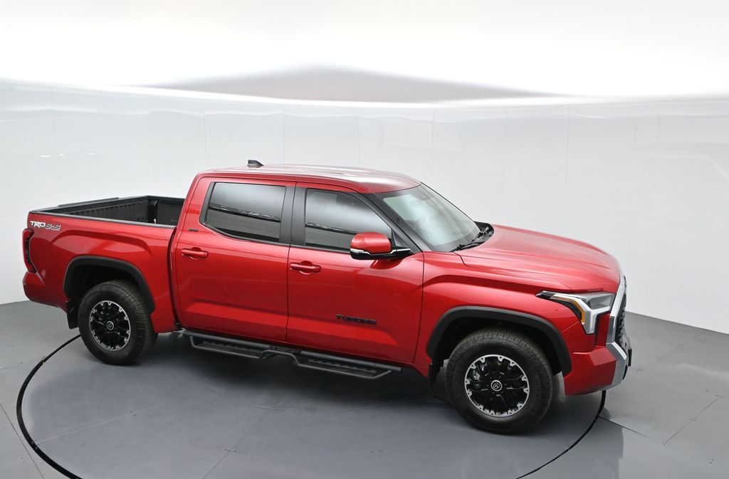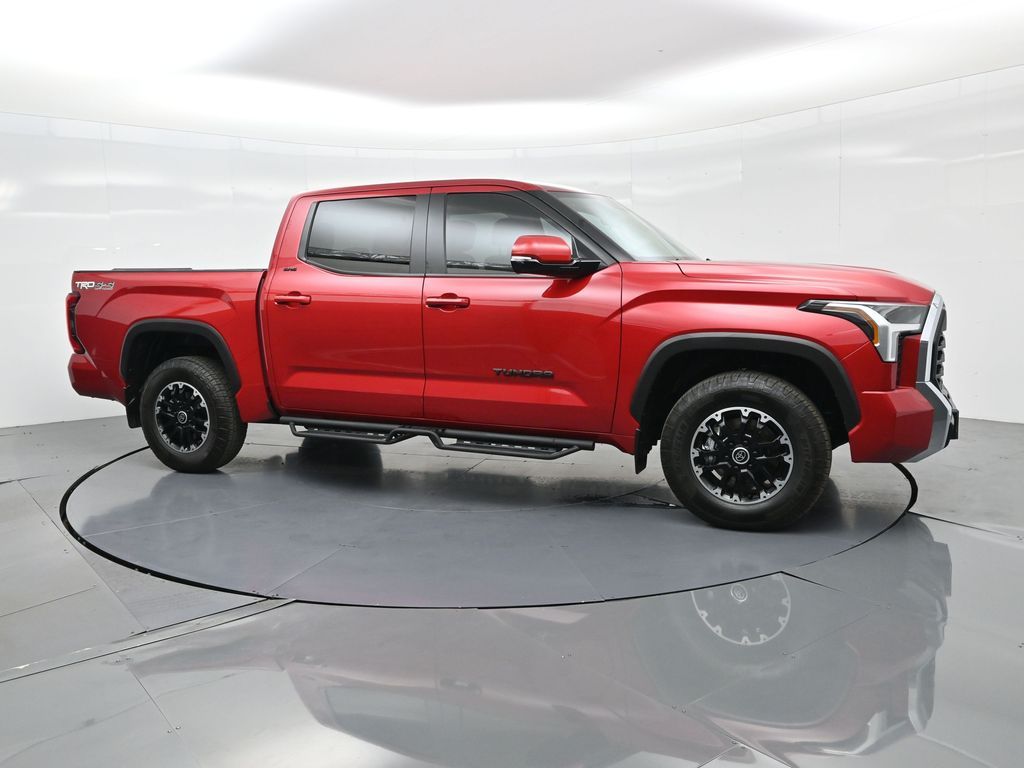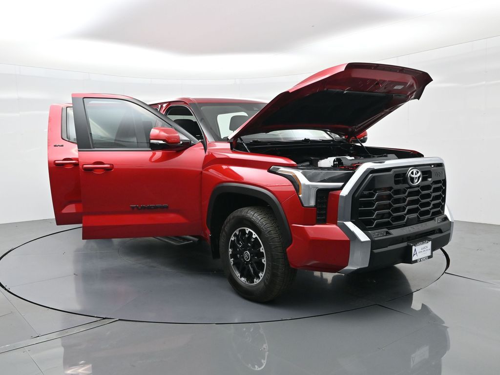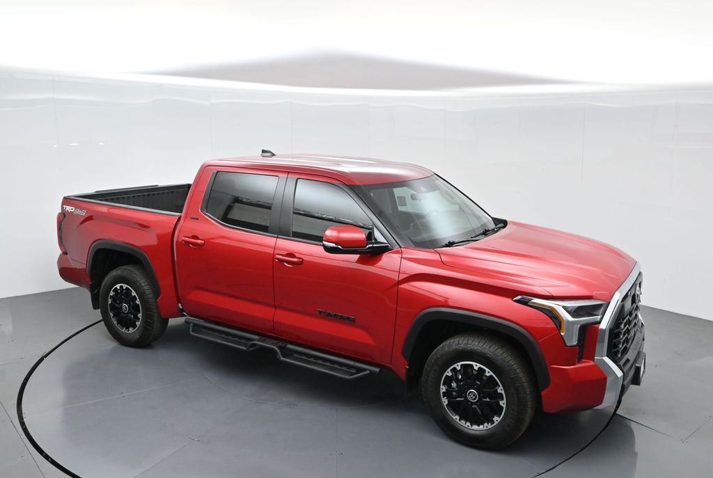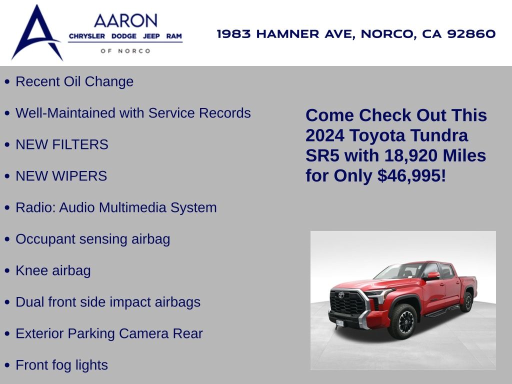 Commanding in presence and capability, this 2024 Toyota Tundra SR5 CrewMax 4x4 blends powerful performance with modern utility, showing just 18,920 miles and finished in striking Supersonic Red with a clean Black fabric interior. Under the hood, the 3.4 liter twin turbo V6 engine delivers a robust 389 horsepower, paired with a refined 10 speed electronically controlled automatic transmission and part time four wheel drive for confident performance on pavement or trail. This Tundra is equipped with the popular SR5 Convenience Package and TRD Off Road Package, adding upgraded shocks, skid plates, off road tuned suspension, and 18 inch alloy wheels wrapped in all terrain tires for serious trail readiness. Comfort meets durability inside the spacious CrewMax cabin, featuring power adjustable front seats, a leather wrapped heated steering wheel, rear under seat storage, rear seat vents, dual zone automatic climate control, and all weather floor liners. Technology is seamlessly integrated with the Uconnect 8 inch touchscreen infotainment system that includes Bluetooth, smartphone compatibility, voice control, SiriusXM radio, integrated backup camera, and multiple USB charge ports to keep devices powered. The off road package further enhances safety and control with hill descent control, Multi Terrain Select, Crawl Control, and an electronically controlled transfer case with locking rear differential. Additional features include a spray in bedliner, power sliding rear window, black exterior accents, LED headlights and fog lamps, and a factory installed tow package with hitch and trailer sway control, giving you both rugged towing capacity and daily drivability. Backed by a clean one owner Carfax history with consistent service and no accidents reported, this personal use Tundra represents an outstanding value with low miles and proven reliability. Built with Toyota's reputation for durability and engineered for the real world, this 2024 Tundra SR5 is ready to handle your toughest jobs or next weekend escape with confidence. Come see why this full size pickup continues to set the benchmark for strength, technology, and everyday practicality.
