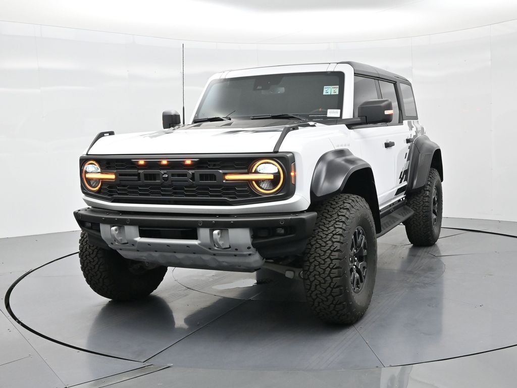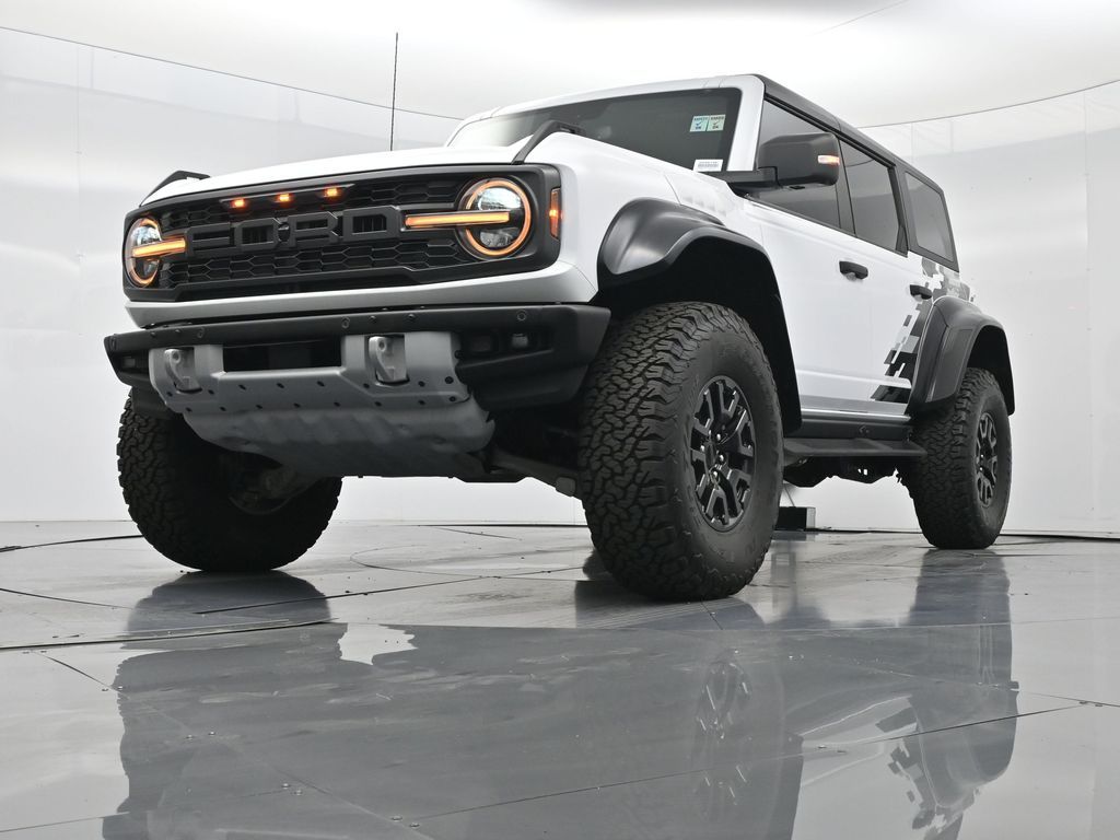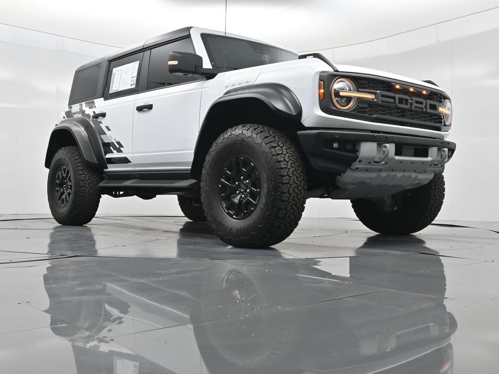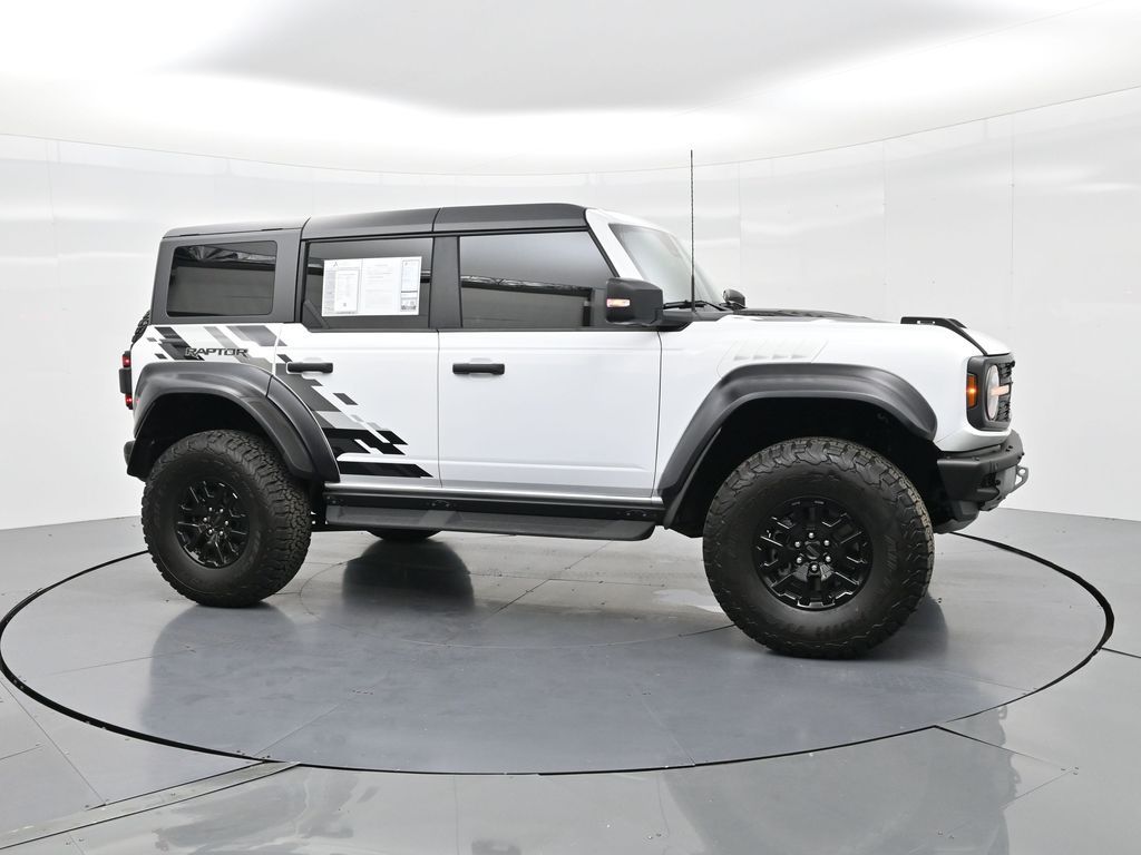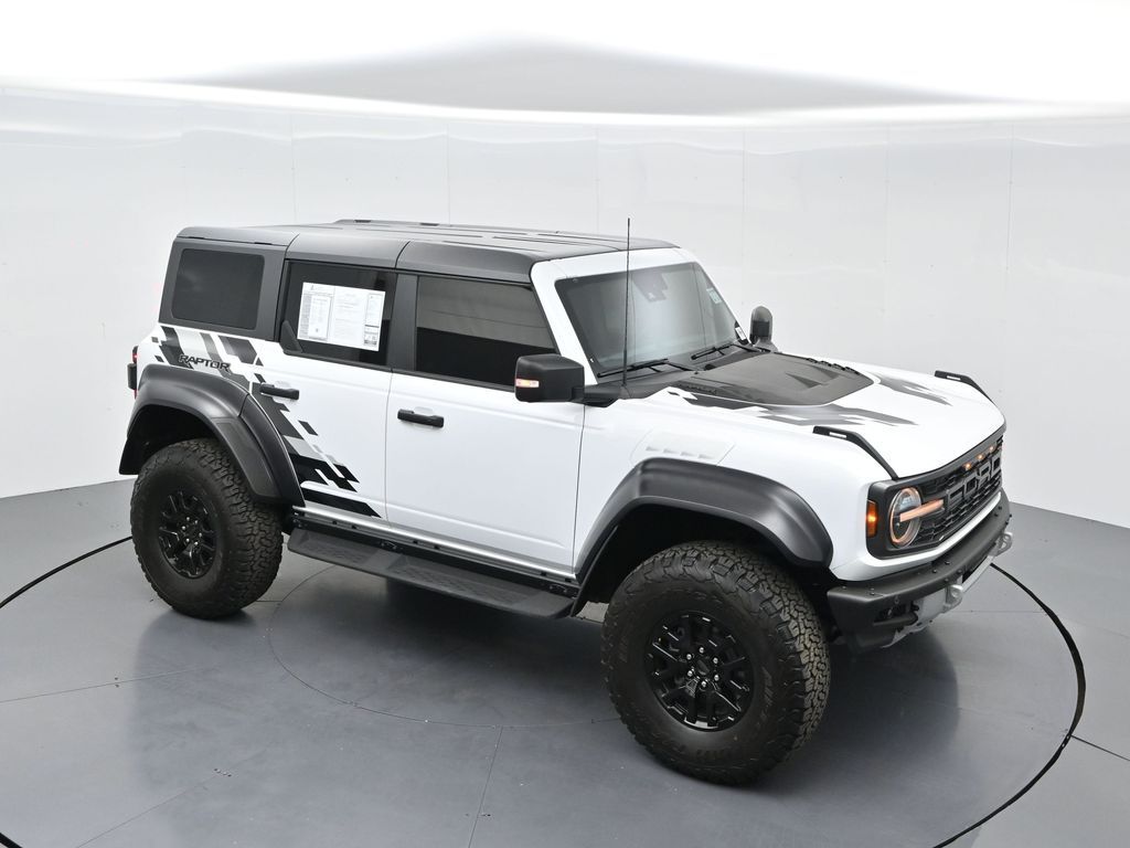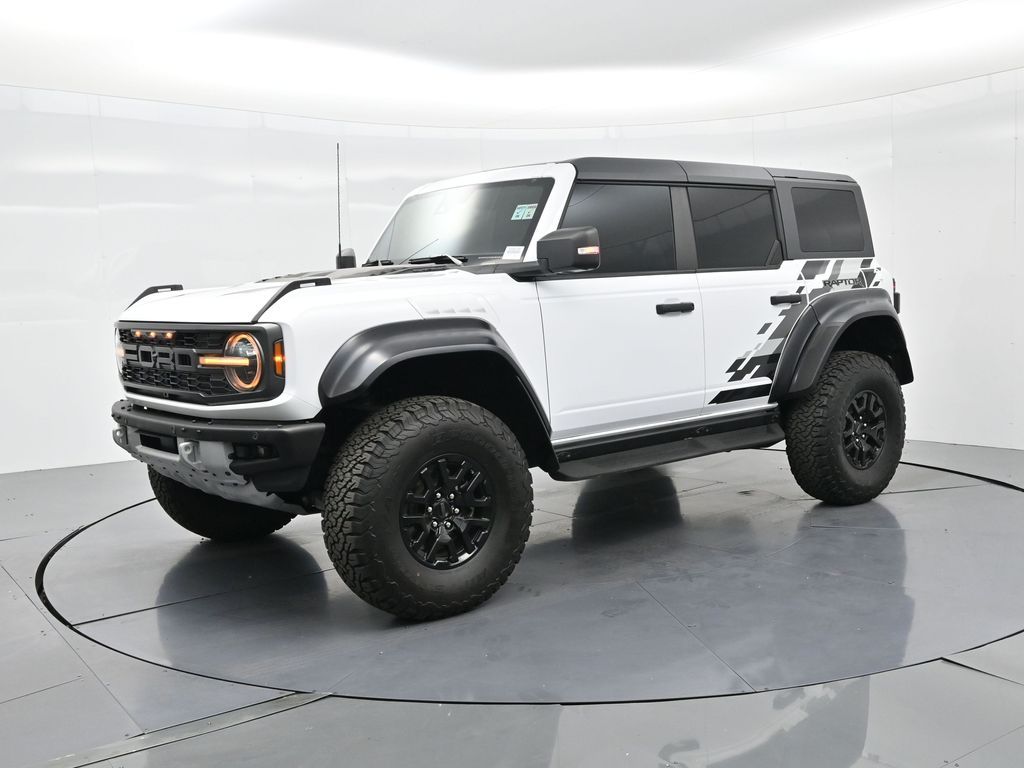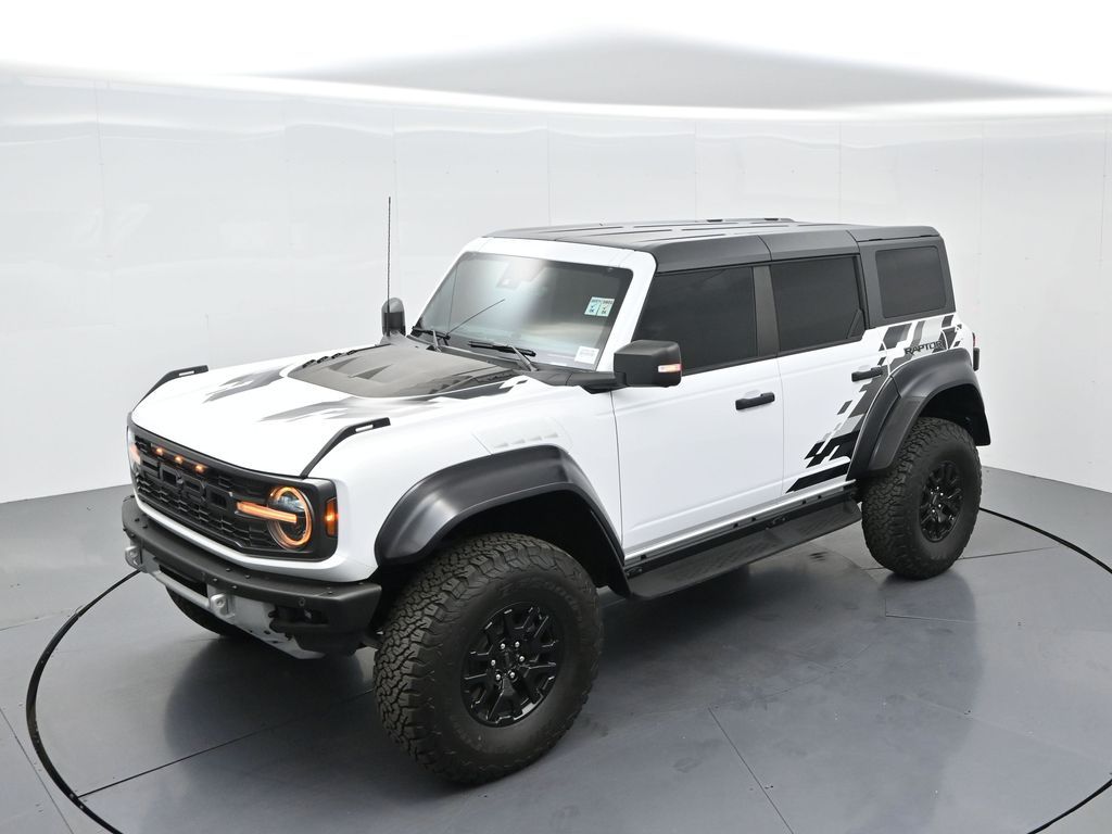This 2023 Ford Bronco Raptor in Oxford White is an extreme off-road performance SUV engineered by Ford Performance to dominate trails, dunes, and rocky terrain while offering modern comfort and technology. Powered by a 3.0L EcoBoost V6 paired with a 10-speed automatic transmission, it delivers exhilarating power and torque, enhanced by advanced 4x4 capability, front and rear locking differentials, FOX Live Valve HOSS 4.0 suspension, and 37-inch all-terrain tires on 17-inch black high-gloss wheels. The Raptor Series adds key performance and convenience upgrades including the Lux Package with a 12-inch LCD touchscreen, 360-degree camera, adaptive cruise control, B\&O premium sound system, heated steering wheel, and wireless charging. The interior features leather and suede sport seats with Raptor-specific accents, a heated front row, dual-zone climate control, and an advanced driver information center. Exterior enhancements include heavy-duty modular front and rear bumpers, a removable hard top, rock rails, full LED lighting, unique Raptor badging, and tow hooks. Safety and driver assistance technologies include pre-collision assist with automatic emergency braking, blind spot monitoring with cross-traffic alert, lane keeping system, rear view camera, and trailer sway control. With only 1,231 miles, a clean CARFAX history, and regular maintenance, this Bronco Raptor is essentially like new and ready for your next adventure. Combining Baja-inspired capability, cutting-edge tech, and aggressive style, this Bronco Raptor is built for enthusiasts who want unmatched off-road performance with everyday usability. Experience the pinnacle of Bronco engineering today.