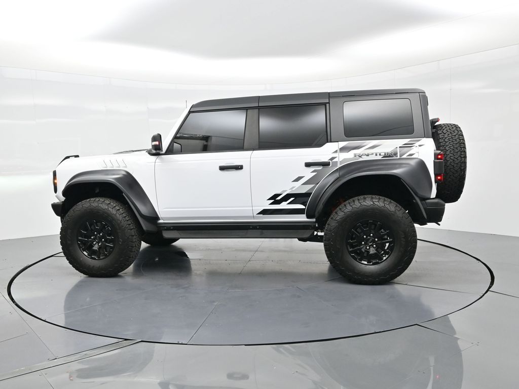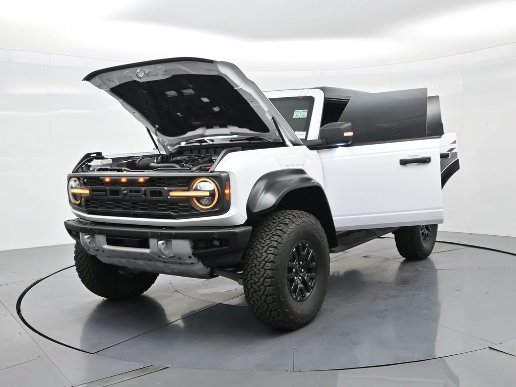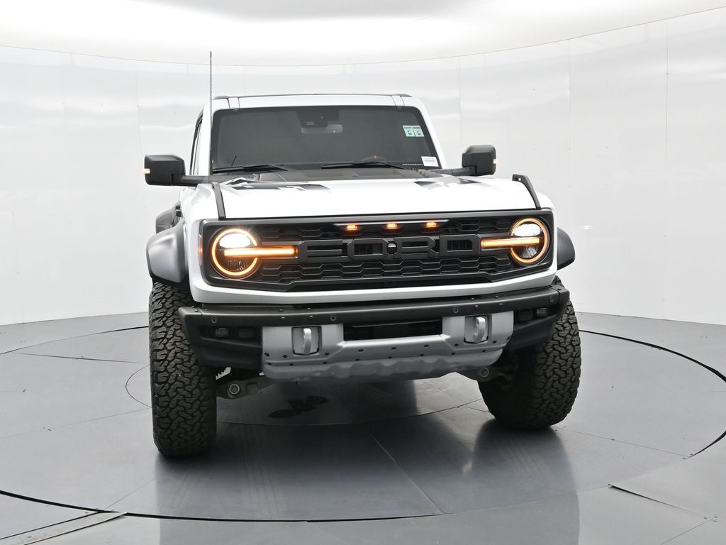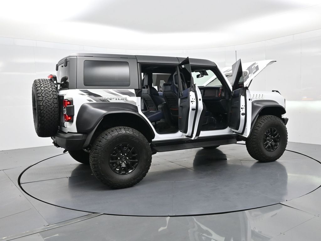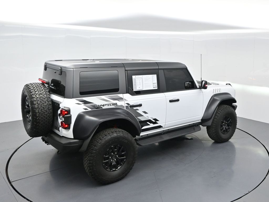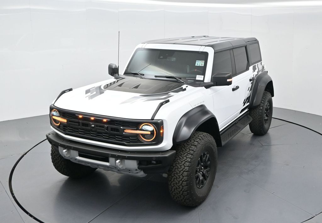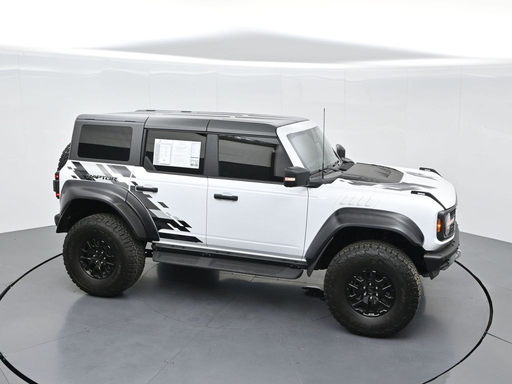 This 2023 Ford Bronco Raptor in Oxford White is an extreme off-road performance SUV engineered by Ford Performance to dominate trails, dunes, and rocky terrain while offering modern comfort and technology. Powered by a 3.0L EcoBoost V6 paired with a 10-speed automatic transmission, it delivers exhilarating power and torque, enhanced by advanced 4x4 capability, front and rear locking differentials, FOX Live Valve HOSS 4.0 suspension, and 37-inch all-terrain tires on 17-inch black high-gloss wheels. The Raptor Series adds key performance and convenience upgrades including the Lux Package with a 12-inch LCD touchscreen, 360-degree camera, adaptive cruise control, B\&O premium sound system, heated steering wheel, and wireless charging. The interior features leather and suede sport seats with Raptor-specific accents, a heated front row, dual-zone climate control, and an advanced driver information center. Exterior enhancements include heavy-duty modular front and rear bumpers, a removable hard top, rock rails, full LED lighting, unique Raptor badging, and tow hooks. Safety and driver assistance technologies include pre-collision assist with automatic emergency braking, blind spot monitoring with cross-traffic alert, lane keeping system, rear view camera, and trailer sway control. With only 1,231 miles, a clean CARFAX history, and regular maintenance, this Bronco Raptor is essentially like new and ready for your next adventure. Combining Baja-inspired capability, cutting-edge tech, and aggressive style, this Bronco Raptor is built for enthusiasts who want unmatched off-road performance with everyday usability. Experience the pinnacle of Bronco engineering today.