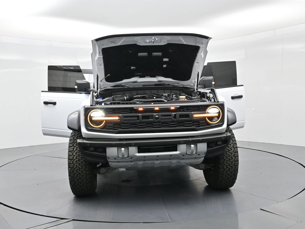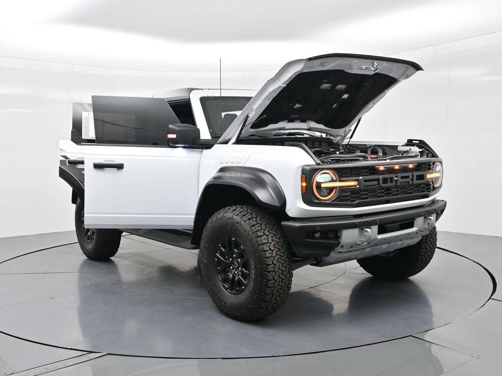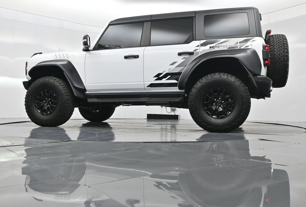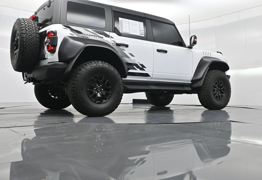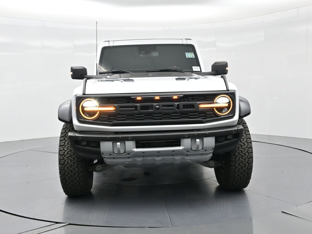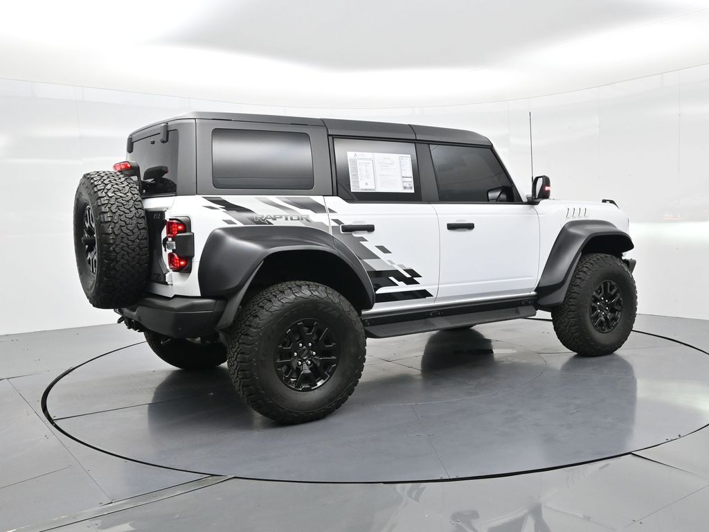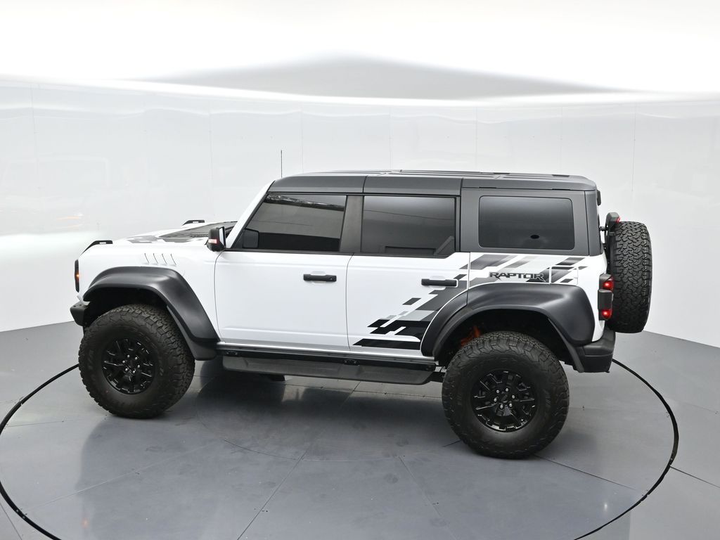 This 2023 Ford Bronco Raptor in Oxford White is an extreme off-road performance SUV engineered by Ford Performance to dominate trails, dunes, and rocky terrain while offering modern comfort and technology. Powered by a 3.0L EcoBoost V6 paired with a 10-speed automatic transmission, it delivers exhilarating power and torque, enhanced by advanced 4x4 capability, front and rear locking differentials, FOX Live Valve HOSS 4.0 suspension, and 37-inch all-terrain tires on 17-inch black high-gloss wheels. The Raptor Series adds key performance and convenience upgrades including the Lux Package with a 12-inch LCD touchscreen, 360-degree camera, adaptive cruise control, B\&O premium sound system, heated steering wheel, and wireless charging. The interior features leather and suede sport seats with Raptor-specific accents, a heated front row, dual-zone climate control, and an advanced driver information center. Exterior enhancements include heavy-duty modular front and rear bumpers, a removable hard top, rock rails, full LED lighting, unique Raptor badging, and tow hooks. Safety and driver assistance technologies include pre-collision assist with automatic emergency braking, blind spot monitoring with cross-traffic alert, lane keeping system, rear view camera, and trailer sway control. With only 1,231 miles, a clean CARFAX history, and regular maintenance, this Bronco Raptor is essentially like new and ready for your next adventure. Combining Baja-inspired capability, cutting-edge tech, and aggressive style, this Bronco Raptor is built for enthusiasts who want unmatched off-road performance with everyday usability. Experience the pinnacle of Bronco engineering today.