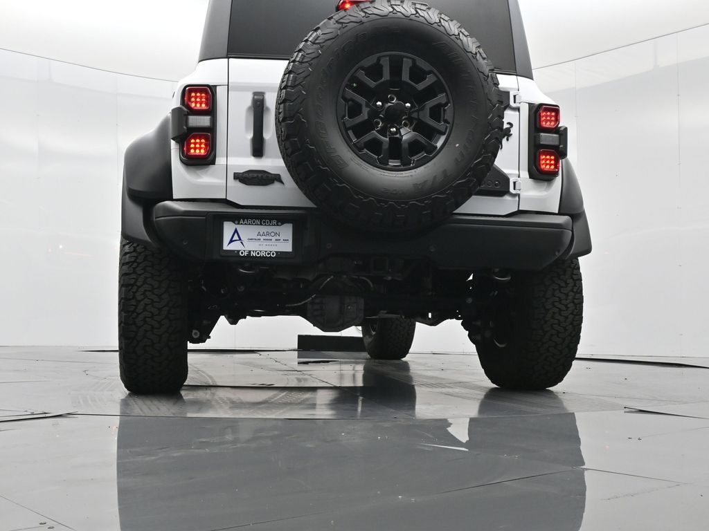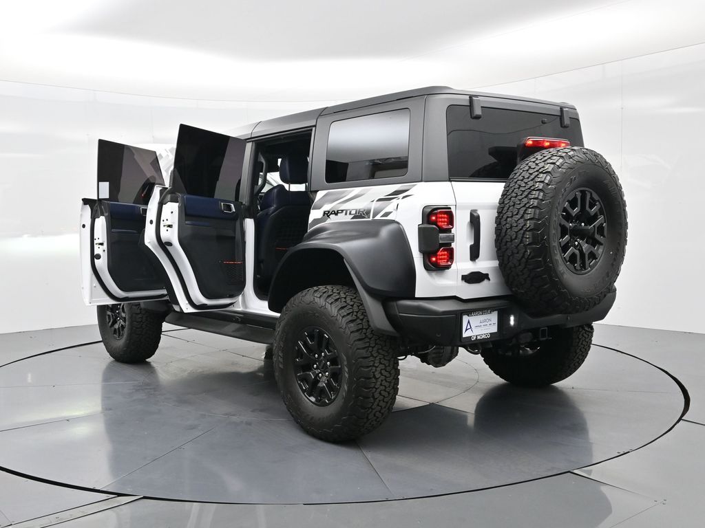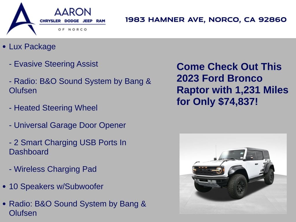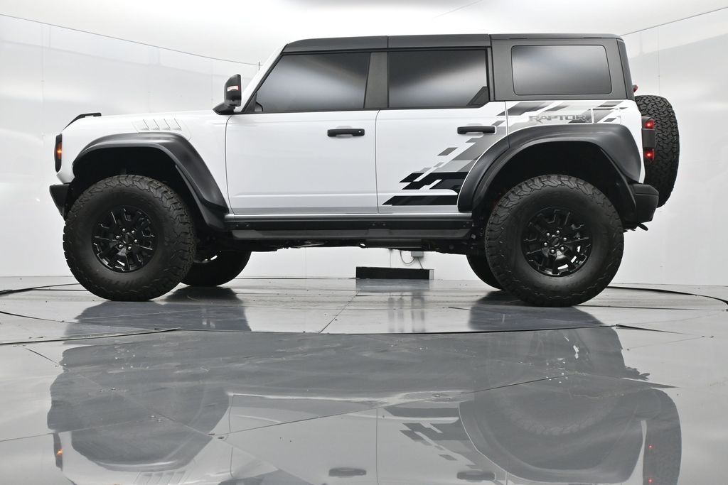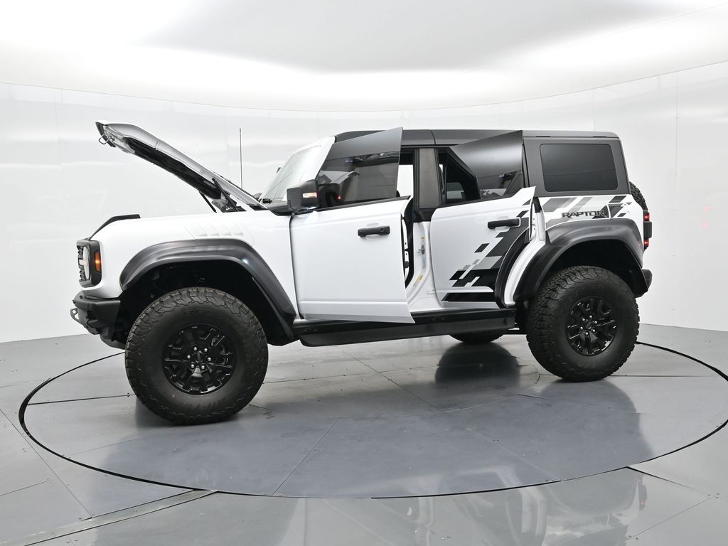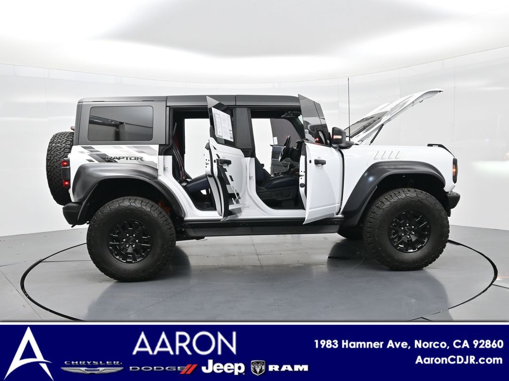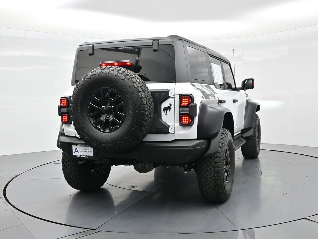 This 2023 Ford Bronco Raptor in Oxford White is an extreme off-road performance SUV engineered by Ford Performance to dominate trails, dunes, and rocky terrain while offering modern comfort and technology. Powered by a 3.0L EcoBoost V6 paired with a 10-speed automatic transmission, it delivers exhilarating power and torque, enhanced by advanced 4x4 capability, front and rear locking differentials, FOX Live Valve HOSS 4.0 suspension, and 37-inch all-terrain tires on 17-inch black high-gloss wheels. The Raptor Series adds key performance and convenience upgrades including the Lux Package with a 12-inch LCD touchscreen, 360-degree camera, adaptive cruise control, B\&O premium sound system, heated steering wheel, and wireless charging. The interior features leather and suede sport seats with Raptor-specific accents, a heated front row, dual-zone climate control, and an advanced driver information center. Exterior enhancements include heavy-duty modular front and rear bumpers, a removable hard top, rock rails, full LED lighting, unique Raptor badging, and tow hooks. Safety and driver assistance technologies include pre-collision assist with automatic emergency braking, blind spot monitoring with cross-traffic alert, lane keeping system, rear view camera, and trailer sway control. With only 1,231 miles, a clean CARFAX history, and regular maintenance, this Bronco Raptor is essentially like new and ready for your next adventure. Combining Baja-inspired capability, cutting-edge tech, and aggressive style, this Bronco Raptor is built for enthusiasts who want unmatched off-road performance with everyday usability. Experience the pinnacle of Bronco engineering today.