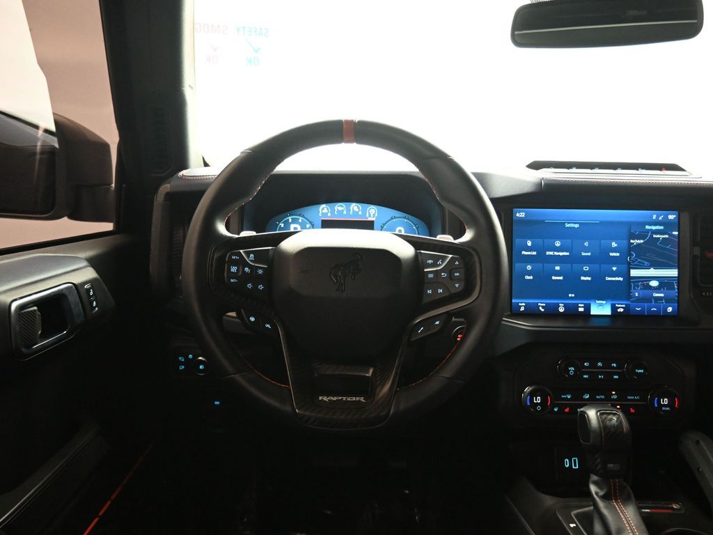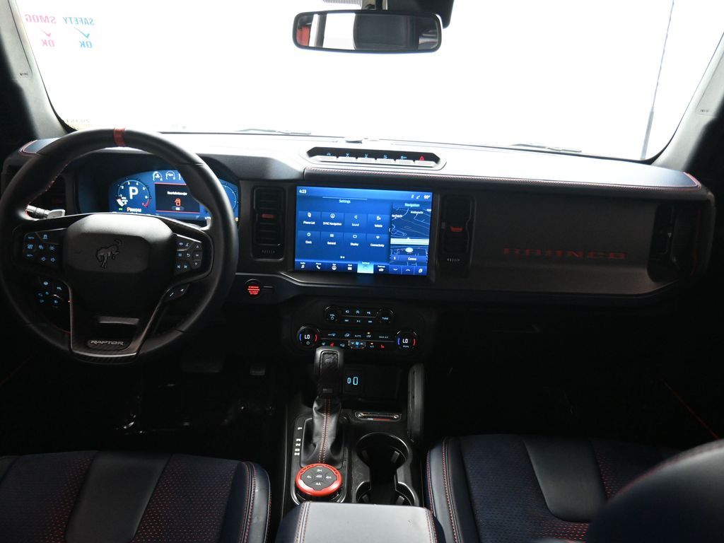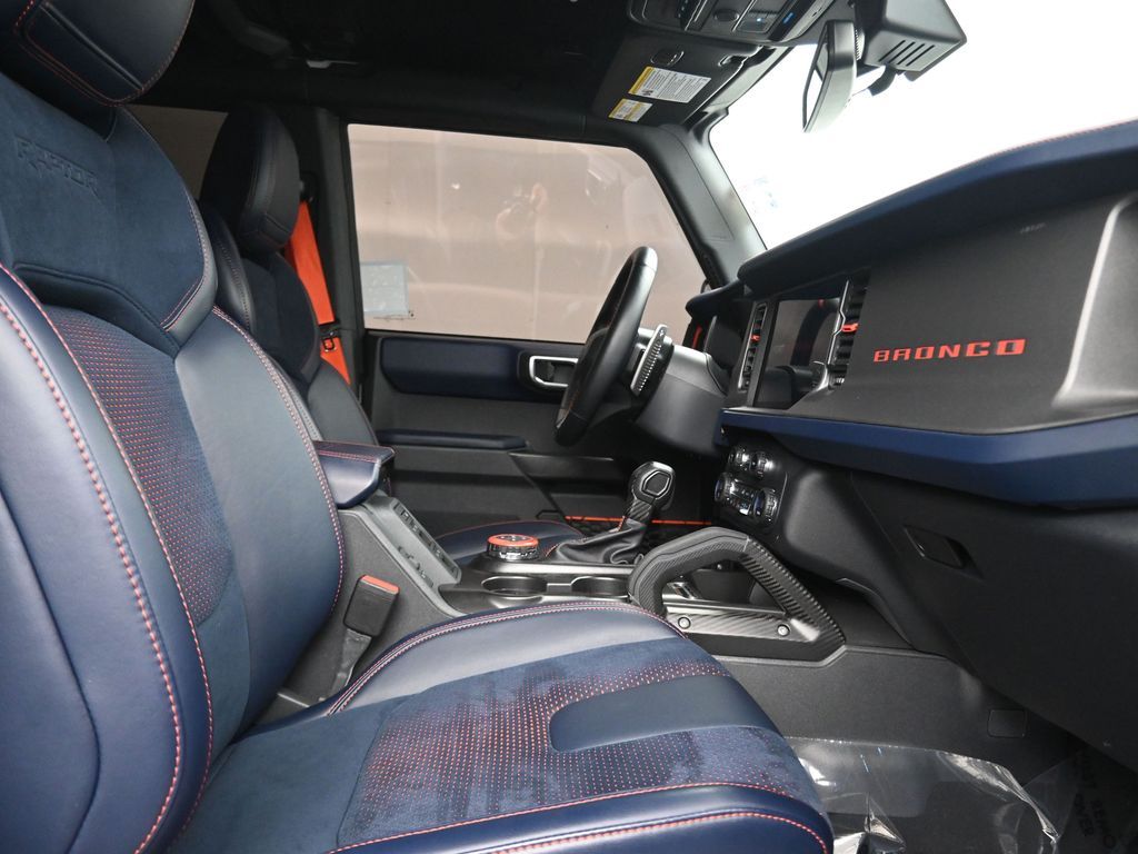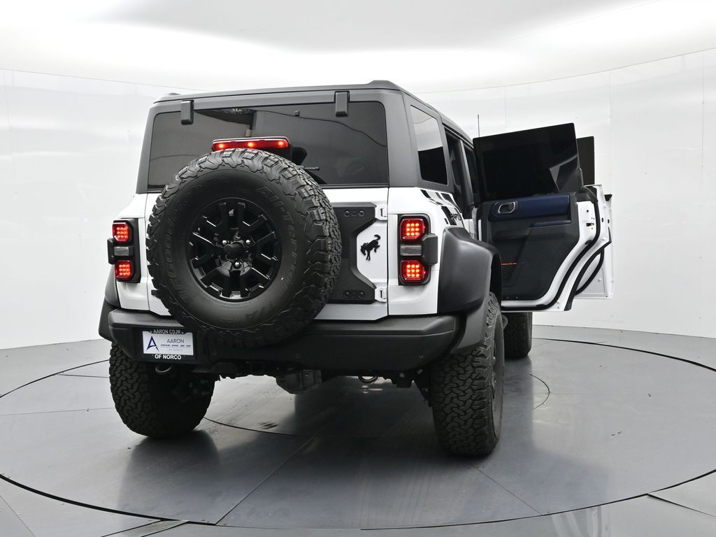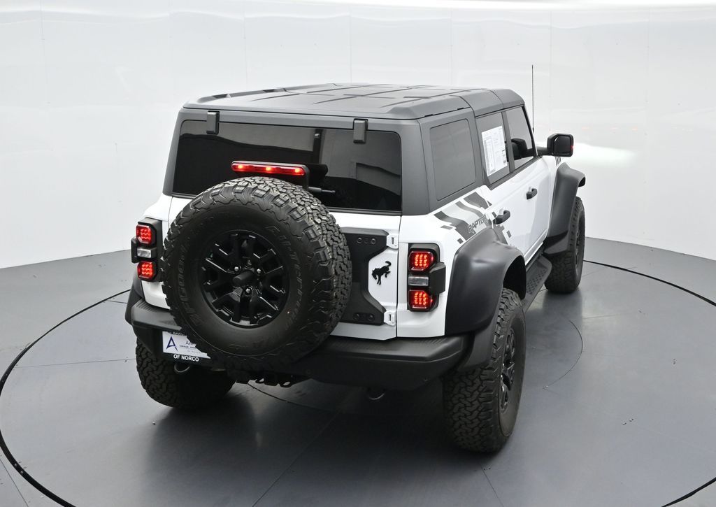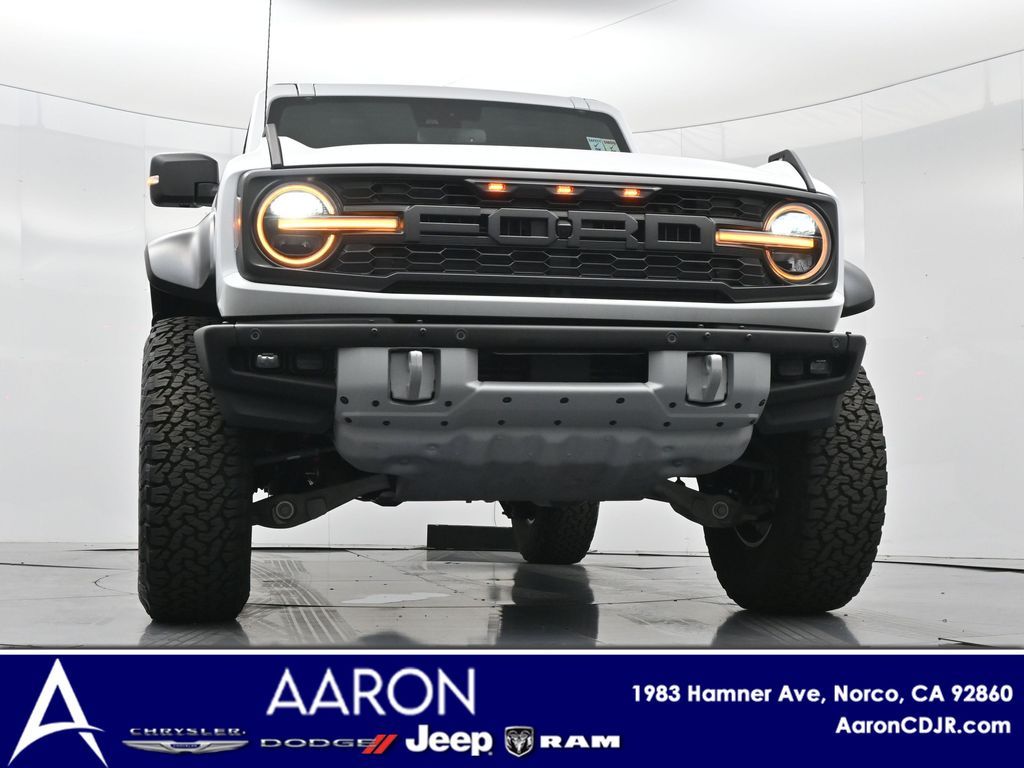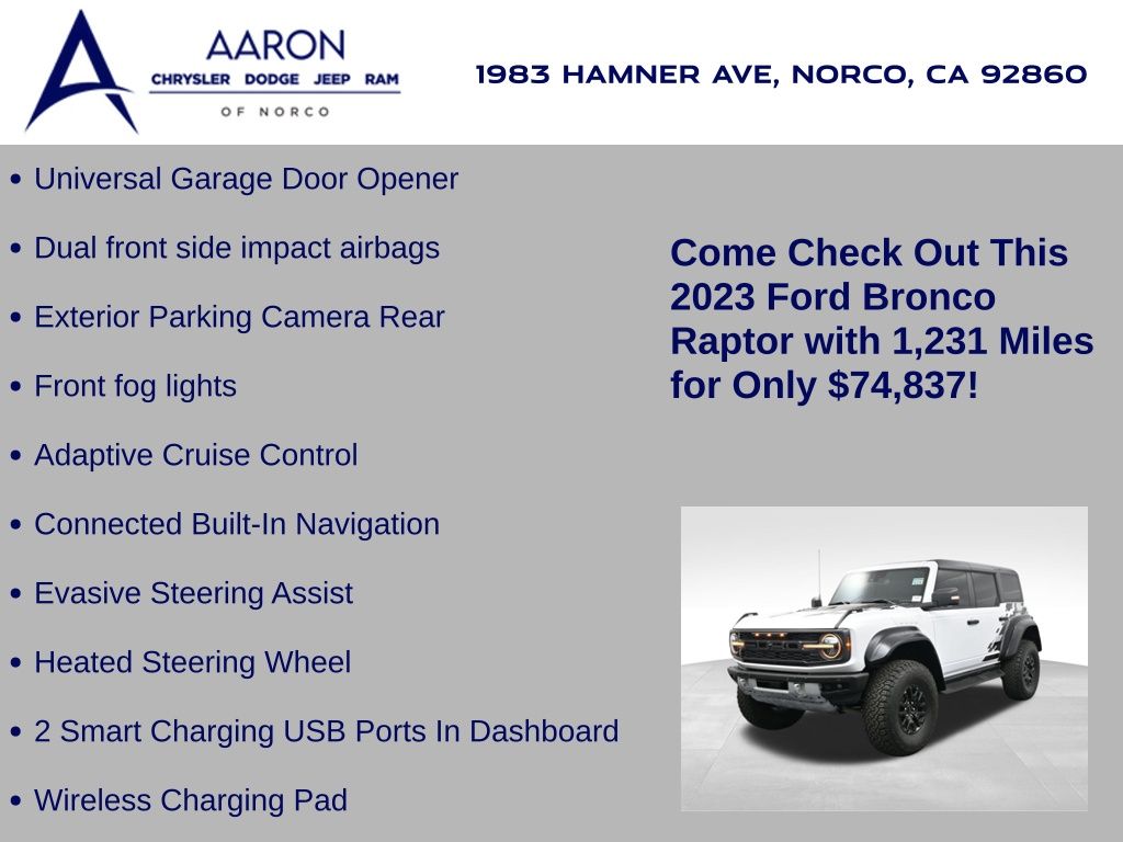 This 2023 Ford Bronco Raptor in Oxford White is an extreme off-road performance SUV engineered by Ford Performance to dominate trails, dunes, and rocky terrain while offering modern comfort and technology. Powered by a 3.0L EcoBoost V6 paired with a 10-speed automatic transmission, it delivers exhilarating power and torque, enhanced by advanced 4x4 capability, front and rear locking differentials, FOX Live Valve HOSS 4.0 suspension, and 37-inch all-terrain tires on 17-inch black high-gloss wheels. The Raptor Series adds key performance and convenience upgrades including the Lux Package with a 12-inch LCD touchscreen, 360-degree camera, adaptive cruise control, B\&O premium sound system, heated steering wheel, and wireless charging. The interior features leather and suede sport seats with Raptor-specific accents, a heated front row, dual-zone climate control, and an advanced driver information center. Exterior enhancements include heavy-duty modular front and rear bumpers, a removable hard top, rock rails, full LED lighting, unique Raptor badging, and tow hooks. Safety and driver assistance technologies include pre-collision assist with automatic emergency braking, blind spot monitoring with cross-traffic alert, lane keeping system, rear view camera, and trailer sway control. With only 1,231 miles, a clean CARFAX history, and regular maintenance, this Bronco Raptor is essentially like new and ready for your next adventure. Combining Baja-inspired capability, cutting-edge tech, and aggressive style, this Bronco Raptor is built for enthusiasts who want unmatched off-road performance with everyday usability. Experience the pinnacle of Bronco engineering today.