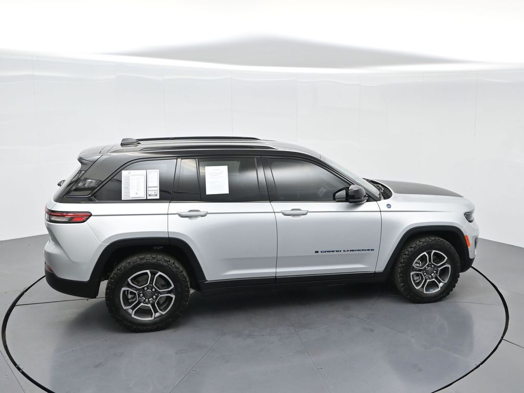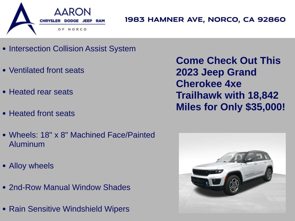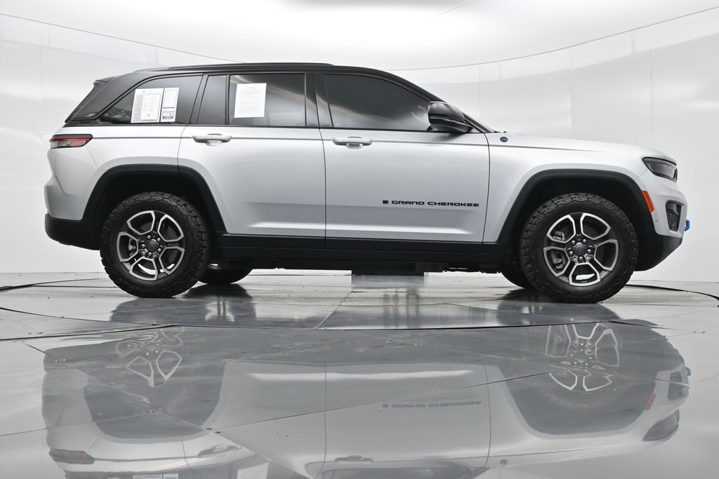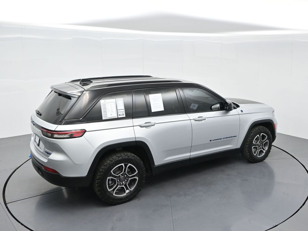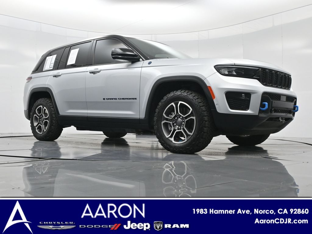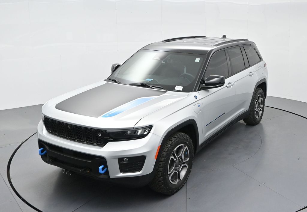 This 2023 Jeep Grand Cherokee Trailhawk 4xe in striking Silver Zynith is the ultimate combination of rugged off-road capability, premium comfort, and advanced plug-in hybrid technology. Powered by a 2.0L DOHC turbocharged PHEV engine paired with an 8-speed automatic transmission and Jeeps legendary Quadra-Drive II 4x4 system, it delivers impressive torque, confident all-terrain performance, and the efficiency of electric-only driving for short trips. The Trailhawk trim is purpose-built for adventure, featuring front disconnecting sway bar, Selec-Terrain traction management, Quadra-Lift air suspension, skid plates, red tow hooks, and 265/60R18 all-terrain tires on machined/painted aluminum wheels. Off-road readiness is further enhanced with hill descent control, Selec-Speed control, and Jeeps Trail Rated durability. Inside, the Grand Cherokee Trailhawk pampers with a leather-trimmed interior, ventilated and heated front seats, heated rear seats, heated steering wheel, and a premium McIntosh audio system. The Uconnect 5 NAV system features a massive 10.1-inch display with navigation, Apple CarPlay, Android Auto, wireless charging pad, and a head-up display for key driving information. Additional highlights include a dual-pane panoramic sunroof, remote start, memory settings for the drivers seat and mirrors, adaptive cruise control, blind spot monitoring, rear cross path detection, surround-view camera, and night vision with pedestrian and animal detection. With only 18,842 miles, a clean 1-owner CARFAX history, and regular maintenance, this Trailhawk 4xe is in excellent condition and still under factory warranty. Combining trail-conquering capability, luxury appointments, and hybrid efficiency, this Grand Cherokee Trailhawk 4xe is ready to take you from city streets to remote trails with confidence and comfort. Experience it today!