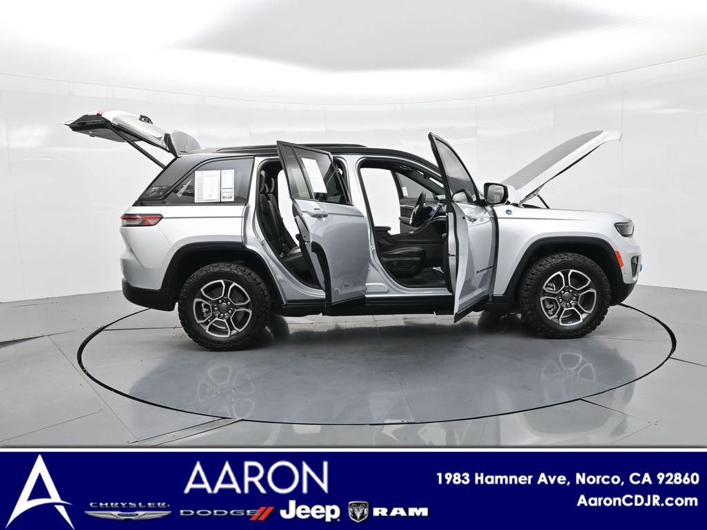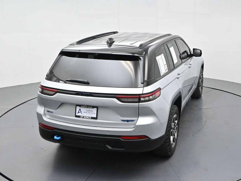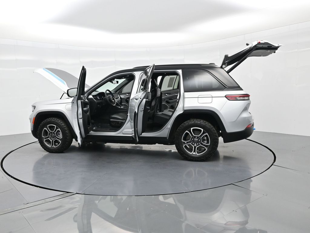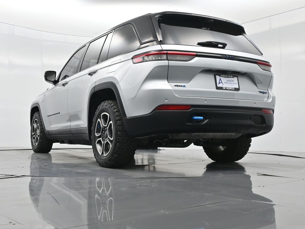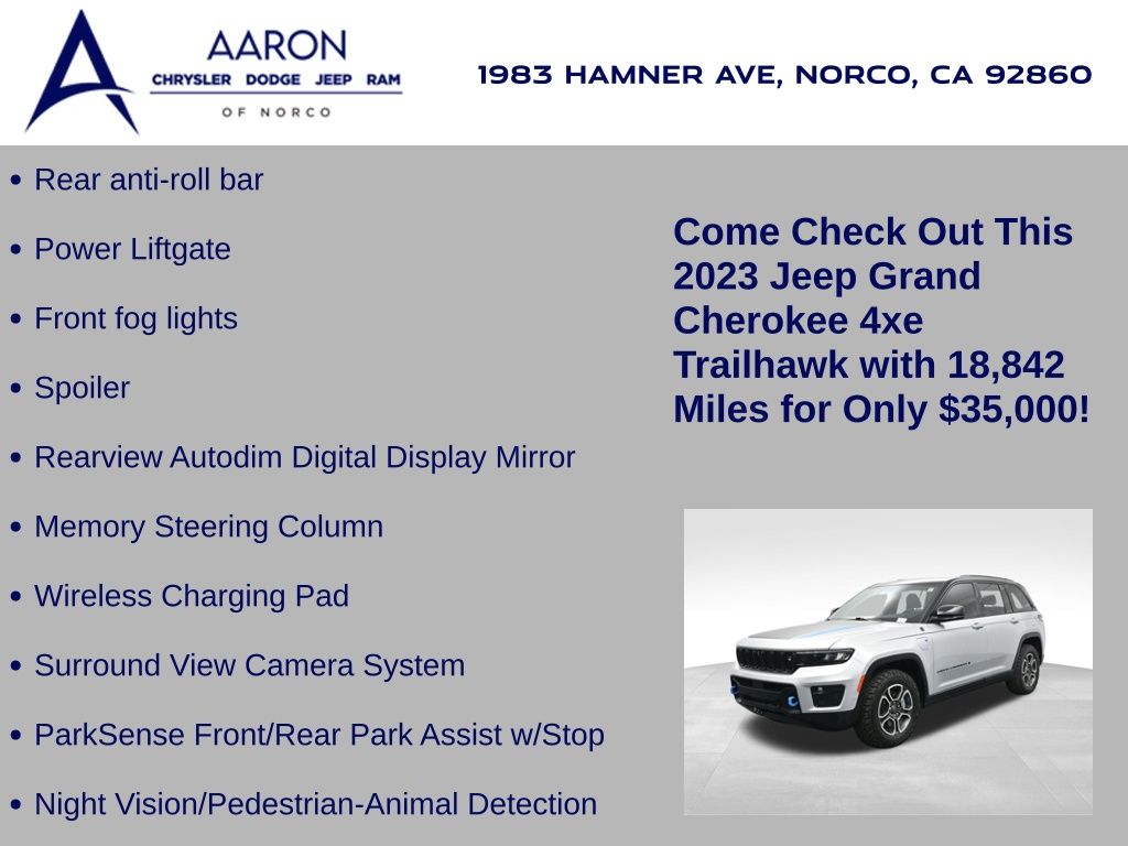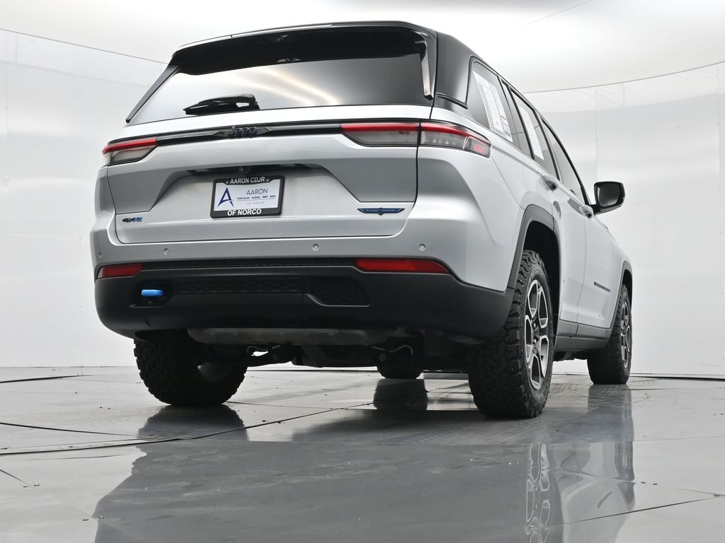 This 2023 Jeep Grand Cherokee Trailhawk 4xe in striking Silver Zynith is the ultimate combination of rugged off-road capability, premium comfort, and advanced plug-in hybrid technology. Powered by a 2.0L DOHC turbocharged PHEV engine paired with an 8-speed automatic transmission and Jeeps legendary Quadra-Drive II 4x4 system, it delivers impressive torque, confident all-terrain performance, and the efficiency of electric-only driving for short trips. The Trailhawk trim is purpose-built for adventure, featuring front disconnecting sway bar, Selec-Terrain traction management, Quadra-Lift air suspension, skid plates, red tow hooks, and 265/60R18 all-terrain tires on machined/painted aluminum wheels. Off-road readiness is further enhanced with hill descent control, Selec-Speed control, and Jeeps Trail Rated durability. Inside, the Grand Cherokee Trailhawk pampers with a leather-trimmed interior, ventilated and heated front seats, heated rear seats, heated steering wheel, and a premium McIntosh audio system. The Uconnect 5 NAV system features a massive 10.1-inch display with navigation, Apple CarPlay, Android Auto, wireless charging pad, and a head-up display for key driving information. Additional highlights include a dual-pane panoramic sunroof, remote start, memory settings for the drivers seat and mirrors, adaptive cruise control, blind spot monitoring, rear cross path detection, surround-view camera, and night vision with pedestrian and animal detection. With only 18,842 miles, a clean 1-owner CARFAX history, and regular maintenance, this Trailhawk 4xe is in excellent condition and still under factory warranty. Combining trail-conquering capability, luxury appointments, and hybrid efficiency, this Grand Cherokee Trailhawk 4xe is ready to take you from city streets to remote trails with confidence and comfort. Experience it today!