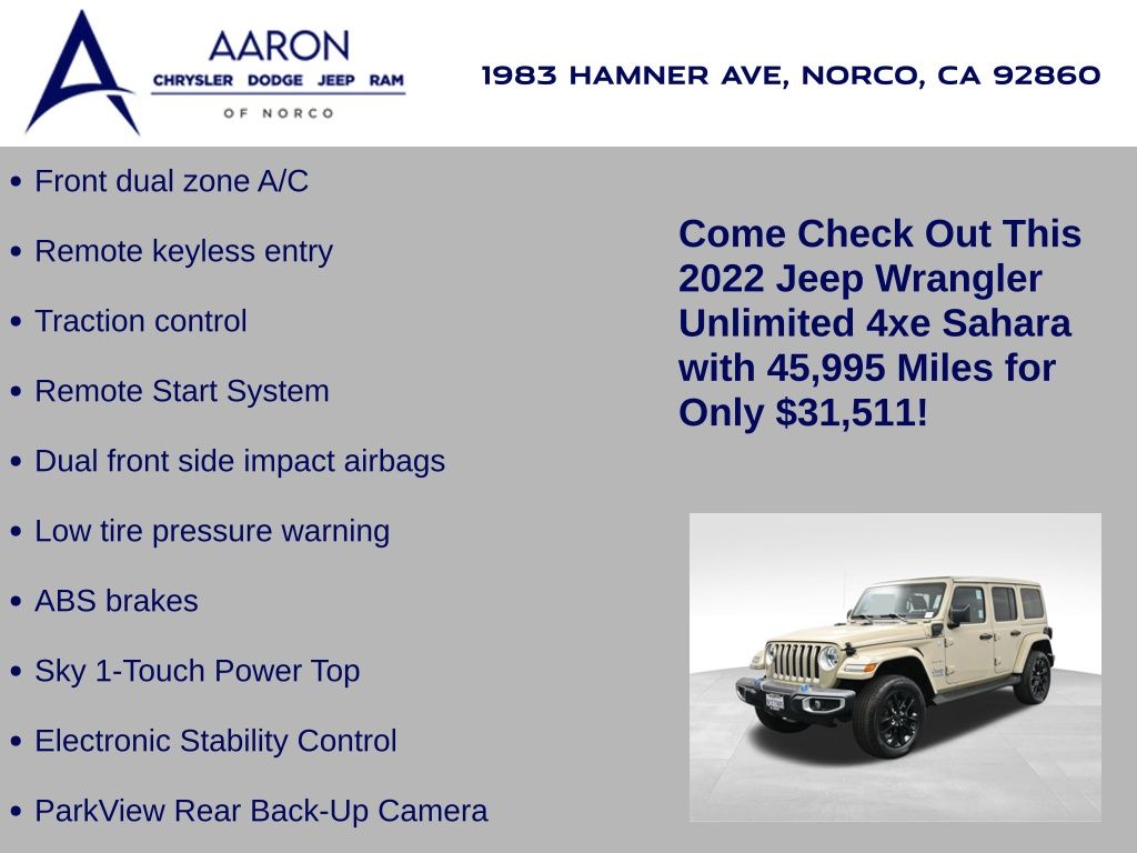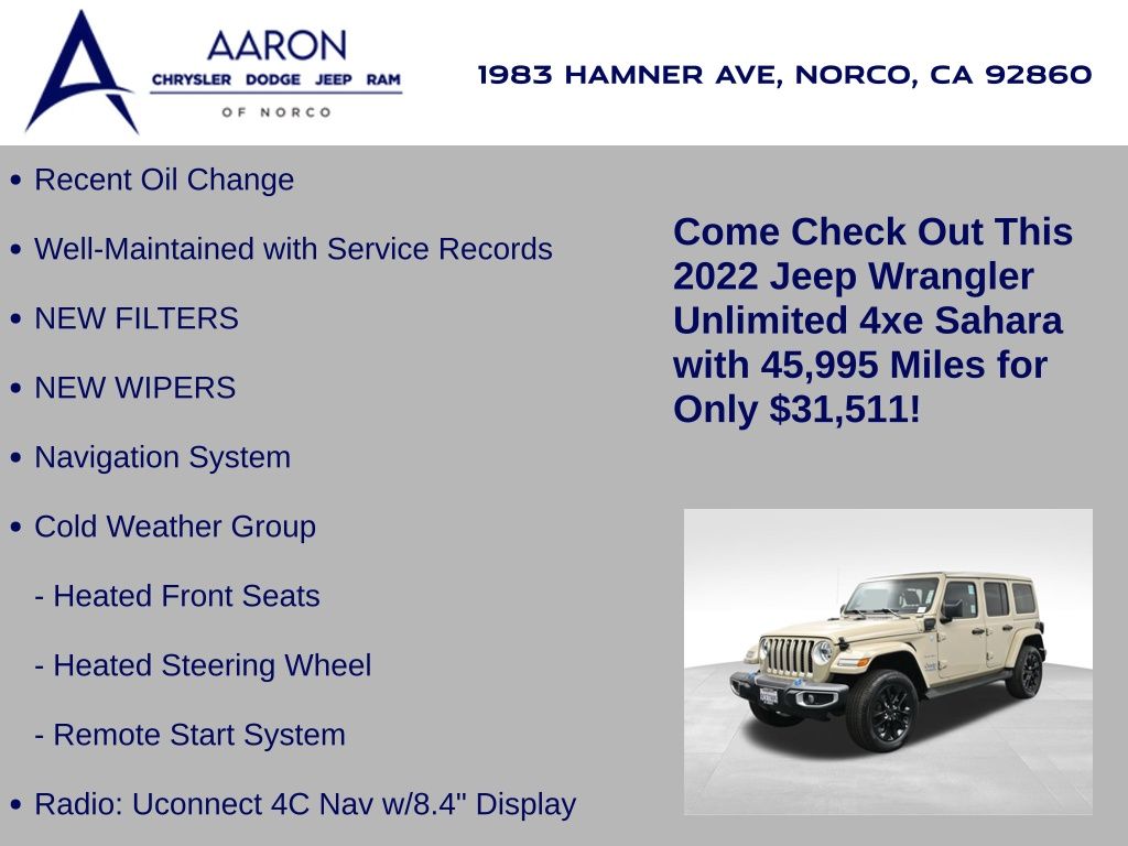 This 2022 Jeep Wrangler Unlimited Sahara 4xe in Limited Edition Gobi Clearcoat offers the perfect blend of legendary off-road capability, open-air freedom, and plug-in hybrid efficiency. Powered by a 2.0L I4 DOHC direct-injection turbo PHEV paired with an 8-speed automatic transmission, it delivers instant torque, confident acceleration, and the ability to drive on electric power alone for short trips, while maintaining the go-anywhere capability Jeep is known for. The 4xe system features a 17.3 kWh battery with Level 1 and Level 2 charging capability, providing flexibility for both daily commuting and adventure travel. Equipped with the Quick Order Package 29P, this Sahara 4xe includes premium features like an 8.4-inch Uconnect navigation system, leather-trimmed seats, body-color fender flares, Sky One-Touch power top, premium LED lighting, and 20-inch fully painted aluminum wheels wrapped in all-season tires. Off-road readiness comes from Jeeps Command-Trac 4x4 system, heavy-duty suspension, skid plates, tow hooks, and advanced driver aids like the ParkSense rear park assist system, blind spot monitoring, and forward collision warning. Inside, the Sahara 4xe offers a refined yet functional cabin with heated front seats, heated steering wheel, dual-zone climate control, Alpine premium audio, Apple CarPlay, Android Auto, multiple USB ports, and ample storage options. Safety features include a ParkView rear backup camera, advanced multistage airbags, stability control, and trailer sway damping. With 45,995 miles and a clean 1-owner CARFAX history, this Wrangler has been well maintained and is ready for its next adventure. Combining the efficiency of a plug-in hybrid with the unmatched capability and iconic design of the Wrangler, this Sahara 4xe is equally at home on city streets or rugged trails. Experience the future of off-road freedom today.