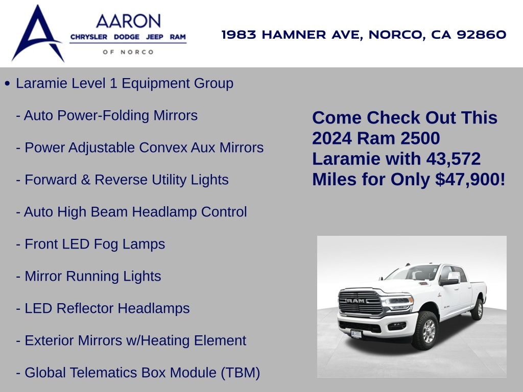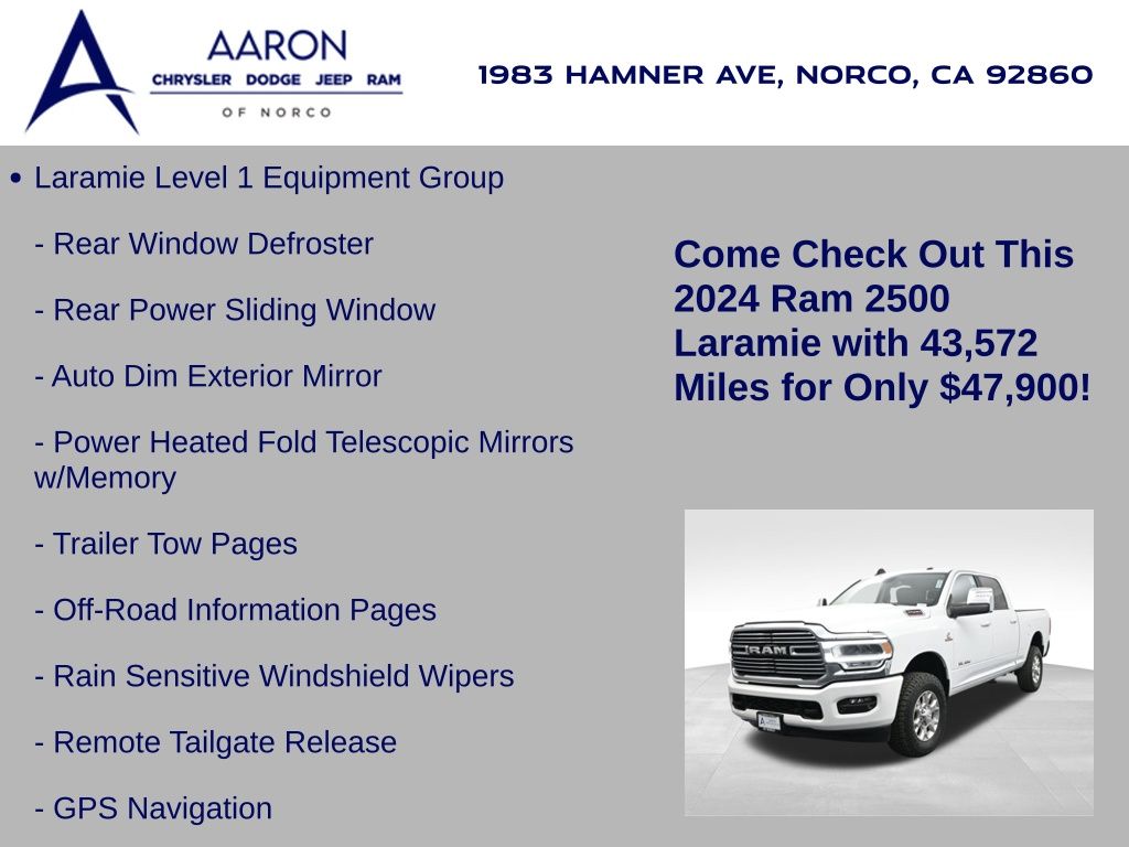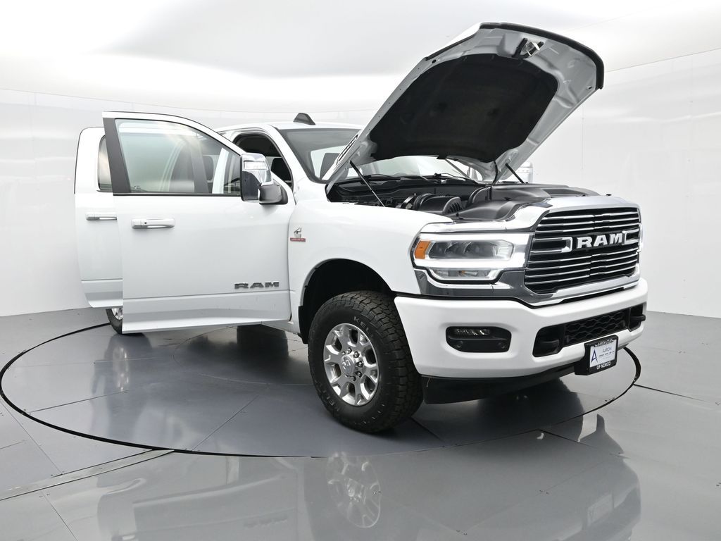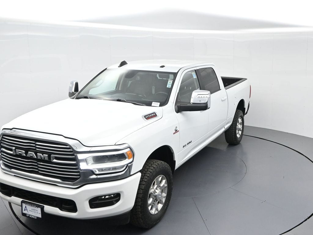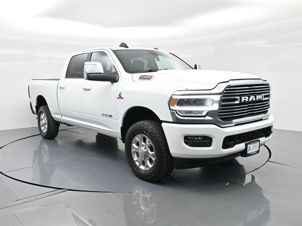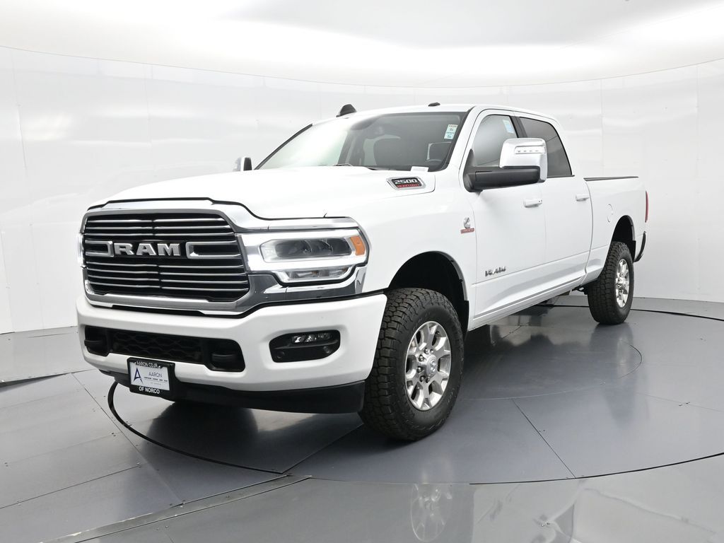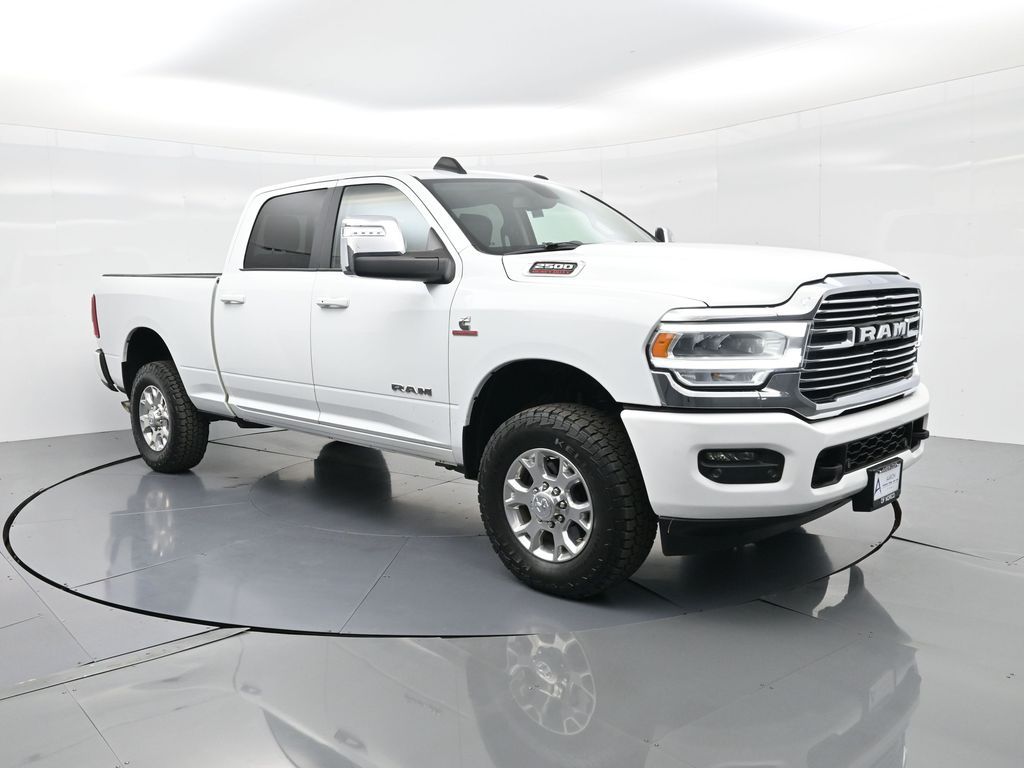 This 2024 Ram 2500 Laramie Crew Cab 4x4 in Bright White Clearcoat is a heavy-duty pickup that blends uncompromising capability with refined comfort and advanced technology. Under the hood, the legendary 6.7L Cummins Turbo Diesel I6 engine paired with a 6-speed automatic transmission delivers immense torque for towing and hauling, supported by a Class V receiver hitch, integrated trailer brake controller, and trailer reverse guidance for confident handling of large loads. The 4x4 drivetrain, anti-spin rear differential, and HD suspension with front and rear stabilizer bars ensure traction and stability in all conditions. The Laramie trim exudes style and functionality with chrome bumpers and grille, LED lighting, tow hooks, power-folding trailer tow mirrors with memory, and 18-inch polished aluminum wheels wrapped in LT275/70R18 all-terrain tires. Inside, the cabin offers heated and ventilated leather-trimmed front seats, heated rear seats, a heated leather-wrapped steering wheel, dual-zone automatic climate control, power-adjustable pedals with memory, and a power driver seat with lumbar support. The Uconnect 12-inch touchscreen infotainment system includes Apple CarPlay, Android Auto, Bluetooth, navigation, and premium Alpine audio. Convenience is enhanced with remote start, keyless enter n go, multiple USB and 115V outlets, and abundant storage options, including rear under-seat compartments. Safety features include ParkSense front and rear park assist, blind spot monitoring with cross-path detection, and a rear backup camera. With 43,572 miles and a clean 1-owner CARFAX history, this Laramie is well-maintained and still within factory coverage. Perfect for both work and leisure, this Ram 2500 offers the strength and dependability to handle demanding jobs while surrounding you with comfort and premium features. Experience the unmatched blend of capability and luxury today!