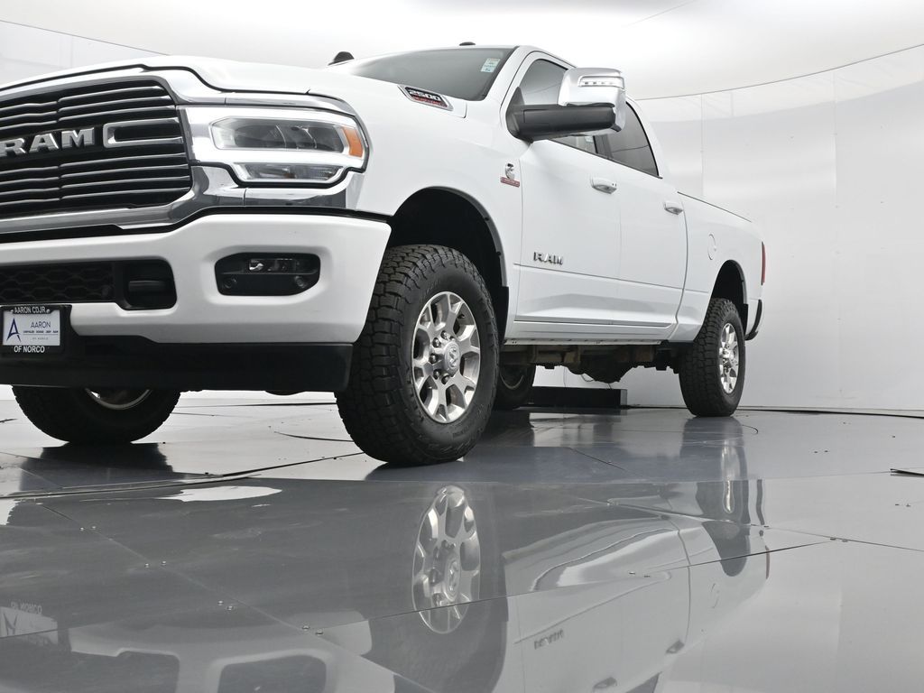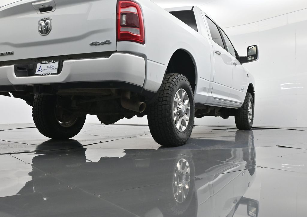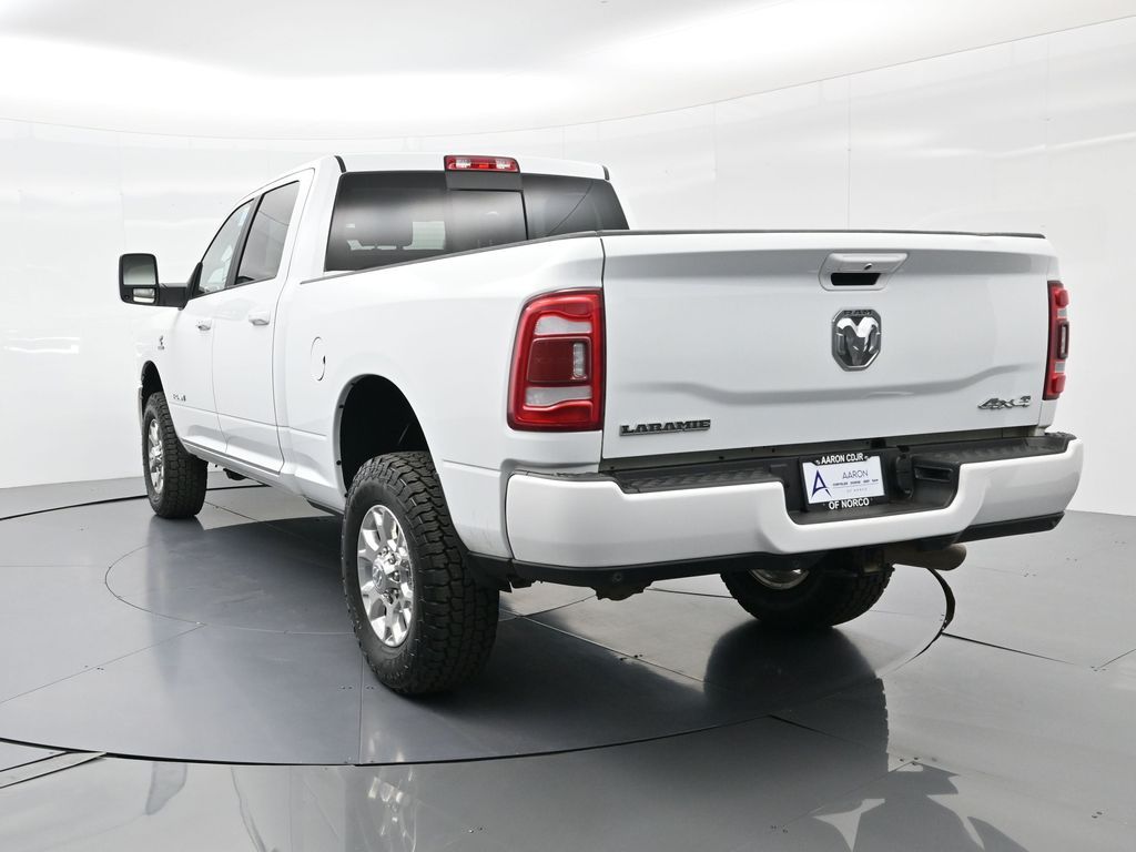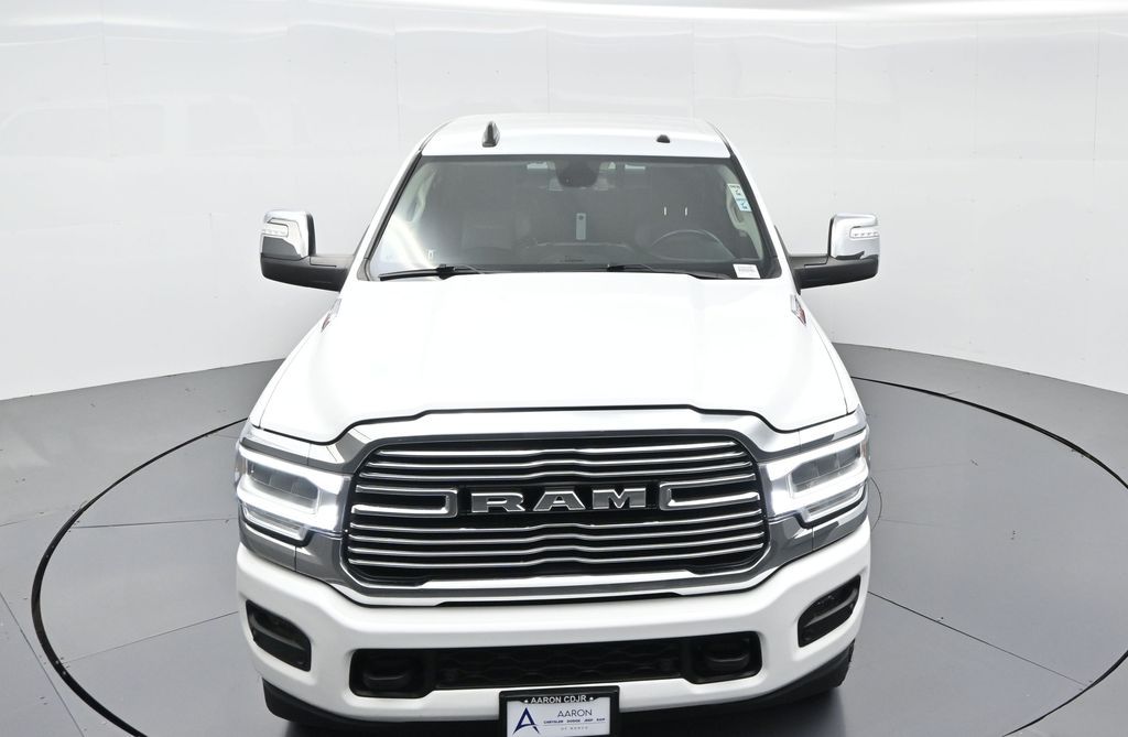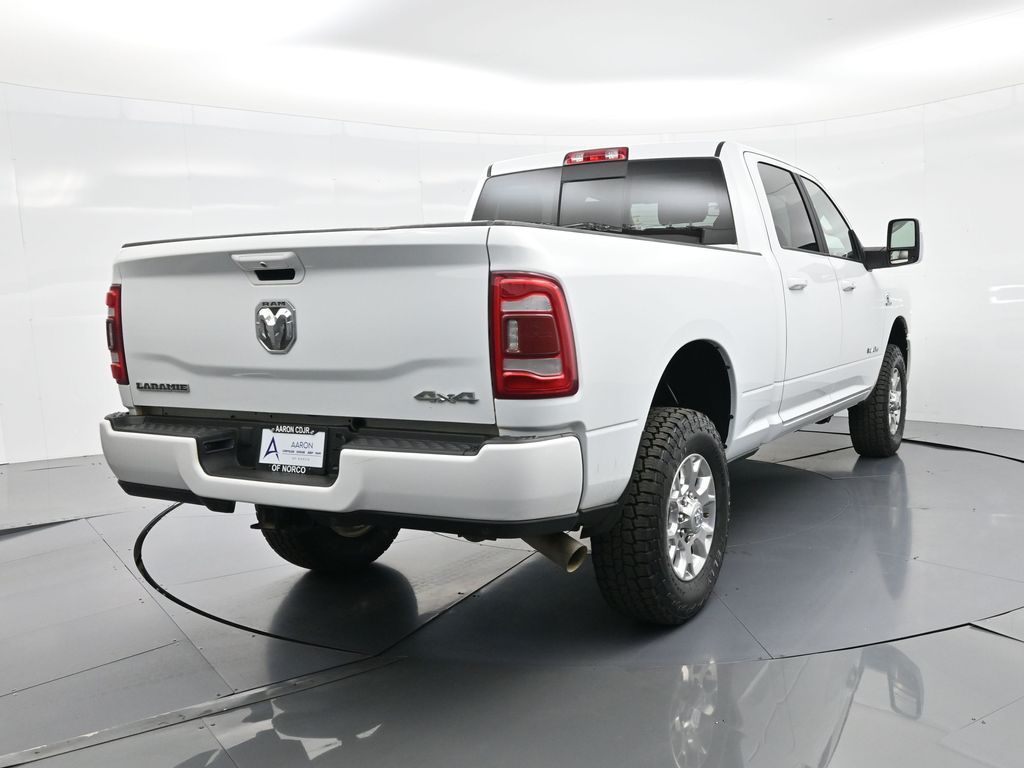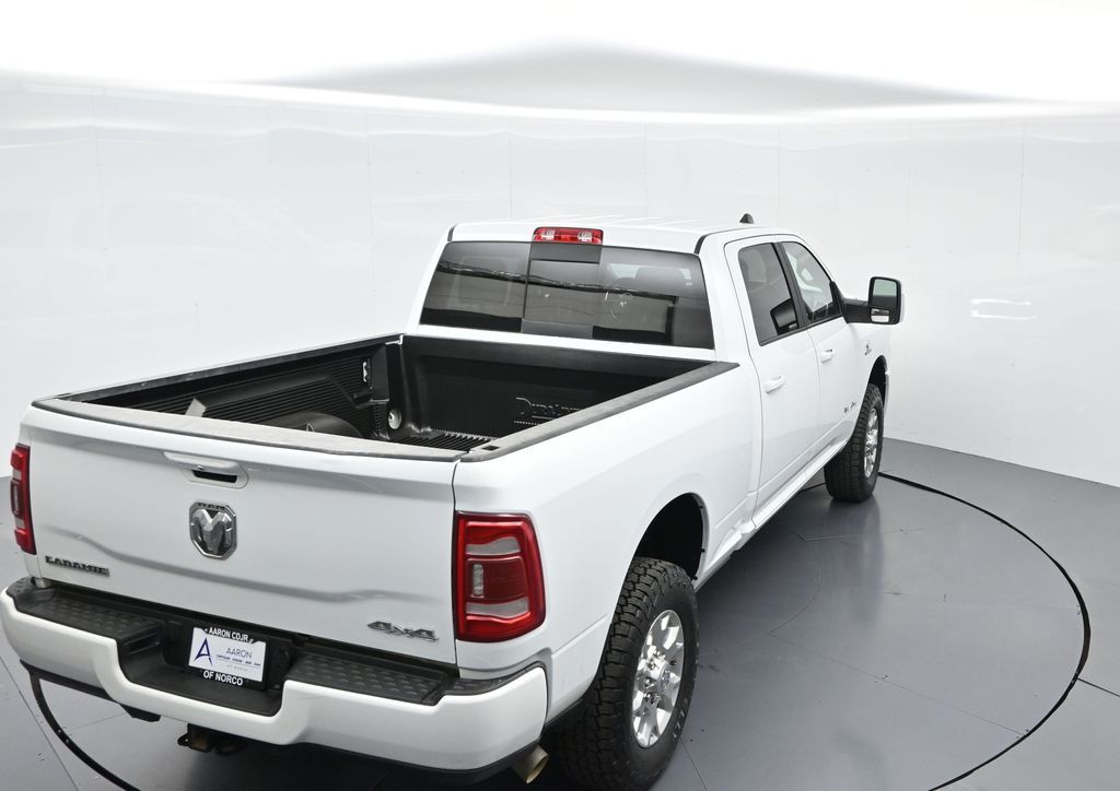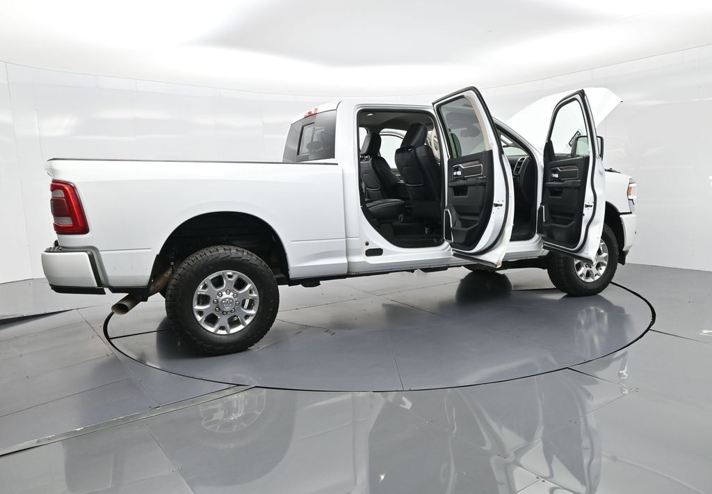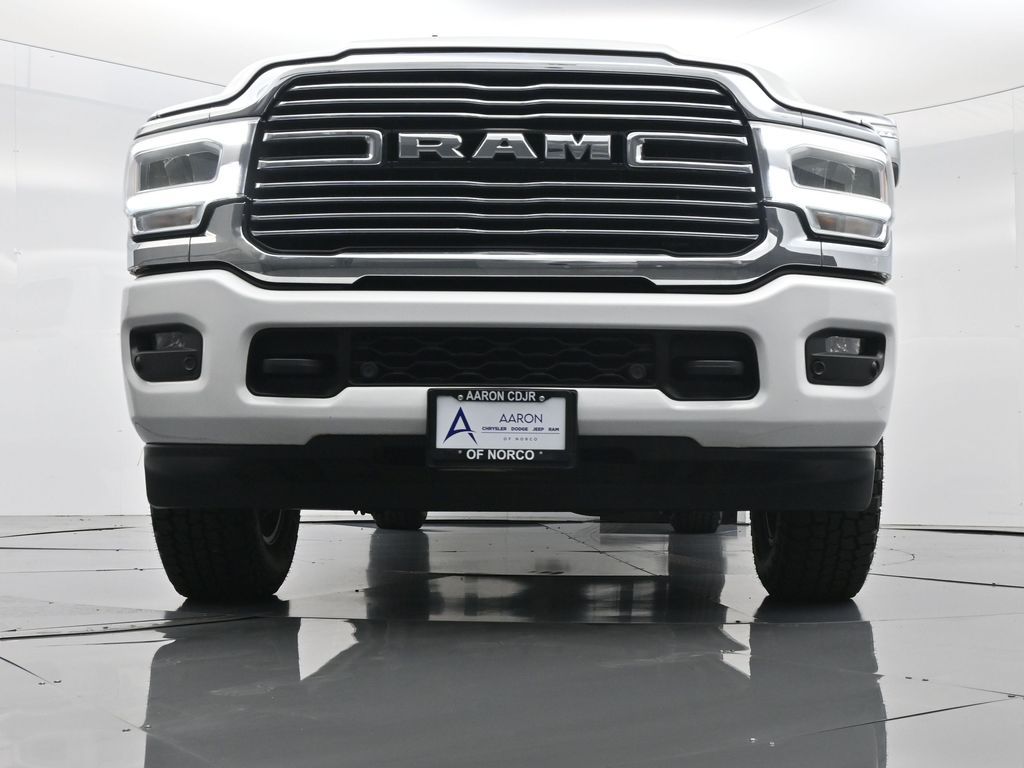 This 2024 Ram 2500 Laramie Crew Cab 4x4 in Bright White Clearcoat is a heavy-duty pickup that blends uncompromising capability with refined comfort and advanced technology. Under the hood, the legendary 6.7L Cummins Turbo Diesel I6 engine paired with a 6-speed automatic transmission delivers immense torque for towing and hauling, supported by a Class V receiver hitch, integrated trailer brake controller, and trailer reverse guidance for confident handling of large loads. The 4x4 drivetrain, anti-spin rear differential, and HD suspension with front and rear stabilizer bars ensure traction and stability in all conditions. The Laramie trim exudes style and functionality with chrome bumpers and grille, LED lighting, tow hooks, power-folding trailer tow mirrors with memory, and 18-inch polished aluminum wheels wrapped in LT275/70R18 all-terrain tires. Inside, the cabin offers heated and ventilated leather-trimmed front seats, heated rear seats, a heated leather-wrapped steering wheel, dual-zone automatic climate control, power-adjustable pedals with memory, and a power driver seat with lumbar support. The Uconnect 12-inch touchscreen infotainment system includes Apple CarPlay, Android Auto, Bluetooth, navigation, and premium Alpine audio. Convenience is enhanced with remote start, keyless enter n go, multiple USB and 115V outlets, and abundant storage options, including rear under-seat compartments. Safety features include ParkSense front and rear park assist, blind spot monitoring with cross-path detection, and a rear backup camera. With 43,572 miles and a clean 1-owner CARFAX history, this Laramie is well-maintained and still within factory coverage. Perfect for both work and leisure, this Ram 2500 offers the strength and dependability to handle demanding jobs while surrounding you with comfort and premium features. Experience the unmatched blend of capability and luxury today!