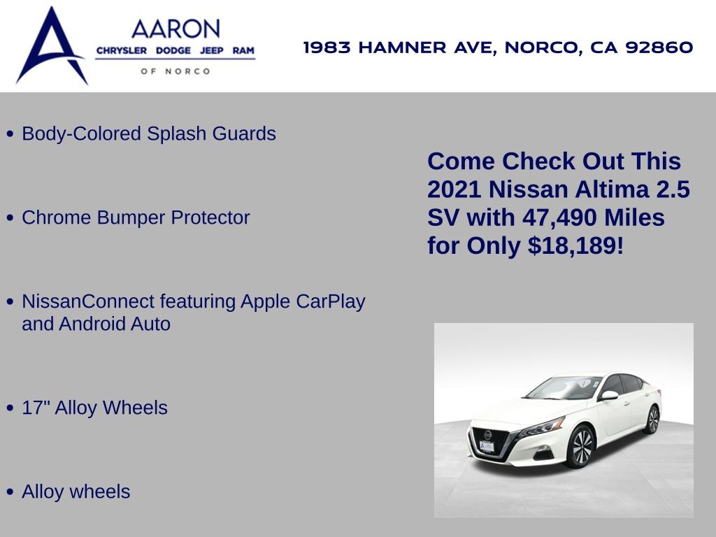 Enjoy confident driving, advanced safety, and impressive efficiency in this well-equipped 2021 Nissan Altima 2.5 SV, with 47,490 miles and finished in a striking Pearl White TriCoat exterior over a Charcoal interior. Powered by a 2.5-liter DOHC 16-valve 4-cylinder engine mated to Nissan's Xtronic CVT transmission, this Altima offers smooth performance and outstanding fuel economyearning an EPA-estimated 27 MPG city and 37 MPG highway. Designed with comfort and technology in mind, this SV trim includes an 8-way power driver seat, dual-zone automatic climate control, 60/40 split-fold rear seats, and a power sliding moonroof. Stay connected with NissanConnect featuring Apple CarPlay and Android Auto, SiriusXM radio, Bluetooth hands-free calling, and an intuitive 8-inch multi-touch color display. Safety is a top priority, with Nissans Safety Shield 360 system offering features like Blind Spot Warning, Rear Cross Traffic Alert, Lane Departure Warning, Automatic Emergency Braking with Pedestrian Detection, Rear Automatic Braking, and High Beam Assist. All working together to give you peace of mind. Additional highlights include Intelligent Forward Collision Warning, a 7-inch Advanced Drive-Assist Display, remote engine start with intelligent climate control, rear sonar system, and LED projector headlights with signature DRLs. Recent maintenance includes a fresh oil change, brand-new cabin and engine air filters, and new wiper blades. With a clean Carfax history, consistent oil change records, and a strong service pedigree, this Altima is ready for daily commuting, long-distance travel, or weekend getaways. Don't miss your opportunity to own a well-maintained, reliable, and efficient midsize sedan. Visit our dealership today to test drive this 2021 Nissan Altima SV and see why it remains one of the most trusted names in its class.