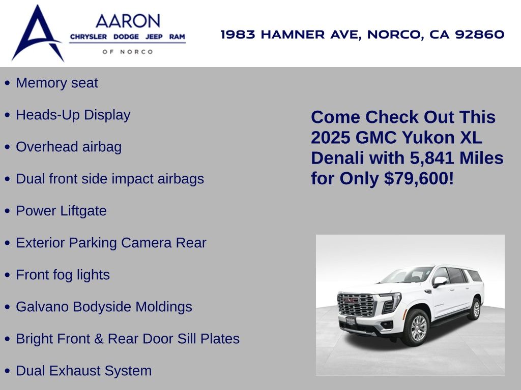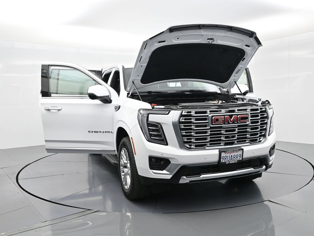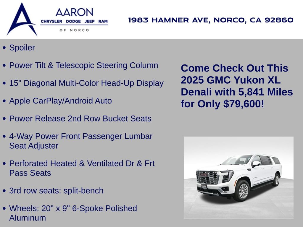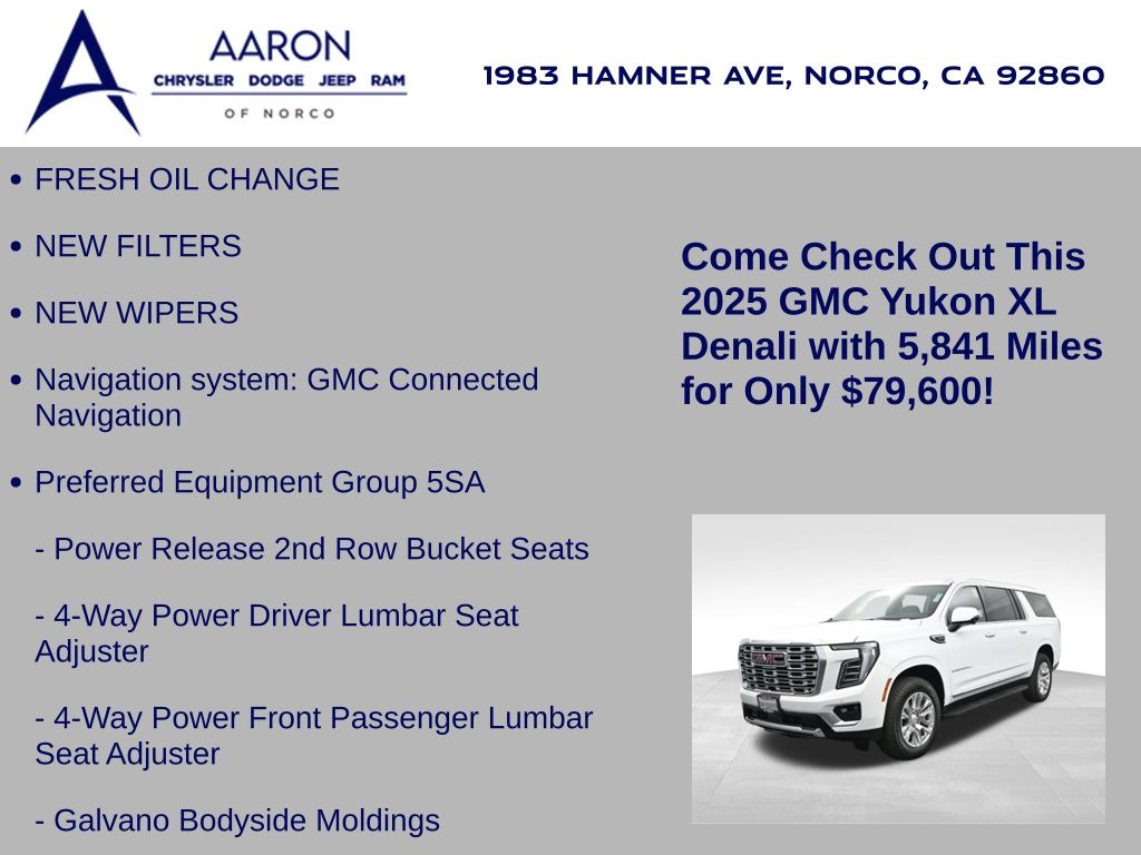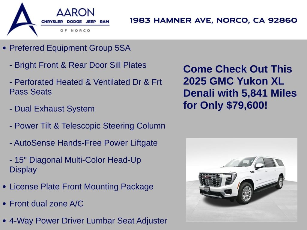 This 2025 GMC Yukon XL Denali 4WD in Summit White delivers full-size luxury, cutting-edge technology, and commanding performance, making it an exceptional choice for families and professionals who demand the best in comfort and capability. Powered by a robust 6.2L EcoTec3 V8 paired with a smooth-shifting 10-speed automatic transmission, it offers confident acceleration and towing power, while the advanced Magnetic Ride Control and mechanical limited-slip differential ensure a composed, stable ride. The exterior exudes sophistication with signature Denali chrome accents, 20-inch 6-spoke aluminum wheels, LED headlamps and taillamps, LED fog lamps, and dual exhaust with polished tips. Inside, the spacious Jet Black interior is appointed with heated and ventilated front bucket seats, heated second-row captains chairs, premium perforated leather seating surfaces, and a power-folding third-row bench for versatile cargo and passenger arrangements. Technology takes center stage with a massive 16.9-inch diagonal GMC Premium Infotainment touchscreen featuring Google Built-In, navigation, wireless Apple CarPlay, wireless Android Auto, a 10-speaker Bose audio system, head-up display, and wireless charging. Safety and driver assistance are top priorities, with Enhanced Automatic Emergency Braking, Forward Collision Alert, Front Pedestrian Braking, HD Surround Vision, Lane Keep Assist, Rear Cross Traffic Braking, and adaptive cruise control. Convenience features include a hands-free power liftgate, remote start, power-sliding center console, multiple USB and 120V outlets, and tri-zone automatic climate control. With only 5,841 miles and a clean CARFAX 1-owner history, this Yukon XL Denali is virtually new and still under factory warranty. Offering exceptional towing capability, unmatched interior space, and premium refinement, this SUV is ready to elevate every journey. Experience the pinnacle of GMC craftsmanship and performance today.