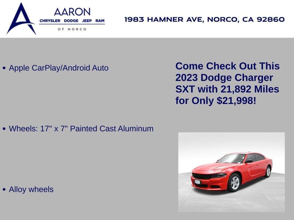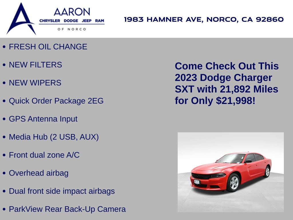 This 2023 Dodge Charger SXT, finished in striking Torred Clearcoat complemented by an elegant black interior, effortlessly combines iconic American muscle styling with everyday practicality and cutting-edge technology. With only 21,892 miles, priced attractively below KBB Fair Purchase Price, this sedan delivers both exhilarating performance and remarkable value. Powered by a robust 3.6L V6 24-valve VVT engine paired with an efficient 8-speed automatic transmission, it achieves impressive fuel economy ratings of 19 MPG city and 30 MPG highway, ideal for daily commuting or spirited weekend drives. The Charger SXT is loaded with premium amenities, including the Quick Order Package 2EG and an impressive 8.4-inch touchscreen Uconnect 4C infotainment system that integrates wireless Apple CarPlay, Android Auto, Bluetooth connectivity, 4G LTE Wi-Fi hotspot, SiriusXM Guardian trial, and HD radio, ensuring seamless connectivity and entertainment. Comfort is prioritized with houndstooth cloth sport seats, leather-wrapped steering wheel, dual-zone automatic climate control, and power driver's seat. Safety features include ParkView back-up camera, ParkSense rear parking sensors, blind-spot detection, and numerous airbags, all contributing to a confident and secure driving experience. Enhanced exterior aesthetics feature gloss-black painted aluminum wheels, auto-dimming mirrors, LED brake lights, and perimeter approach lights, which turn heads at every corner. Experience precise handling with the sport-tuned suspension, electric power-assist steering, and gas-pressurized shock absorbers, ensuring every drive is responsive and smooth. With its distinctive design, cutting-edge tech, and spirited performance, this meticulously maintained, accident-free, 1-owner Charger SXT represents a superb choice for enthusiasts seeking style, reliability, and everyday practicality. Visit us today and experience this remarkable sedan firsthand.