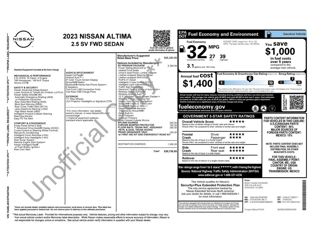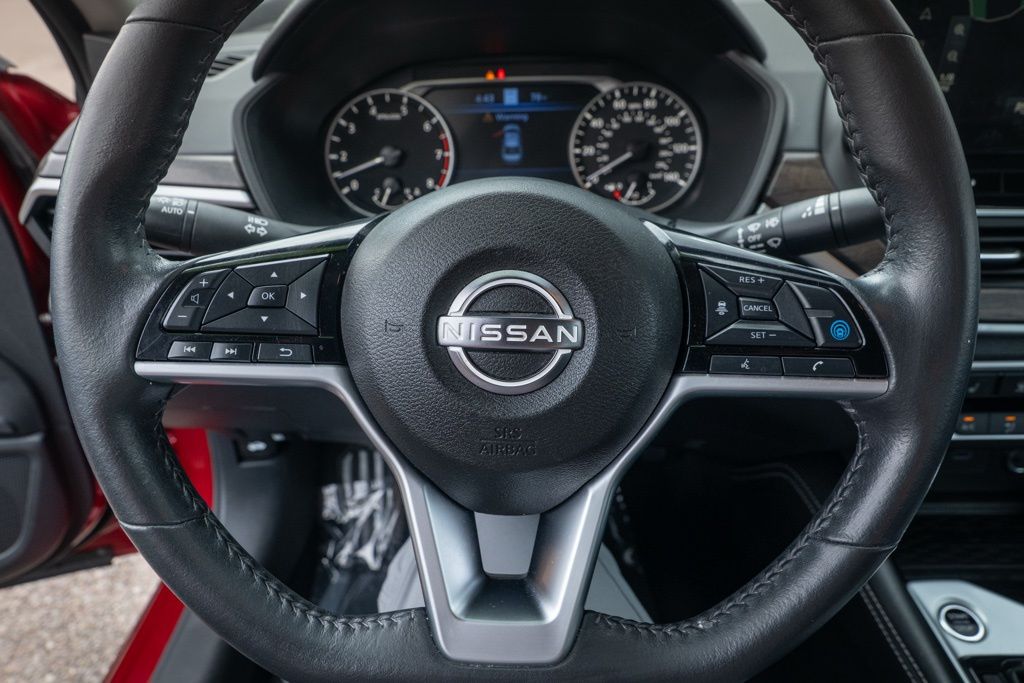 Scarlet Ember Tintcoat 2023 Nissan Altima 2.5 SV FWD CVT with Xtronic 2.5L 4-Cylinder DOHC 16V CVT with Xtronic, Active Ride Control (ARC), Blind Spot Warning, Body-Colored Outside Mirrors, Electronic Parking Brake w/Auto-Hold, Exhaust Finishers, Heated Front Seats, Intelligent Cruise Control w/Full Spd Range & Hold, Intelligent Lane Intervention (I-LI), Intelligent Trace Control (I-TC), Leather Shift Knob, Leather Steering Wheel, NissanConnect, Premium Interior Finishers, ProPILOT Assist, Rear Parking Sensors, Single Panel Moonroof, Steering Assist, SV Premium Package, Traffic Sign Recognition.Odometer is 14565 miles below market average! 27/39 City/Highway MPG