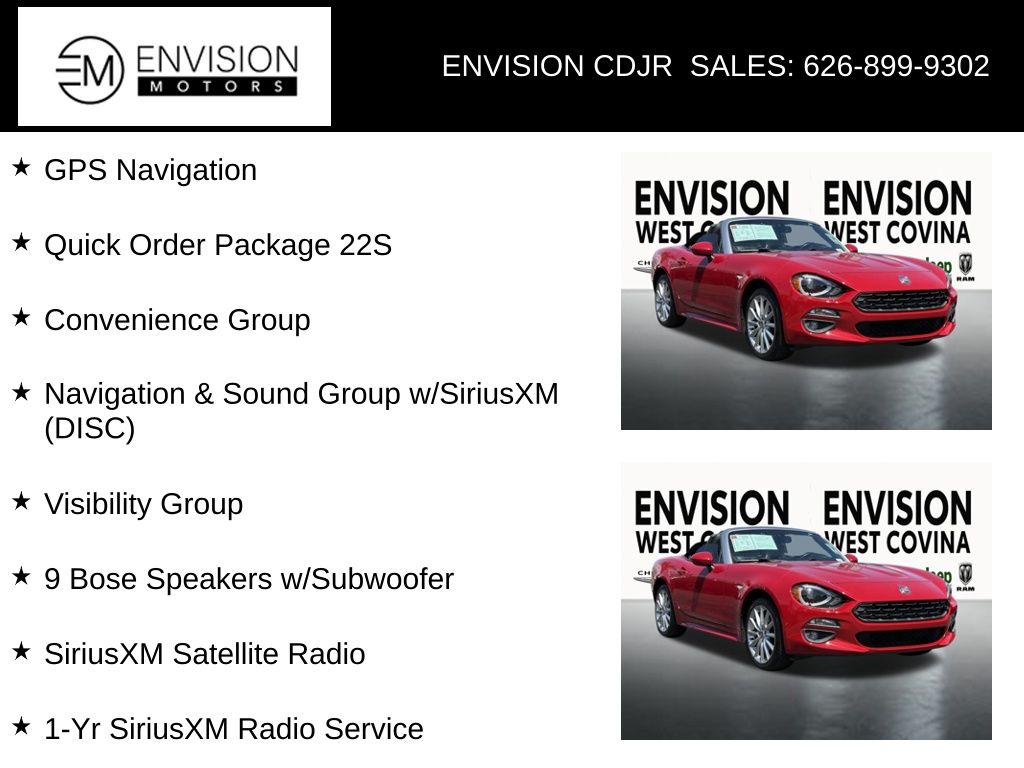 WE SPECIALIZE IN ALL CREDIT PROFILES! See what we can do for you! Call to find out (626) 899-9302.Odometer is 5424 miles below market average! 1-Yr SiriusXM Radio Service, 9 Bose Speakers w/Subwoofer, Adaptive Front Headlamps, Auto-Dimming Exterior Mirrors, Automatic Headlamp Leveling System, Blind Spot & Cross Path Detection, Convenience Group, For More Info, Call 800-643-2112, GPS Navigation, Headlamp Washer, Heated Exterior Mirrors, LED Daytime Running Lamps, LED Headlamps, Navigation & Sound Group w/SiriusXM (DISC), ParkSense Rear Park Assist System, Quick Order Package 22S, Rear View Auto Dim Interior Mirror, Security Alarm, SiriusXM Satellite Radio, Universal Garage Door Opener, Visibility Group, Wheels: 17" x 7" Premium Silver Aluminum.Red2018 Fiat 124 Spider Lusso RWD 6-Speed Automatic 1.4L I4 16V MultiAir Turbocharged**********All Pricing and Advertised Prices for any/all vehicles offered for sale does not include dealer installed accessories which can be purchased for an additional cost.********** The Factory Rebates may not be available on this vehicle if you elect to take advantage of a Special Alternative APR or Special Lease program. Some Factory Rebates are California Resident specific and may vary for residents of other states. NO sales to Dealers, Brokers or Exporters. For out of state purchase, customers must be present to purchase. If shipping is required, dealership must facilitate; no exceptions. Please contact us for special Multi-Vehicle or Fleet pricing. Prices are plus government fees and taxes, any finance charges, $85 documentary fee, $29 electronic registration fee, any emission testing charge and $1.75 per new tire state tire fee. *** We make every effort to provide accurate information, but please verify before purchasing. Leasing & financing available on approved credit. Trade-ins accepted. Subject to prior sale.