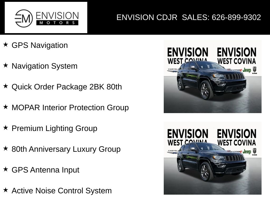 WE SPECIALIZE IN ALL CREDIT PROFILES! See what we can do for you! Call to find out (626) 899-9302.Certified.Odometer is 18317 miles below market average! 4WD, 1-Year SiriusXM Guardian Trial, 4G LTE Wi-Fi Hot Spot, 506 Watt Amplifier, 8.4" Touchscreen Display, 80th Anniversary Luxury Group, Active Noise Control System, Adaptive Cruise Control w/Stop, Advanced Brake Assist, Apple CarPlay, Auto High Beam Headlamp Control, Berber Floor Mats w/80th Anniversary Tag, Bi-Xenon High-Intensity Discharge Headlamps, Black Roof Molding, Body Color Claddings, Body Color Door Handles, Body Color Shark Fin Antenna, Cargo Compartment Cover, Dark Day Light Opening Moldings, Dark Headlamp Bezel Finish, Dark Lens Taillamps, Dual-Pane Panoramic Sunroof, Front Accent/Body Color Fascia, Front LED Fog Lamps, Full Speed FWD Collision Warn Plus, Google Android Auto, GPS Antenna Input, GPS Navigation, Granite Crystal Exterior Accents, Granite Crystal Exterior Badging, Granite Crystal Exterior Mirror Caps, Granite Crystal/Black Grille, HD Radio, Heated Second Row Seats, Integrated Voice Command w/Bluetooth, Jeep 80th Anniversary Badges, Jeep 80th Anniversary Edition, Lane Departure Warning Plus, Leather Trimmed Bucket Seats, Leather Trimmed Bucket Seats (JY), LED Daytime Running Headlamps, LT. Tungsten Interior Accent Stitching, MOPAR Cargo Area Liner, MOPAR Interior Protection Group, MOPAR Slush Mats, Navigation System, Parallel & Perp Park Assist w/Stop, Piano Black/Anod. Gunmetal Interior Accents, Power Tilt/Telescope Steering Column, Premium Alpine Speaker System, Premium Lighting Group, Quick Order Package 2BK 80th, Radio: Uconnect 4C Nav w/8.4" Display, Rain Sensitive Windshield Wipers, Rear Accent/Body Color Fascia, SiriusXM Satellite Radio, SiriusXM Traffic Plus, SiriusXM Travel Link, Ventilated Front Seats, Wheels: 20" x 8.0" Granite Crystal Aluminum.Diamond Black Crystal Pearlcoat2021 Jeep Grand Cherokee 80th Anniversary Edition 4WD 8-Speed Automatic 3.6L V6 24V VVTFCA US LLC Certified Pre-Owned Details: * Warranty Deductible: $100 * Powertrain Limited Warranty: 84 Month/100,000 Mile (whichever comes first) from original in-service date * Vehicle History * Vehicles Up to 75,000 Miles and/or 5 Model Years. 24-Hour Towing & Roadside Assistance, Car Rental Allowance, CARFAX® Vehicle History ReportTM and an Introductory 3-month Subscription to SiriusXM® Satellite Radio & Certified Warranty Upgrades * Limited Warranty: 3 Month/3,000 Mile (whichever comes first) after new car warranty expires or from certified purchase date * Roadside Assistance * Transferable Warranty * 125 Point Inspection**********All Pricing and Advertised Prices for any/all vehicles offered for sale does not include dealer installed accessories which can be purchased for an additional cost.********** The Factory Rebates may not be available on this vehicle if you elect to take advantage of a Special Alternative APR or Special Lease program. Some Factory Rebates are California Resident specific and may vary for residents of other states. NO sales to Dealers, Brokers or Exporters. For out of state purchase, customers must be present to purchase. If shipping is required, dealership must facilitate; no exceptions. Please contact us for special Multi-Vehicle or Fleet pricing. Prices are plus government fees and taxes, any finance charges, $85 documentary fee, $29 electronic registration fee, any emission testing charge and $1.75 per new tire state tire fee. *** We make every effort to provide accurate information, but please verify before purchasing. Leasing & financing available on approved credit. Trade-ins accepted. Subject to prior sale.