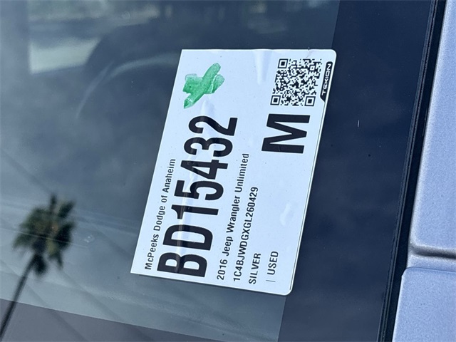 Certified. Odometer is 1827 miles below market average! INTERIOR & EXTERIOR PROFESSIONALLY DETAILED FOR DELIVERY, MCPEEK CHRYSLER DODGE JEEP RAM FAMILY OWNED AND OPERATED SINCE 1961 !!!!!.Billet Silver Metallic Clearcoat 2016 Jeep Wrangler Unlimited Sport 4WD 5-Speed AutomaticCertification Program Details: 3 Month/3,000 mile Extended Care Warranty - Complimentary Carfax Report - 125 Point Safety & Mechanical Inspection by Certified Technician - $500 Emergency Trip Reimbursement - $45/Day Car Rental - $100 "Sign-and-Go" Roadside assistance - 3 Month SiriusXM Subscription (If Equipped)Receive Free lube and oil filter changes for up to 45,000 miles for 3 years!!! McPeek's Dodge of Anahiem 1221 S. Auto Center Drive Anahiem, CA 92806 714-262-4902.