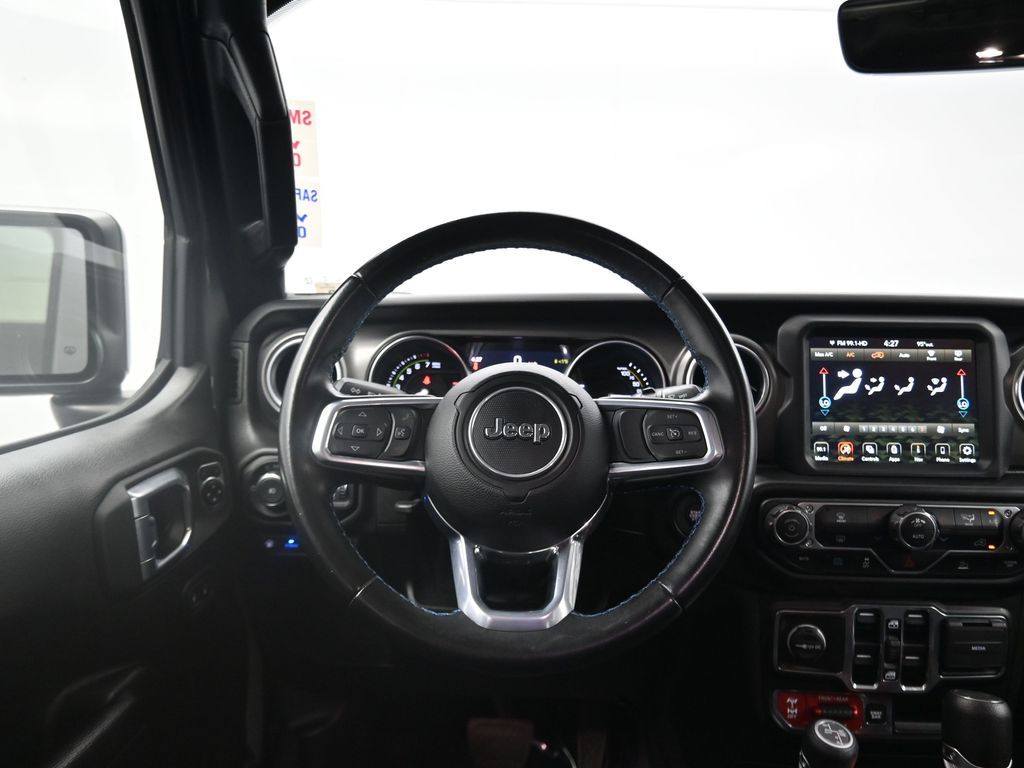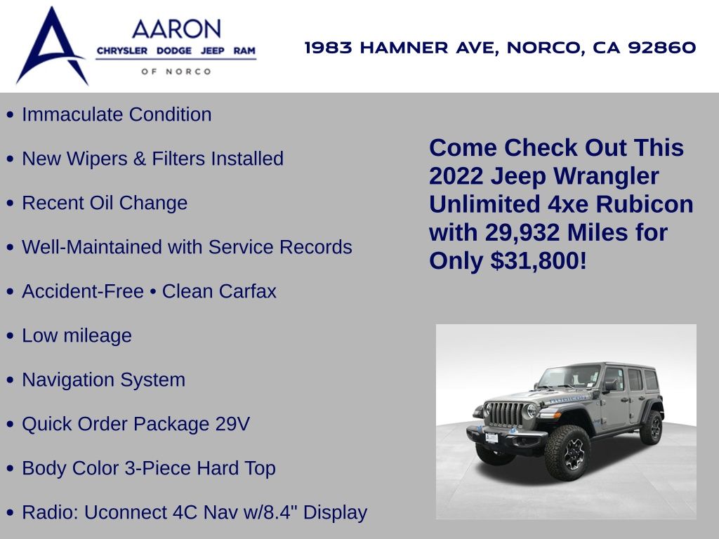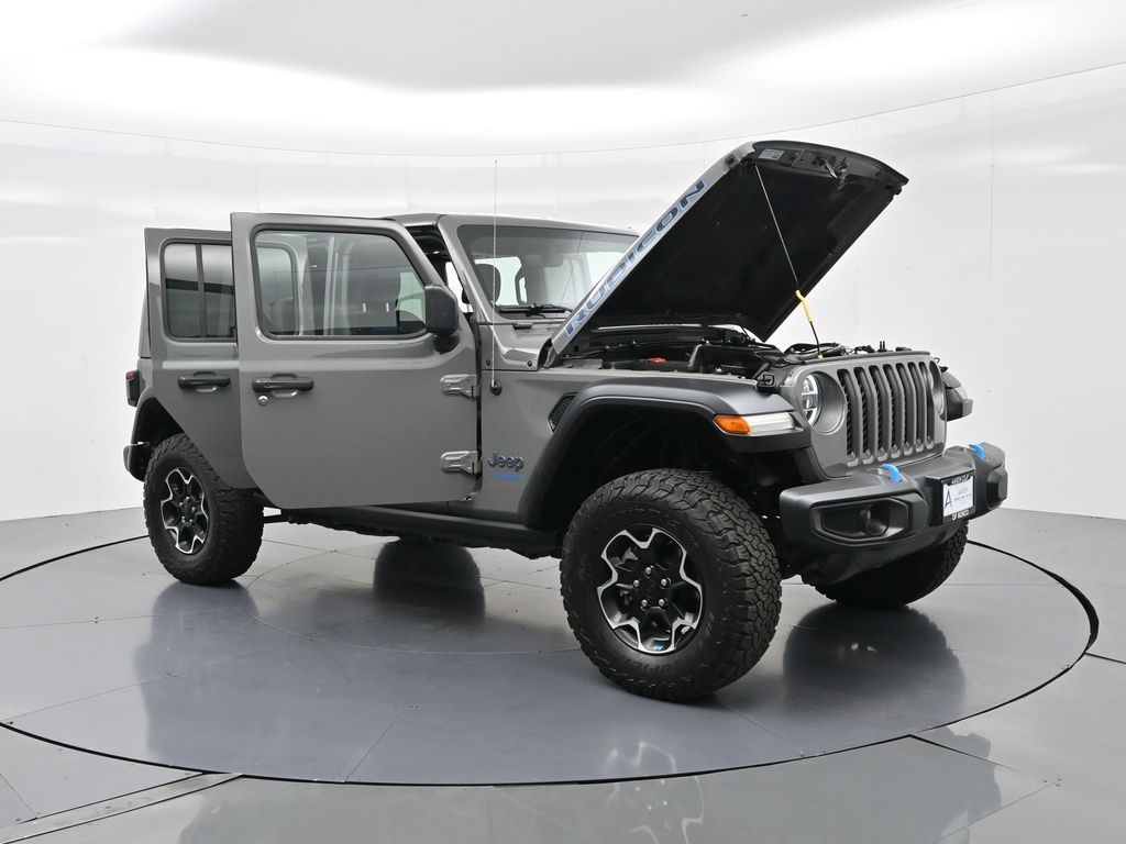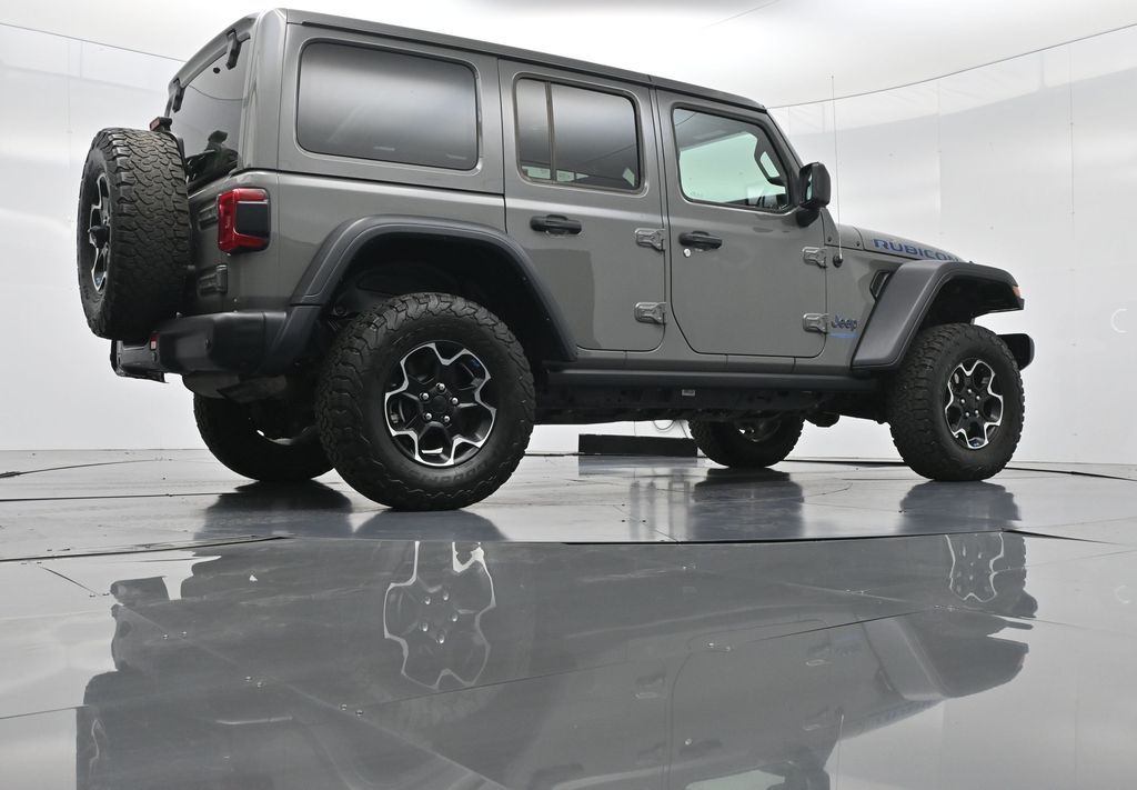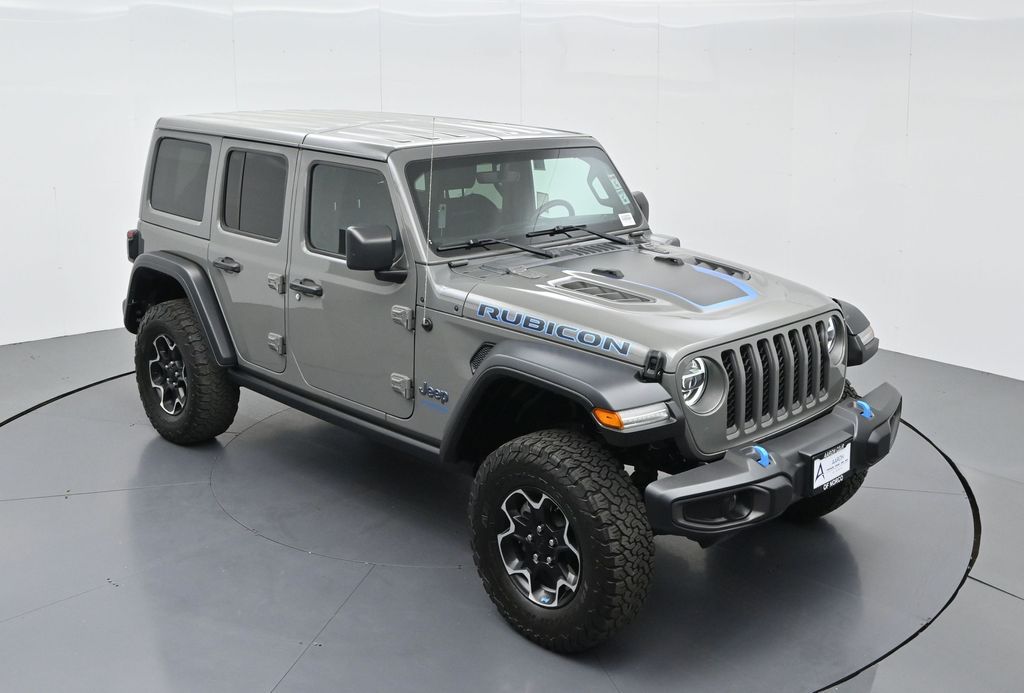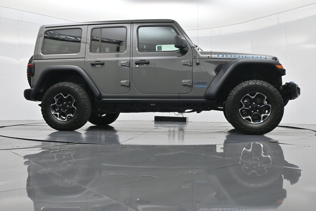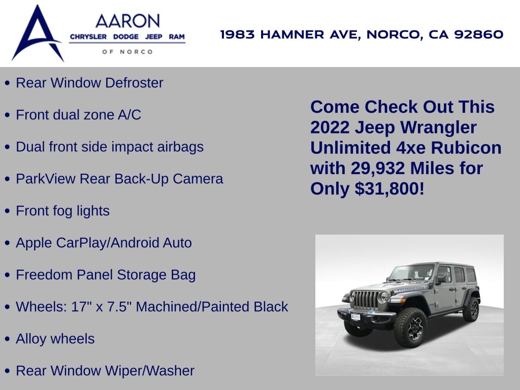 This 2022 Jeep Wrangler Unlimited Rubicon 4xe in eye-catching Sting-Gray Clearcoat offers legendary off-road capability combined with modern plug-in hybrid efficiency, making it one of the most versatile SUVs on the market. Powered by a 2.0L DOHC turbocharged PHEV engine paired with an 8-speed automatic transmission and full-time 4WD, it delivers instant torque and a refined ride, while offering the flexibility of electric-only driving for short trips and hybrid mode for extended adventures. The Rubicon trim ensures maximum trail readiness with Tru-Lok electronic locking differentials, a Rock-Trac heavy-duty full-time transfer case, electronic front sway bar disconnect, skid plates, performance suspension, and LT285/70R17 off-road tires on 17-inch machined/pained black alloy wheels. Exterior highlights include a black three-piece Freedom hardtop, steel bumpers, LED headlamps and fog lamps, rock rails, and premium off-road accents. Inside, youll find a comfortable, tech-forward cabin with premium cloth low-back bucket seats, an 8.4-inch Uconnect NAV infotainment system with Apple CarPlay, Android Auto, Bluetooth, and a premium Alpine audio system. The cabin also offers multiple USB ports, a 115V outlet, push-button start, dual-zone automatic climate control, a leather-wrapped steering wheel, and ample storage with seatback pockets and a rear Freedom panel bag. Safety and convenience are enhanced with a ParkView rear backup camera, ParkSense rear park assist, trailer sway control, blind spot monitoring, and keyless entry. The 4xes PHEV system features two lithium-ion battery packs with a combined 17.3 kWh capacity, allowing an estimated electric range of up to 21 miles, and charges easily via Level 1 or Level 2 charging. With only 29,932 miles, a clean 1-owner CARFAX history, and regular maintenance, this Wrangler Rubicon 4xe is ready for both rugged trails and efficient daily driving. If you're looking for a vehicle that can conquer extreme off-road conditions while saving fuel and lowering emissions, this Rubicon 4xe delivers uncompromising Jeep capability with modern hybrid innovation. Come experience it today.