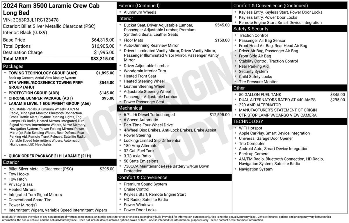 Elevate your driving experience with this exceptional 2024 Ram 3500 Laramie. Boasting a powerful 6.7L I6 Diesel Turbocharged Cummins engine, this truck is engineered to conquer any challenge. Paired with a robust Aisin 6-speed automatic transmission and the confidence of 4-wheel drive, this Ram 3500 is ready to tackle any terrain or towing task with ease.Highlighted features include:• 6.7L I-6 Diesel Turbocharged (Cummins) (HO) Engine• Towing Technology Group with Surround View Camera System• 5th Wheel/Gooseneck Towing Prep Group• Black, Leather-Trimmed Bucket Seats• 50-Gallon Fuel Tank• Dual Alternators Rated at 440 Amps• Protection Group with Transfer Case Skid Plate Shield• Chrome Bumper PackageThis Laramie trim level offers an unparalleled blend of capability and comfort. The spacious cabin features premium leather seating, power-adjustable pedals, and a heated steering wheel, ensuring a luxurious driving experience. The advanced Uconnect 5 infotainment system with a 12-inch touchscreen display keeps you connected and entertained, while the surround-view camera system provides exceptional visibility for effortless maneuvering.Whether you're hauling heavy loads, towing a trailer, or simply seeking a commanding presence on the road, this 2024 Ram 3500 Laramie is the ultimate workhorse. With its impressive towing capacity, rugged construction, and exceptional attention to detail, this truck is the perfect companion for your most demanding tasks.Discover the uncompromising power and refined comfort of the 2024 Ram 3500 Laramie. Schedule a test drive today and experience the difference for yourself. We're confident this exceptional vehicle will exceed your expectations and become an indispensable part of your lifestyle.