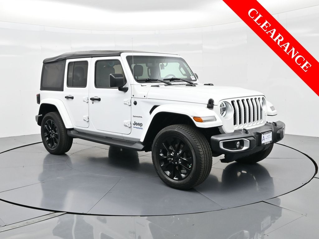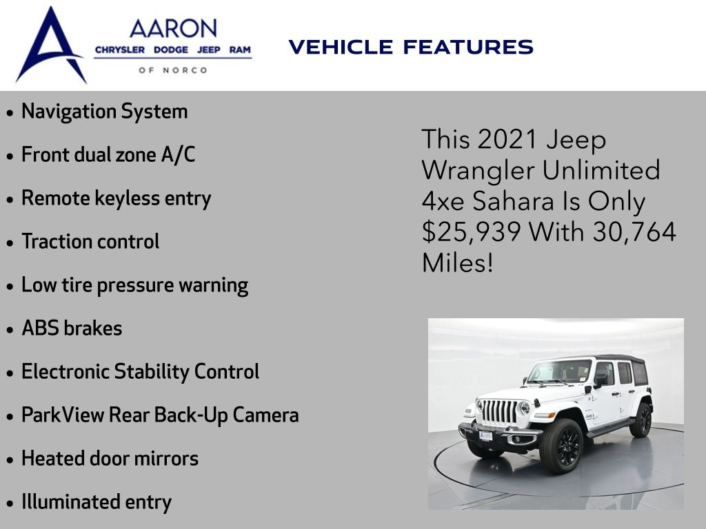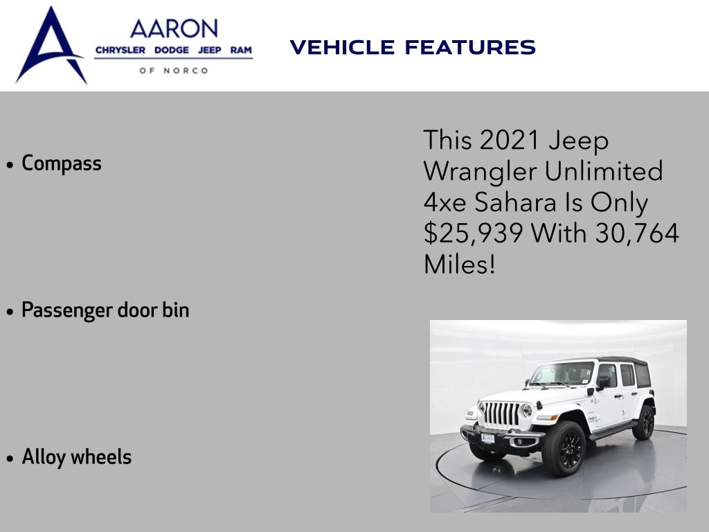 2021 Jeep Wrangler Unlimited Sahara 4xe, Customer Preferred Package 29P, 4x4 2.0L Turbo PHEV, 1-Owner, just under 31,000 milesUconnect 8.4-in Nav, heated seats, Selec-Trac 4WD, 49 MPGe/20 MPG, 22-mi EV range. Para la version en espanol, vea abajo.Full-time 4x4 with a 2-speed transfer case, Selec-Speed Control and Hill-Start Assist delivers confident traction on dirt, snow and sand. Alpine premium audio, LED lighting, leather-trimmed Sahara seats, remote start and a rear camera make commutes and trail days easy.Renowned for open-air freedom, off-road capability and strong everyday usability in the midsize SUV segment.Shop with confidence thanks to our transparent process, thorough inspection and reconditioning, and easy financing options. We offer competitive, market-based pricing and a no-pressure environment so you can decide at your pace. Our expert team is ready to answer questions clearly.Ready to see this vehicle up close? Contact us today to schedule a no-obligation test drive or virtual tour, and let's discuss how we can tailor financing to fit your needs. Our team is dedicated to addressing any concerns and guiding you every step of the way.2021 Jeep Wrangler Unlimited Sahara 4xe, Paquete Preferido del Cliente 29P, 4x4 Turbo 2.0L PHEV, 1 dueno, poco menos de 31,000 millasUconnect con navegacion de 8.4", asientos con calefaccion, 4WD Selec-Trac, 49 MPGe/20 MPG y alcance electrico de 22 millas.La traccion 4x4 de tiempo completo con caja de dos velocidades, Selec-Speed y asistente de arranque en pendiente brinda agarre seguro en tierra, nieve y arena. Audio Alpine, iluminacion LED, asientos Sahara en piel, encendido remoto y camara trasera facilitan el dia a dia y las salidas al trail.Reconocido por su libertad al aire libre y capacidad todoterreno, ademas de su gran utilidad diaria dentro del segmento de SUVs medianas.Compra con confianza: proceso transparente, inspeccion y reacondicionamiento minuciosos y opciones de financiamiento sencillas. Manejamos precios basados en el mercado y un ambiente sin presion. Nuestro equipo experto resuelve tus dudas con claridad.Listo para verlo de cerca? Contactanos hoy para agendar una prueba de manejo sin compromiso o un tour virtual, y platiquemos como adaptar el financiamiento a tus necesidades. Nuestro equipo te acompana paso a paso.