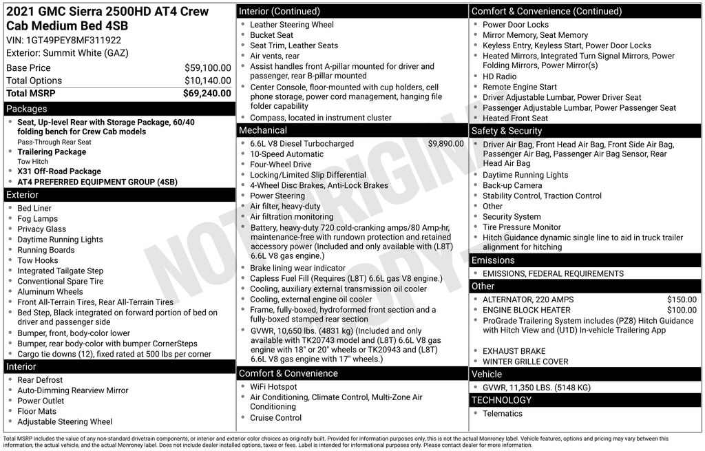 Summit White 2021 GMC Sierra 2500HD AT4 4WD 10-Speed Automatic Duramax 6.6L V8 Turbodiesel 10-Speed Automatic, 4WD, Jet Black With Kalahari Accents Leather.Recent Arrival! Odometer is 50928 miles below market average!