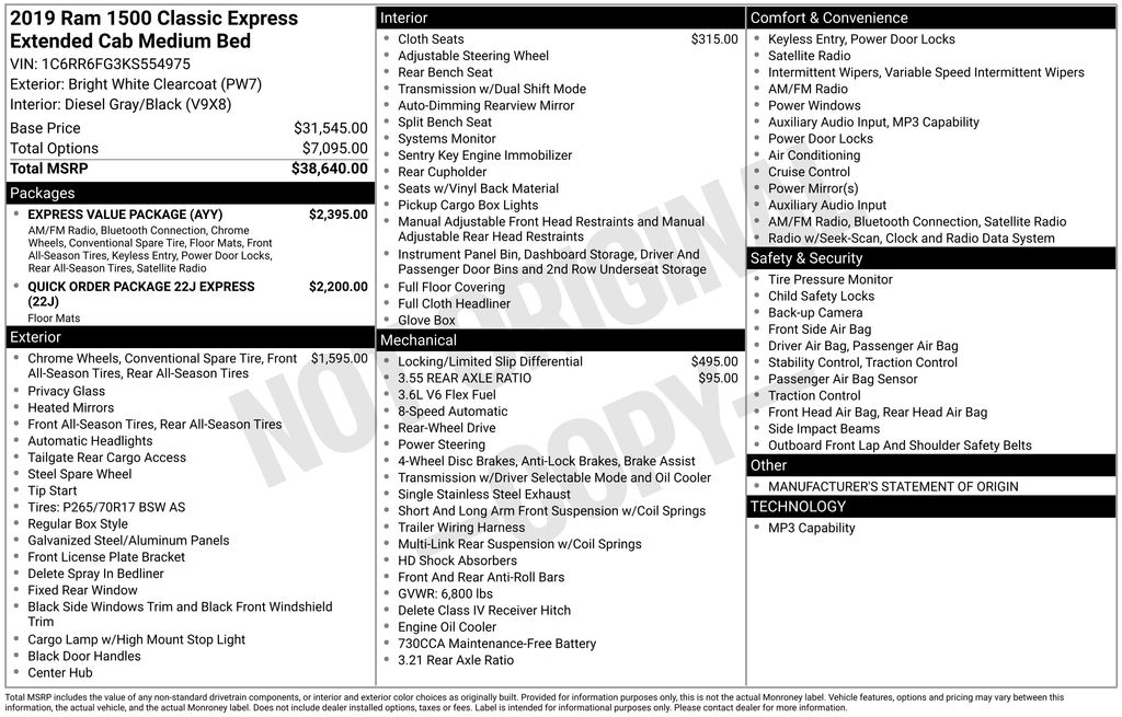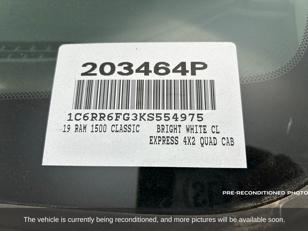 Bright White Clearcoat 2019 Ram 1500 Classic Express RWD 8-Speed Automatic 3.6L V6 24V VVT 1-Year SiriusXM Radio Service, 17" x 7" Aluminum Wheels, 5.0" Touchscreen Display, Audio Jack Input for Mobile Devices, Body Color Front Fascia, Body Color Grille, Body Color Rear Bumper w/Step Pads, Carpet Floor Covering, Center Hub, Cloth 40/20/40 Bench Seat, Delete Class IV Receiver Hitch, Delete Spray In Bedliner, Express Value Package, For More Info, Call 800-643-2112, Front Floor Mats, GPS Antenna Input, Heavy Duty Vinyl 40/20/40 Split Bench Seat, Integrated Voice Command w/Bluetooth, Manual Adjust Seats, Media Hub (USB, AUX), No Satellite Coverage w/AK/HI/PR/VI/GU, Overhead Console, ParkView Rear Back-Up Camera, Quick Order Package 22J Express, Radio: Uconnect 3 w/5" Display, Ram 1500 Express, Rear Floor Mats, Rear Folding Seat, Rear View Day/Night Mirror, Remote Keyless Entry w/All-Secure, Remote USB Port, SiriusXM Satellite Radio, Speed control, Temperature & Compass Gauge, Variably intermittent wipers, Wheels: 20" x 8" Aluminum Chrome Clad.