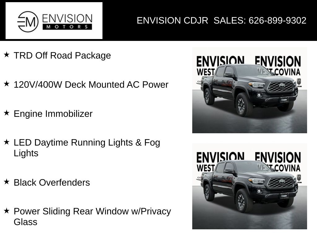 WE SPECIALIZE IN ALL CREDIT PROFILES! See what we can do for you! Call to find out (626) 899-9302.Odometer is 7637 miles below market average! 4WD, 120V/400W Deck Mounted AC Power, Black Overfenders, Engine Immobilizer, LED Daytime Running Lights & Fog Lights, Power Sliding Rear Window w/Privacy Glass, TRD Off Road Package.Black2023 Toyota Tacoma TRD Off-Road 4WD 6-Speed Automatic 3.5L V6**********All Pricing and Advertised Prices for any/all vehicles offered for sale does not include dealer installed accessories which can be purchased for an additional cost.********** The Factory Rebates may not be available on this vehicle if you elect to take advantage of a Special Alternative APR or Special Lease program. Some Factory Rebates are California Resident specific and may vary for residents of other states. NO sales to Dealers, Brokers or Exporters. For out of state purchase, customers must be present to purchase. If shipping is required, dealership must facilitate; no exceptions. Please contact us for special Multi-Vehicle or Fleet pricing. Prices are plus government fees and taxes, any finance charges, $85 documentary fee, $29 electronic registration fee, any emission testing charge and $1.75 per new tire state tire fee. *** We make every effort to provide accurate information, but please verify before purchasing. Leasing & financing available on approved credit. Trade-ins accepted. Subject to prior sale.