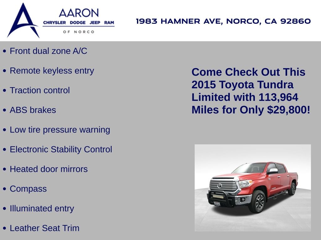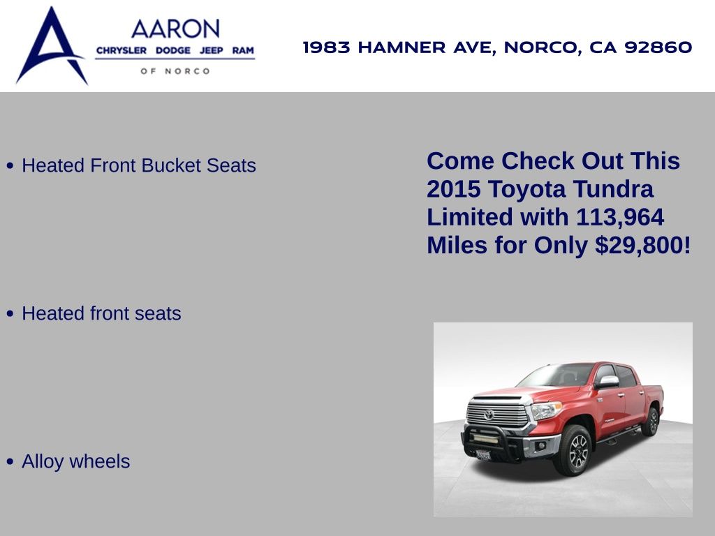 2015 Toyota Tundra Limited 4x4 Limited Premium, TRD Off-Road, JBL Audio, Moonroof, Spray-on Bedliner, just under 114K milesPowered by the 5.7L i-FORCE V8 with 6-speed automatic and 4x4 capability. No accidents reported on CARFAX. Para la version en espanol, vea abajo.The CrewMax cab offers exceptional space, leather-trimmed heated front seats, dual-zone climate control, and Entune Premium JBL audio with navigation and app suite for advanced connectivity.Equipped with the TRD Off-Road Package, this truck features Bilstein shocks, skid plates, and upgraded suspension for off-road confidence. A 5.5-ft bed with spray-on liner adds durability and utility.Blind Spot Monitor with Rear Cross-Traffic Alert enhances safety, while the power tilt/slide moonroof and premium interior finishes elevate driving comfort on longer trips.Renowned for its durability and strong resale value, this Tundra continues to stand out as a dependable choice in the full-size truck market.Ready to see this vehicle up close? Contact us today to schedule a no-obligation test drive or virtual tour, and lets discuss flexible financing options.2015 Toyota Tundra Limited 4x4 Paquete Limited Premium, TRD Off-Road, Audio JBL, Quemacocos, Bedliner en spray, menos de 114K millasImpulsada por el motor V8 i-FORCE de 5.7L con transmision automatica de 6 velocidades y traccion 4x4. Historial CARFAX sin accidentes reportados.La cabina CrewMax ofrece un espacio excepcional, asientos delanteros de piel calefactables, control de clima dual y sistema JBL Entune Premium con navegacion y aplicaciones avanzadas.Con el paquete TRD Off-Road, esta camioneta cuenta con amortiguadores Bilstein, placas protectoras y suspension mejorada para confianza todoterreno. Su caja de 5.5 pies con bedliner en spray anade utilidad.El monitor de punto ciego con alerta de cruce trasero mejora la seguridad, mientras que el quemacocos electrico y los acabados premium aumentan la comodidad en viajes largos.Reconocida por su durabilidad y fuerte valor de reventa, esta Tundra sigue destacando como una opcion confiable dentro de las camionetas de tamano completo.Da el siguiente paso contactandonos hoy para programar una prueba de manejo sin compromiso o un recorrido virtual. Tambien ofrecemos opciones flexibles de financiamiento.