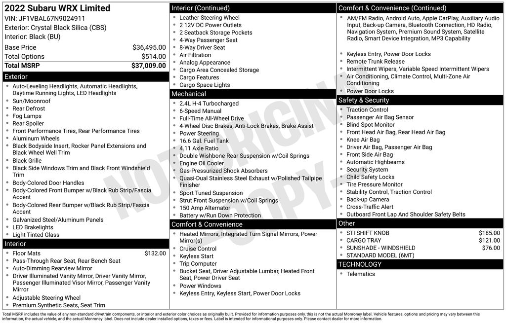 Crystal Black Silica 2022 Subaru WRX Limited AWD 6-Speed Manual 2.4L DOHC Front dual zone A/C, Heated front seats, Navigation System, Power moonroof, Spoiler, Standard Model (6MT), Sunshade - Windshield, Wheels: 18" x 8.5" Dark Gray Finish Alum Alloy.19/26 City/Highway MPGAwards: * ALG Residual Value Awards, Residual Value Awards