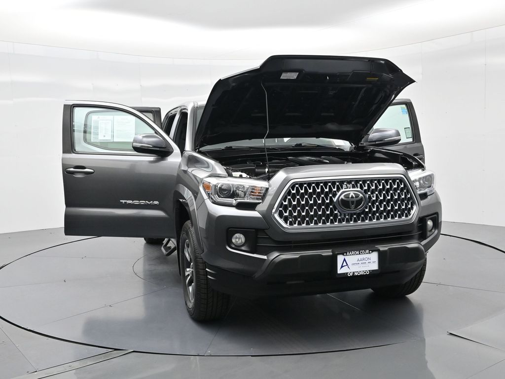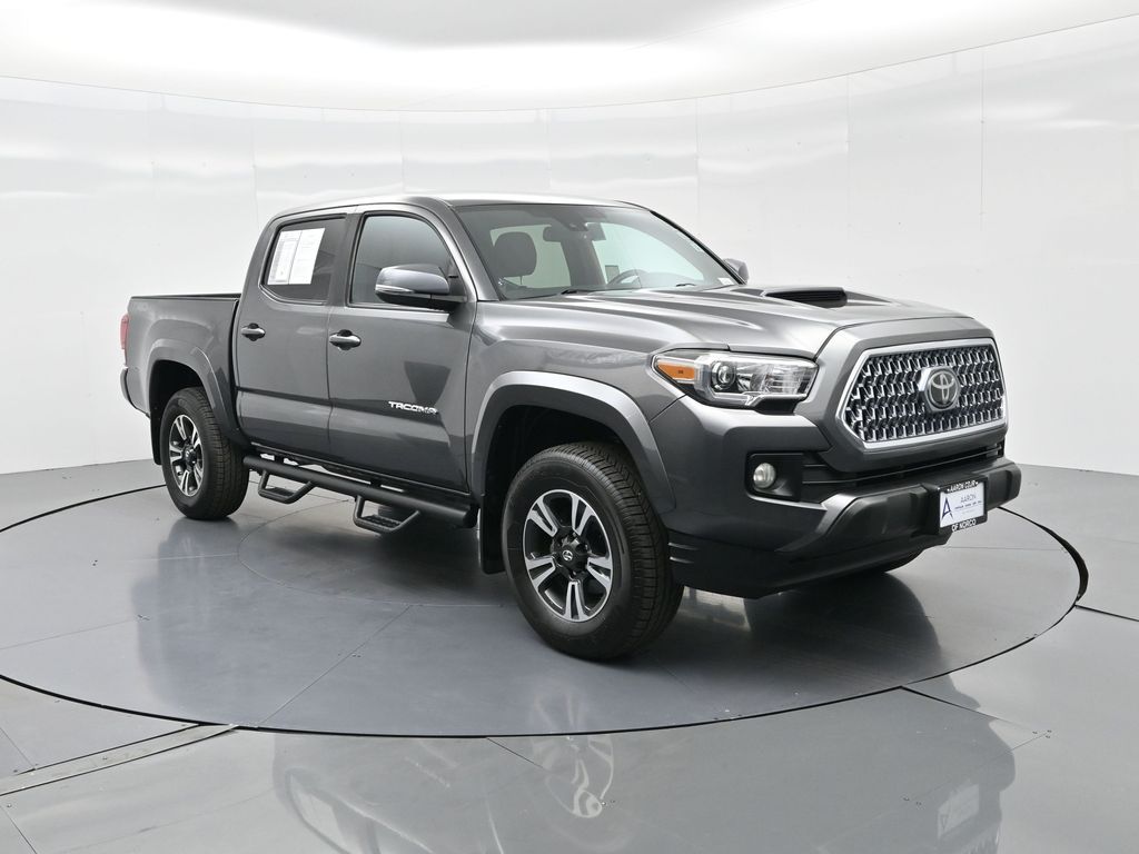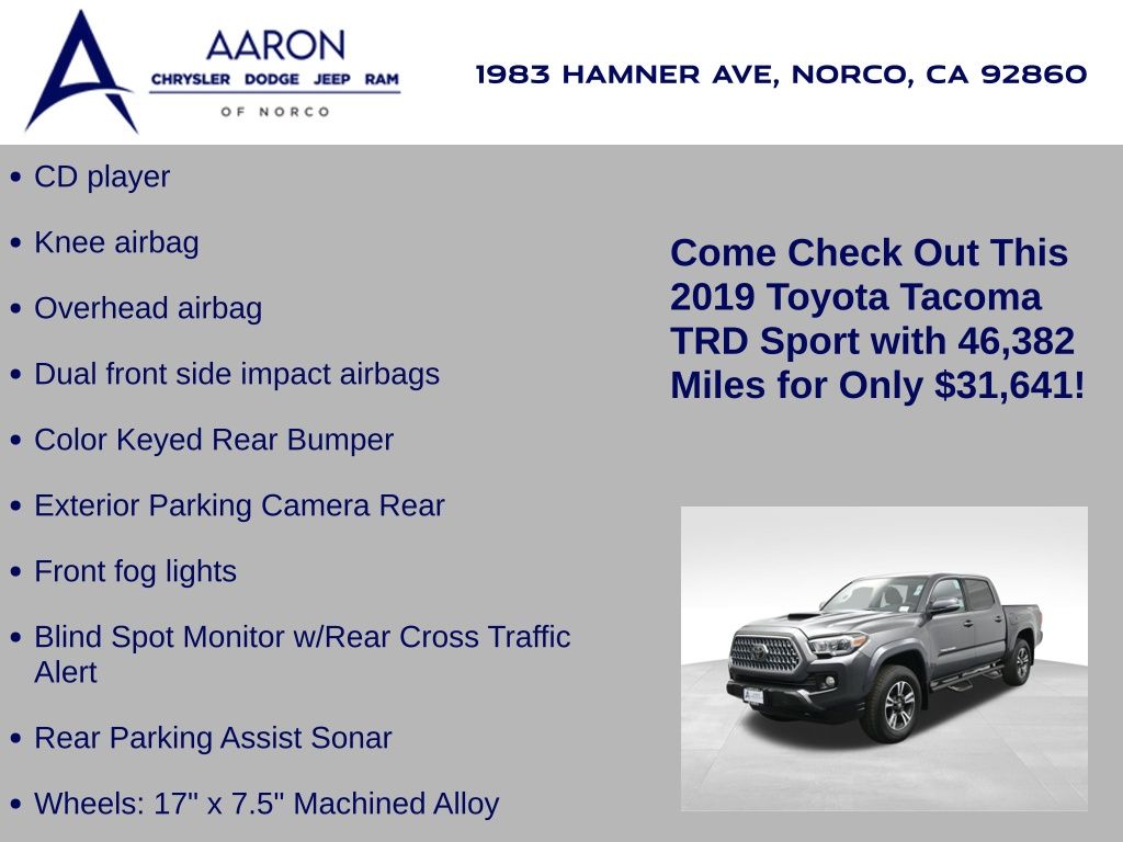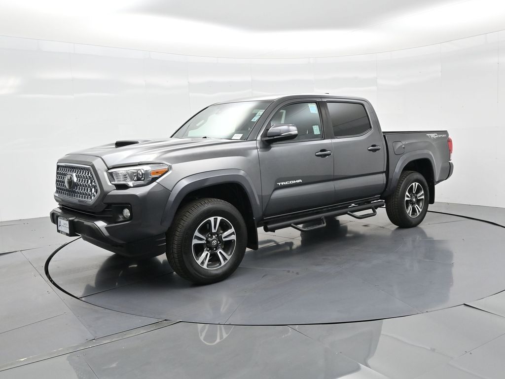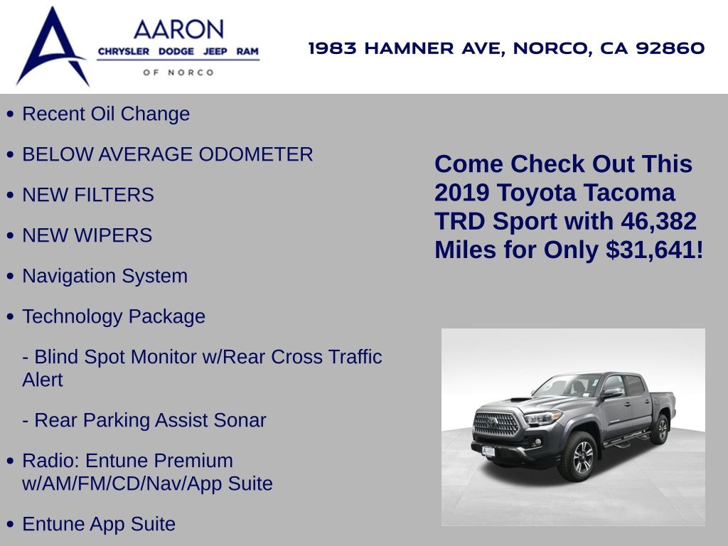 Tackle any terrain in style with this 2019 Toyota Tacoma TRD Sport Double Cab, a rugged yet refined midsize pickup engineered to balance off-road capability with everyday comfort. With 46,382 miles, strong service history, and a confident design, this TRD Sport is ready for adventure and daily duty alike. Powered by a proven 3.5L V6 engine mated to a smooth 6-speed automatic transmission, this Tacoma delivers robust performance and efficiency with an EPA-estimated 19 MPG city and 24 MPG highway, while the 3.91 rear axle ratio, Class IV towing equipment, and trailer sway control ensure its always ready to haul. The Magnetic Gray Metallic exterior paired with TRD Sport black and graphite interior trim sets a bold tone, complemented by mudguards, chrome exhaust tip, door edge guards, and 18-inch alloy wheels. Equipped with the TRD Sport Package and Technology Package, this truck features Entune Premium Audio with Navigation, Smart Key with push-button start, a 7-inch touchscreen, Qi-compatible wireless charging, blind spot monitor with rear cross-traffic alert, and a rear parking assist sonar system. Inside, enjoy front sport bucket seats with lumbar support, a 60/40 split-folding rear seat, dual-zone automatic climate control, and a leather-wrapped steering wheel with audio and phone controls. Built with safety in mind, this Tacoma includes Toyota Safety Sense P (TSS-P), offering Pre-Collision System, Lane Departure Alert, Dynamic Radar Cruise Control, Automatic High Beams, and a full suite of airbags and safety tech. Additional enhancements include bed-mounted D-rings, chrome tailgate insert, spare tire lock, and all-weather floor liners with door sill protectors, giving this truck both the form and function buyers demand. Backed by Toyotas legendary reputation for durability, this TRD Sport is perfect for drivers looking for a midsize pickup thats equally capable on trails, job sites, or city streets. Act quickly, well-equipped, low-mileage Tacoma models like this don't stay on the lot for long. Contact us today to schedule a test drive or learn more about this adventure-ready TRD Sport.