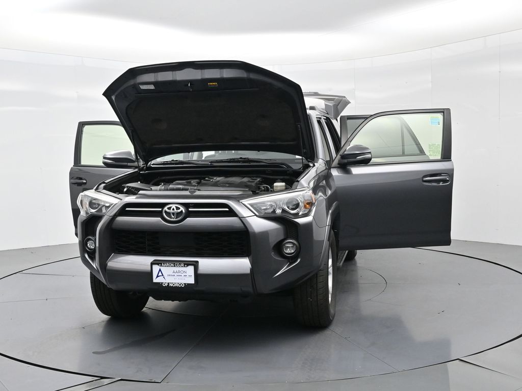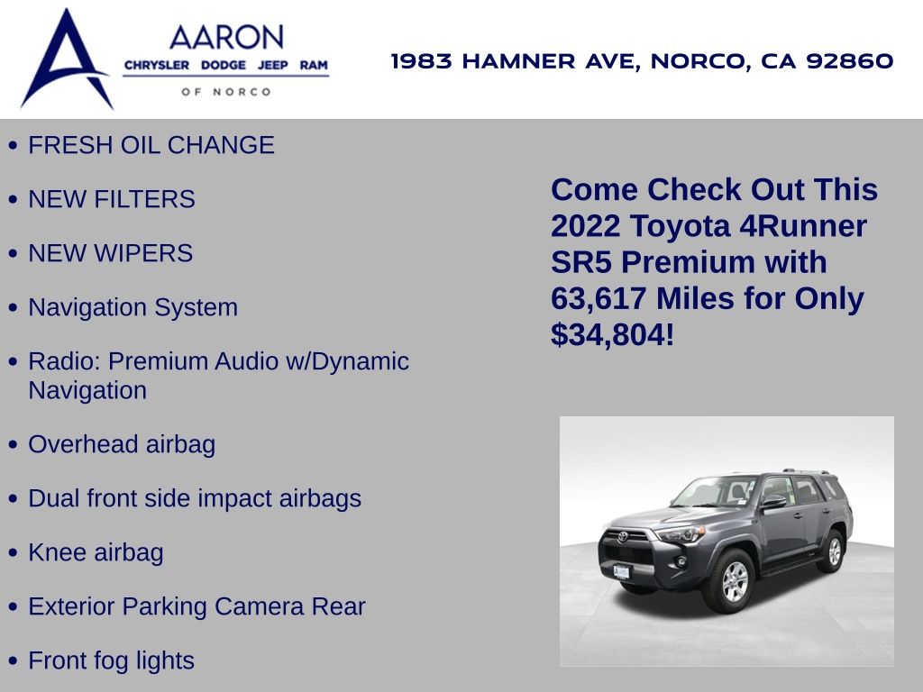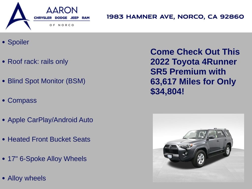 Rugged, reliable, and adventure-ready, this 2022 Toyota 4Runner SR5 Premium delivers legendary off-road capability with everyday comfort and versatility. With 63,617 miles and a clean one-owner Carfax history, this Magnetic Gray Metallic 4Runner is powered by a proven 4.0L DOHC V6 engine paired with a smooth 5-speed automatic transmission, offering dependable performance on highways, trails, and everything in between. Built on a body-on-frame construction for superior durability, it features a robust suspension, 2WD drivetrain, and a Class III towing hitch receiver with a 4- and 7-pin connector for hauling gear or recreational equipment. The SR5 Premium trim adds comfort-focused amenities like SofTex-trimmed heated front seats, an 8-way power-adjustable drivers seat, power moonroof, and a premium audio system with an 8-inch touchscreen, Apple CarPlay, Android Auto, Amazon Alexa, SiriusXM, Bluetooth, and integrated navigation. Safety is well covered with Toyota Safety Sense P, including pre-collision system with pedestrian detection, dynamic radar cruise control, lane departure alert, automatic high beams, blind spot monitor, and rear cross-traffic alert. This example also comes with desirable extras like third-row seating, running boards, all-weather floor liners with cargo tray, and the Preferred Owners Portfolio. Exterior highlights include 17-inch alloy wheels, LED headlights, roof rails, and a power rear window for added versatility. With its spacious interior, configurable seating for passengers and cargo, and Toyotas reputation for long-term reliability, this 4Runner SR5 Premium is equally at home tackling weekend getaways, daily commutes, or extended road trips. Come see why the 4Runner remains a top choice for drivers seeking durability, capability, and comfort in one iconic SUV.
