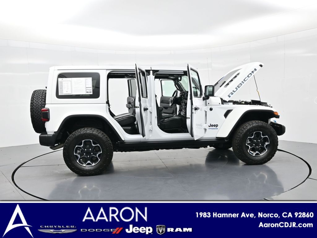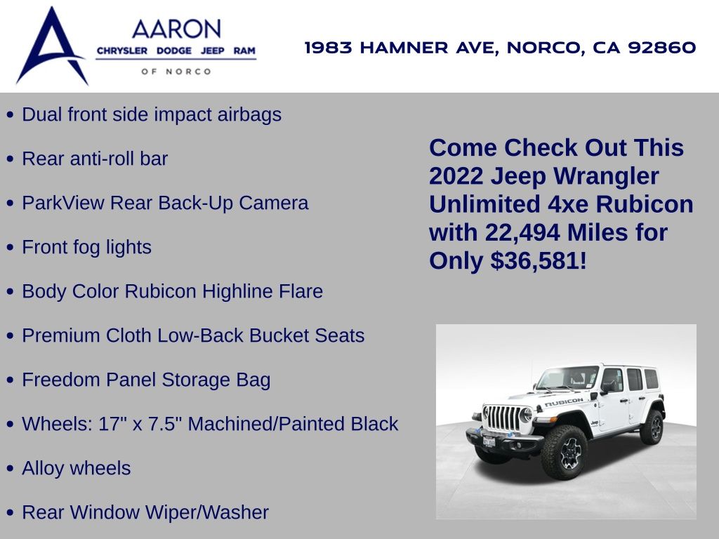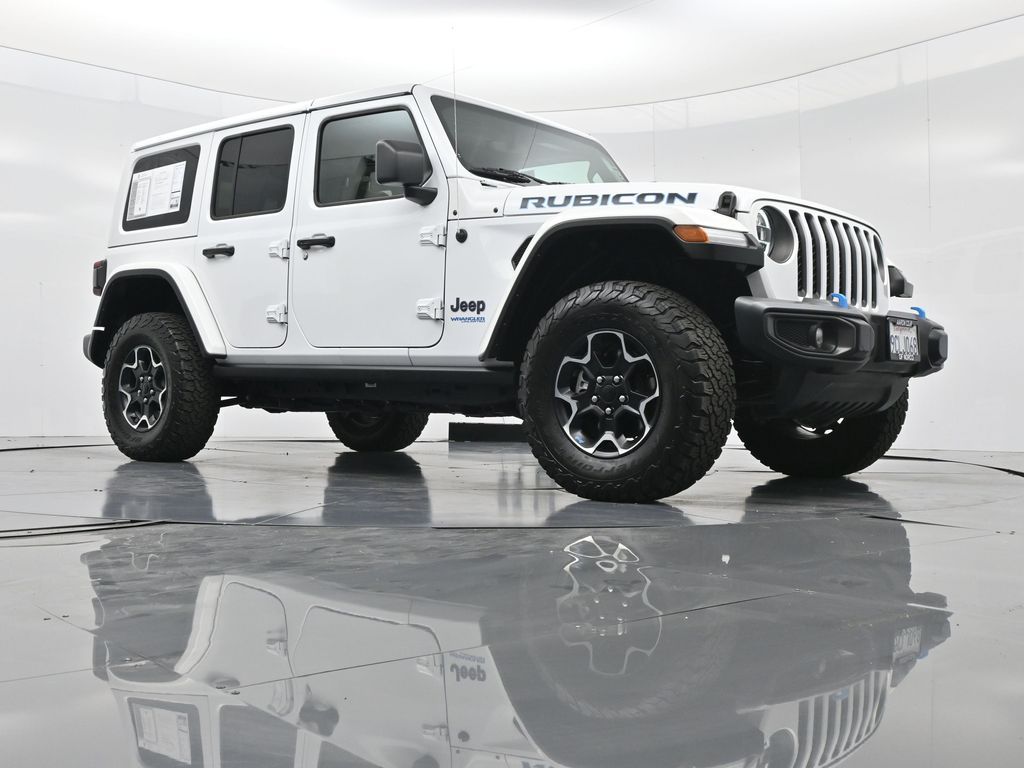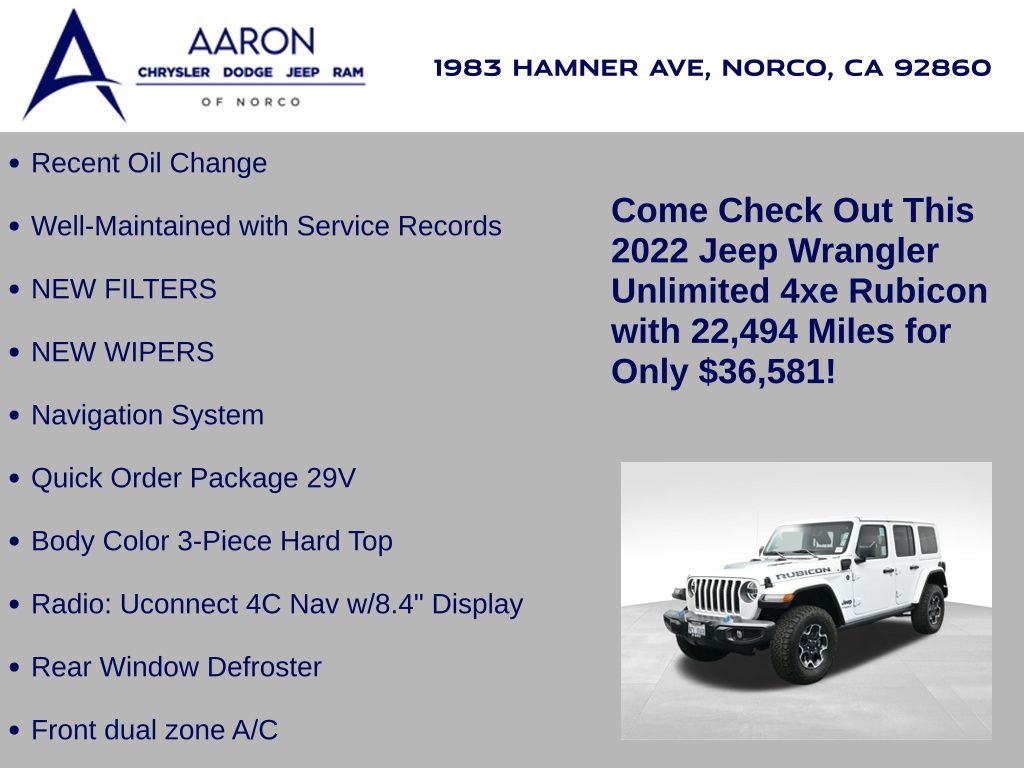 This 2022 Jeep Wrangler Unlimited Rubicon 4xe in Bright White Clearcoat delivers legendary off-road performance with modern plug-in hybrid efficiency, offering the perfect balance of rugged capability and eco-conscious driving. Powered by a 2.0L turbocharged PHEV engine paired with an 8-speed automatic transmission and Jeeps Rock-Trac heavy-duty full-time 4WD system, it produces impressive torque for conquering trails while providing the flexibility of electric-only driving for shorter trips. The Rubicon trim elevates off-road readiness with Tru-Lok electronic locking differentials, an electronic front sway bar disconnect, heavy-duty Dana 44 front and rear axles, skid plates, and LT285/70R17 off-road tires on machined/pained black alloy wheels. The Quick Order Package 29V adds premium features like leather-trimmed bucket seats, Uconnect 4C NAV with 8.4-inch touchscreen, Apple CarPlay, Android Auto, navigation, Alpine premium audio, remote start, and a body-color three-piece hardtop. Additional highlights include a premium door trim panel, heated front seats and steering wheel, rear window defroster, and a Freedom panel storage bag. The exterior stands out with signature Rubicon decals, LED lighting, and black tow hooks, while safety features include a ParkView rear backup camera, trailer sway control, stability control, and advanced multistage airbags. With just 22,494 miles, a clean 1-owner CARFAX history, and regular oil changes, this Wrangler Rubicon 4xe is in excellent condition and still under factory warranty. Offering unmatched trail capability, everyday practicality, and the efficiency of plug-in hybrid technology, this Wrangler Rubicon 4xe is ready for your next adventure. Whether its an urban commute or a backcountry expedition.