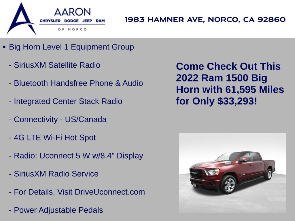 Recent Oil Change, NEW FILTERS, NEW WIPERS, 1500 Big Horn/Lone Star, 4D Crew Cab, HEMI 5.7L V8 Multi Displacement VVT, 8-Speed Automatic, 4WD, 2nd Row In Floor Storage Bins, 3 Rear Seat Head Restraints, 4 Way Front Headrests, 4G LTE Wi-Fi Hot Spot, 8.4" Touchscreen Display, All Plant-Installed Decals, Alloy wheels, Apple CarPlay, Auto-Dimming Exterior Driver Mirror, Auto-Dimming Rear-View Mirror, Big Horn Badge, Big Horn Level 1 Equipment Group, Black Exterior Mirrors, Black Interior Accents, Black Premium Power Mirrors, Bluetooth Handsfree Phone & Audio, Body Color Exterior Mirrors, Body Color Front Bumper, Body Color Premium Power Mirrors, Body Color Rear Bumper w/Step Pads, Bucket Seats, Class IV Receiver Hitch, Cluster 3.5" TFT Color Display, Connectivity - US/Canada, Convex Wide-Angle Mirror Insert, Delete LED Lamp - Floor Console Bin, Deluxe Cloth Bucket Seats, Dual front side impact airbags, Exterior Mirrors Courtesy Lamps, Exterior Mirrors w/Heating Element, Exterior Mirrors w/Supplemental Signals, For Details, Visit DriveUconnect.com, Front fog lights, Front Seat Back Map Pockets, Full Length Floor Console, Global Telematics Box Module (TBM), Glove Box Lamp, Google Android Auto, GPS Antenna Input, Integrated Center Stack Radio, Manual Adjust 4-Way Front Passenger Seat, ParkView Rear Back-Up Camera, Power 2-Way Driver Lumbar Adjust, Power 8-Way Driver Seat, Power Adjustable Pedals, Power-Folding Mirrors, Quick Order Package 27Z Big Horn, Radio: Uconnect 5 W w/8.4" Display, Rear 60/40 Folding Seat, Rear Center Armrest, Rear Dome w/On/Off Switch Lamp, Rear Power Sliding Window, Rear step bumper, Rear Window Defroster, SiriusXM Radio Service, SiriusXM Satellite Radio, Sport Appearance Package, Sport Decal, Sun Visors w/Illuminated Vanity Mirrors, Universal Garage Door Opener, USB Host Flip, Wheels: 20" x 9" Aluminum Chrome Clad (WRK).CARFAX One-Owner.