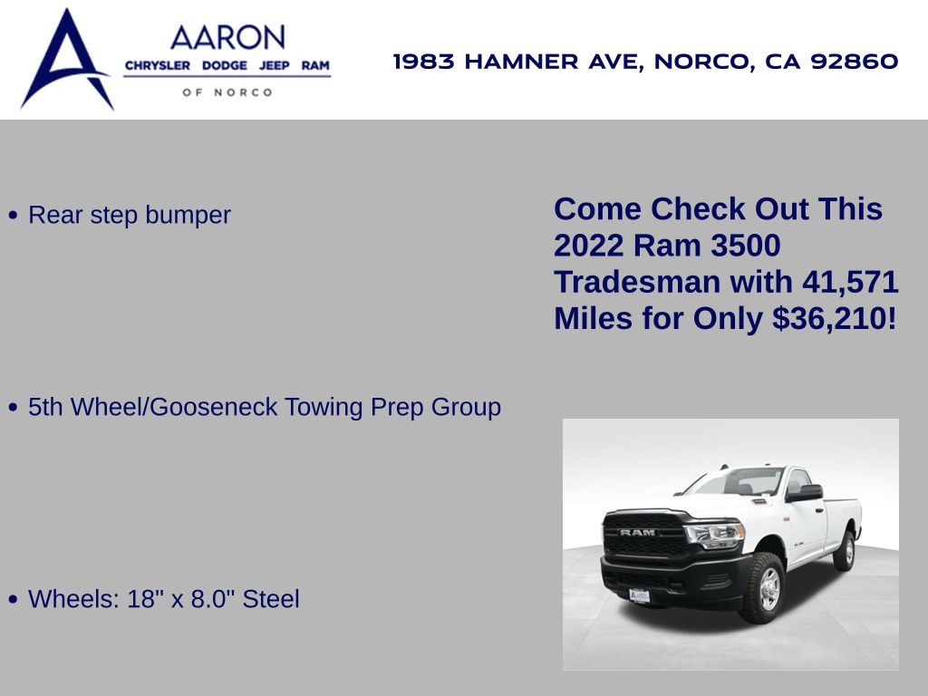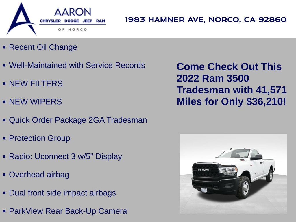 Built to handle the toughest jobs with confidence and capability, this 2022 Ram 3500 Tradesman Regular Cab 4x4 Long Box delivers commercial-grade strength, reliability, and modern features in one powerful package. With only 41,571 miles and a clean 1-owner Carfax showing no accidents, personal use, and routine oil changes, this heavy-duty pickup is ready to work from day one. Under the hood, it boasts the brawny 6.4L HEMI V8 engine mated to a smooth 8-speed automatic transmission, delivering robust performance and long-haul dependability. With a 3.73 axle ratio, electronic shift-on-the-fly transfer case, and trailer sway damping, this Ram is equipped for demanding towing and payload applications. Rated with a 32-gallon fuel tank and outfitted with a Class V hitch receiver and integrated trailer brake controller, its engineered to support your business or fleet needs with strength and ease. The rugged Bright White Clear-Coat exterior pairs with 18-inch steel wheels, black grille surround, and halogen headlamps, while the interior offers a durable Black/Diesel Gray vinyl-trimmed bench seat, Uconnect 3 with 5-inch touchscreen, SiriusXM Guardian, Bluetooth, two USB ports, and a 12-volt auxiliary power outlet. Safety features include ParkView rear backup camera, Electronic Stability Control, Hill-Start Assist, Anti-lock 4-wheel disc brakes, traction control, and advanced multistage front and side airbags. This Ram 3500 is also equipped with the Transfer Case Skid Plate Shield, Snow Chief Group, Mopar front rubber floor mats, and Gooseneck Tow Prep Package, providing serious worksite functionality right from the factory. Rated as a B- in greenhouse gas performance by the California Air Resources Board and backed by Rams 5-year/60,000-mile powertrain warranty, this truck represents long-term value and proven capability. Whether you're hauling trailers, tackling rugged job sites, or expanding your fleet with a dependable workhorse, this 2022 Ram 3500 is built for serious professionals who dont compromise. Contact us today to schedule a test drive or secure this heavy-duty hauler before it's gone.