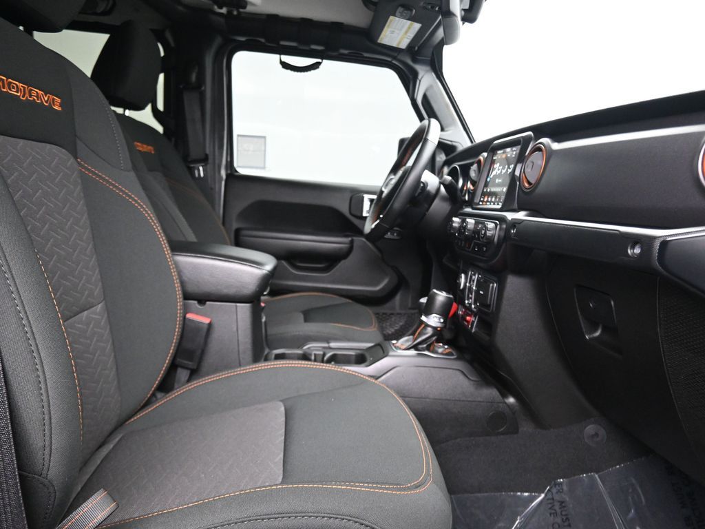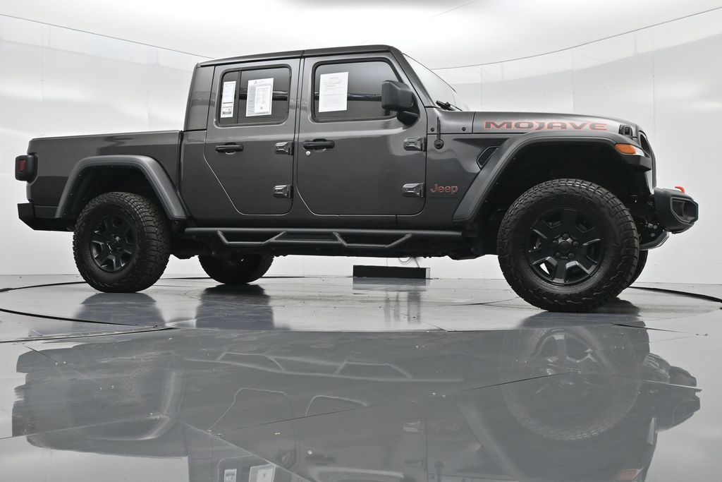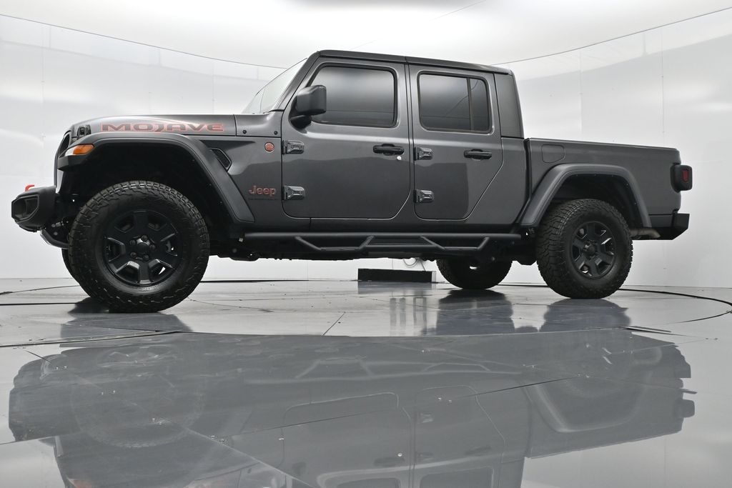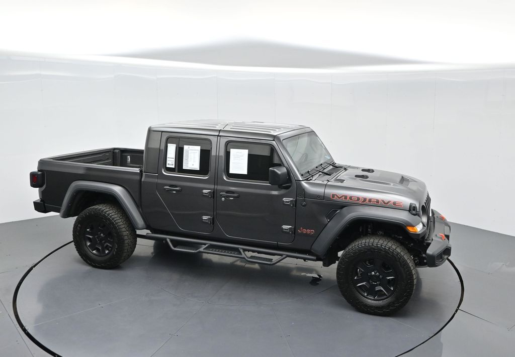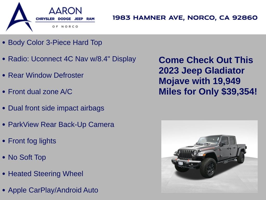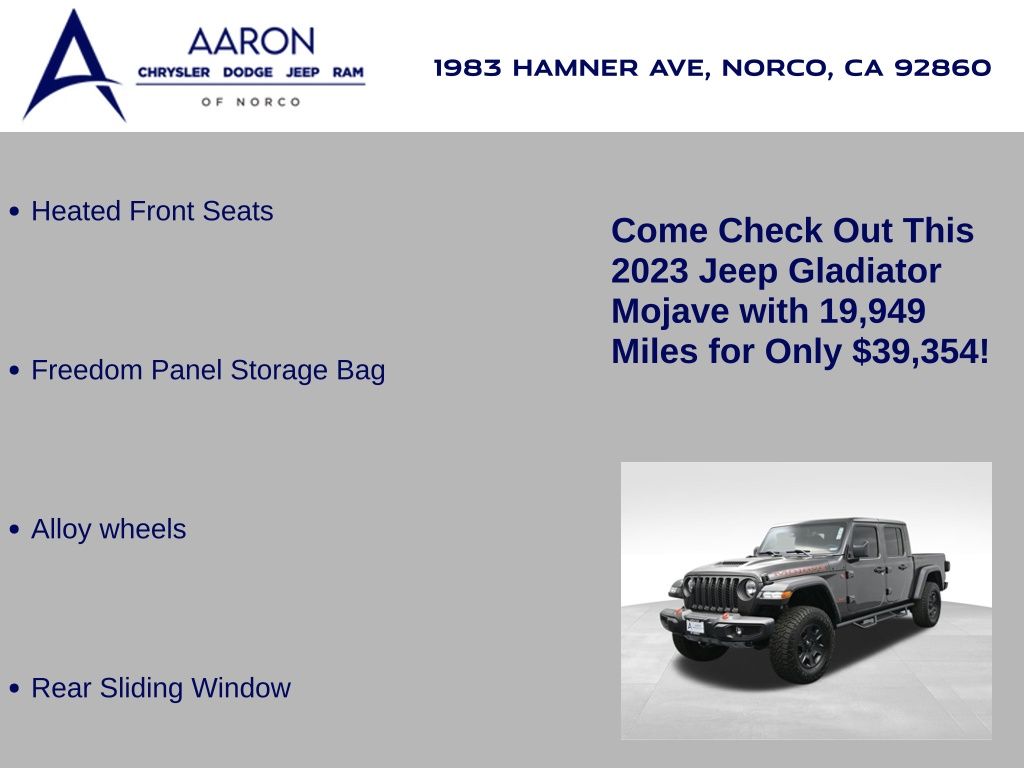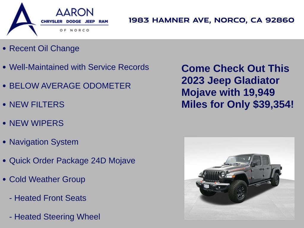Built for high-speed desert running and off-road dominance, this 2023 Jeep Gladiator Mojave in Granite Crystal Metallic Clearcoat offers unmatched capability with the rugged versatility of a pickup. Powered by a 3.6L V6 engine paired with an 8-speed automatic transmission and a 4.10 rear axle ratio, its engineered for strength and precision over challenging terrain. The Mojave trim stands out with heavy-duty suspension featuring FOX internal bypass shocks, reinforced frame components, locking rear differential, and high-clearance fender flares over LT285/70R17 all-terrain tires mounted on black aluminum wheels. Off-road credentials are backed by Jeeps Command-Trac 4x4 system, skid plates, rock rails, and a Desert Rated badge signifying enhanced durability in extreme heat, sand, and dust. Inside, the cabin blends function and comfort with premium cloth bucket seats with sport bolsters, heated front seats, heated steering wheel, Uconnect 4C NAV with 8.4-inch touchscreen, Apple CarPlay, Android Auto, Alpine premium audio, and dual-zone automatic climate control. Added features include the Cold Weather Group, Mopar spray-in bedliner, body-color 3-piece hard top, remote start, rear sliding window, and Selec-Speed control for confident descents. With only 19,949 miles, a clean 1-owner CARFAX history, and well-documented maintenance, this Gladiator Mojave is in excellent condition and still under factory warranty. Perfect for those who want pickup practicality with the heart of a desert racer, this Gladiator Mojave delivers the capability, durability, and performance to conquer the toughest terrain. Come take it for a drive and see where it can take you next.