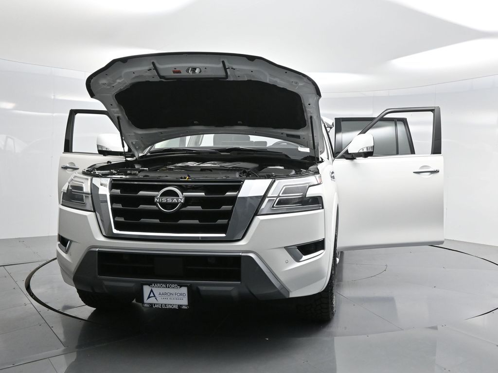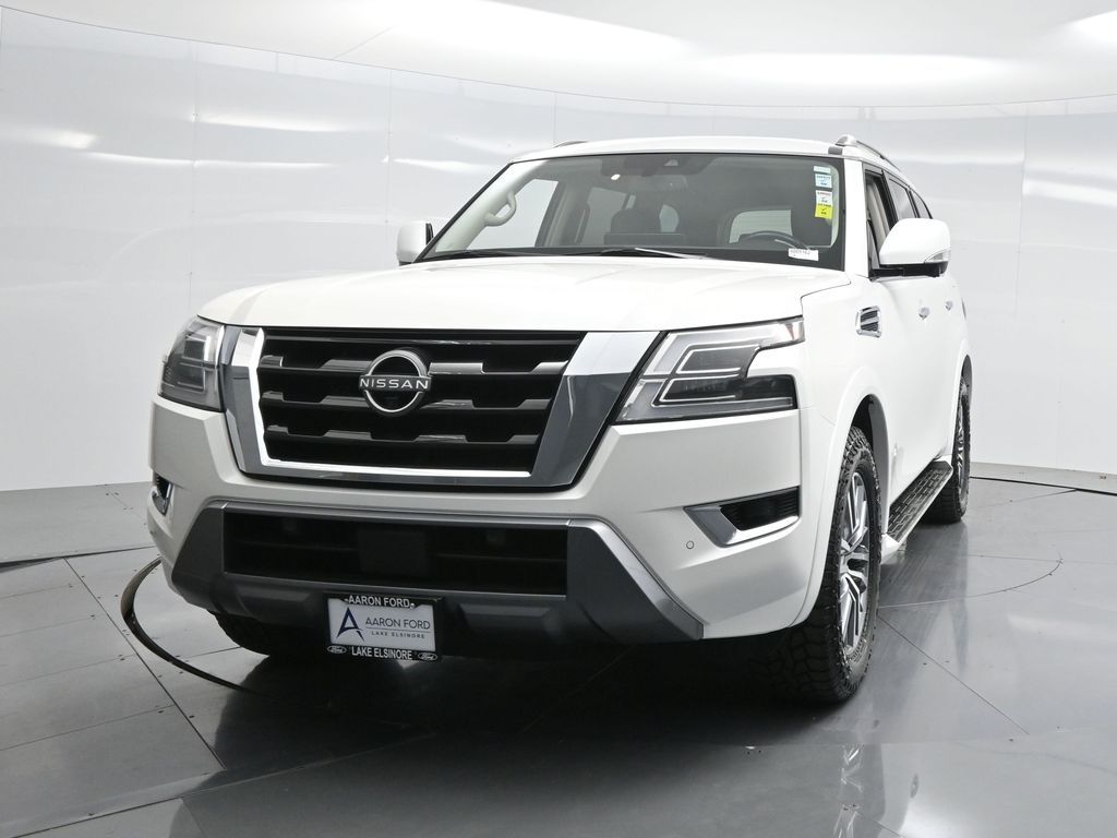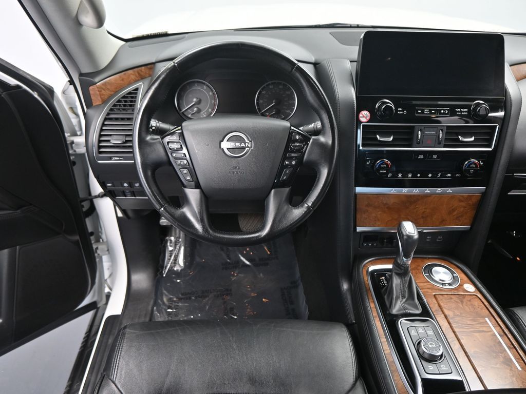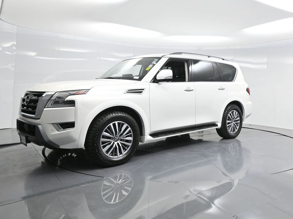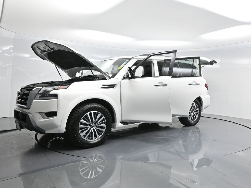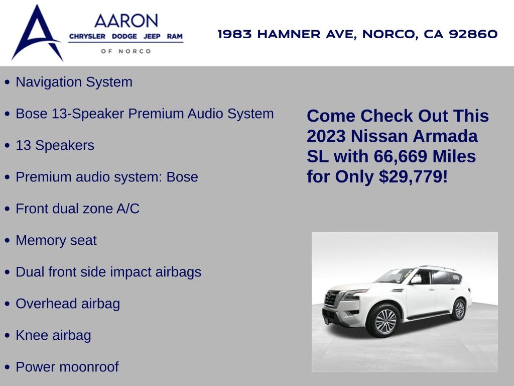 Command the road in full-size comfort and power with this 2023 Nissan Armada SL, finished in Aspen White TriCoat over a Charcoal leather interior and driven just 66,669 miles. Under the hood lies a robust 5.6 liter Endurance V8 engine producing 400 horsepower and 413 pound feet of torque, paired with a seven speed automatic transmission and rear wheel drive for responsive performance and confident towing. This SL trim offers an elevated driving experience with second row captains chairs, a power folding third row, heated front seats, heated leather wrapped steering wheel, dual zone automatic climate control, and power lift-gate for convenience and comfort. Inside the cabin, technology takes center stage with a 12.3 inch color touchscreen infotainment system, navigation, Apple CarPlay and Android Auto, SiriusXM radio with Traffic and Travel Link, Wi-Fi hotspot, and a 13 speaker premium Bose audio system with surround sound clarity. Nissan Safety Shield 360 surrounds you with driver assistance features including automatic emergency braking with pedestrian detection, lane departure warning, blind spot warning, rear cross traffic alert, rear automatic braking, intelligent forward collision warning, high beam assist, and an intelligent around view monitor with moving object detection. The exterior is equally refined, with 20 inch alloy wheels, LED lighting, fog lamps, roof rails, and power folding heated mirrors with LED turn signal indicators. Thoughtful features like remote engine start, trailer sway control, a tow hitch receiver, HomeLink universal garage door transmitter, and rear privacy glass enhance both capability and convenience. With a clean Carfax report, no accidents, one owner history, and consistent service records, this Armada is well cared for and ready for your next family adventure. Spacious, powerful, and equipped with the technology and features modern drivers demand, this 2023 Nissan Armada SL is a premium full-size SUV that blends luxury with long-haul confidence. Schedule your test drive today and experience the refinement and strength that sets the Armada apart.