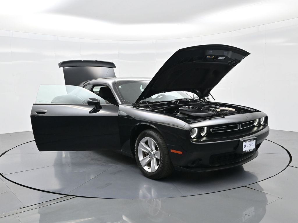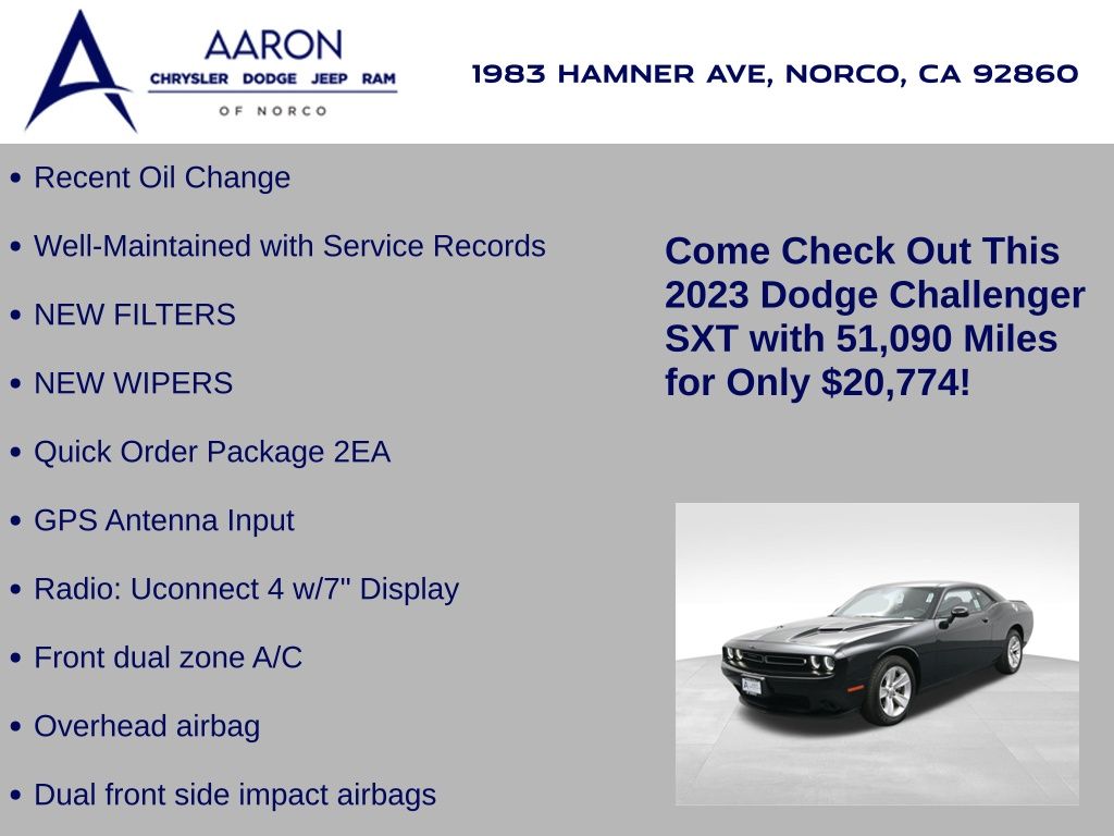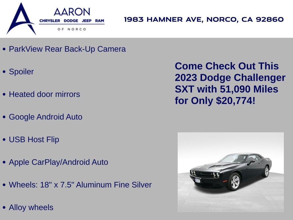 Own the road in unmistakable style with this 2023 Dodge Challenger SXT, a modern American muscle icon that blends bold design with refined technology and everyday drivability. With just 51,090 miles and a clean Carfax history showing 1-owner status, no accidents, and consistent service records, this coupe delivers outstanding value and peace of mind. Under the hood lies a responsive 3.6L Pentastar V6 engine paired to a TorqueFlite 8-speed automatic transmission, providing thrilling rear-wheel-drive performance with an EPA-estimated 19 MPG city and 30 MPG highwayan excellent balance of power and efficiency for a vehicle in its class. Finished in classic Pitch Black Clear-Coat, this Challenger commands presence with its Satin Chrome grille, dual bright exhaust tips, projector headlamps, and 18x7.5-inch aluminum fine silver wheels wrapped in all-season performance tires. Step inside the spacious and driver-focused cabin finished in Black Cloth Performance Seating, and youll find premium comfort and intuitive tech features like the Uconnect 4 system with 7-inch touchscreen, Apple CarPlay, Android Auto, Bluetooth, integrated voice command, and a 276-watt Alpine premium sound system with 6 speakers. Additional highlights include dual-zone automatic climate control, sport suspension, sport mode, push-button start, keyless entry, tilt/telescoping steering wheel, illuminated cupholders, and a leather-wrapped steering wheel with audio controls. Safety is built in with ParkView rear backup camera, electronic stability control, brake assist, all-speed traction control, and Hill-Start Assist. This Challenger also features the Customer Preferred Package 2EA, a compact spare tire, and a 6-month trial of SiriusXM with 360L, ensuring you stay entertained and connected wherever the road leads. Backed by Dodges 5-year/60,000-mile Powertrain Warranty, this vehicle offers iconic design, thrilling performance, and dependable engineering at a tremendous value. Whether you're a first-time buyer looking to step into the performance world or a muscle car enthusiast seeking a clean and well-equipped daily driver, this Challenger SXT checks all the boxes. Don't wait. Inventory like this moves fast. Contact us today to schedule your test drive or reserve this powerhouse before its gone!