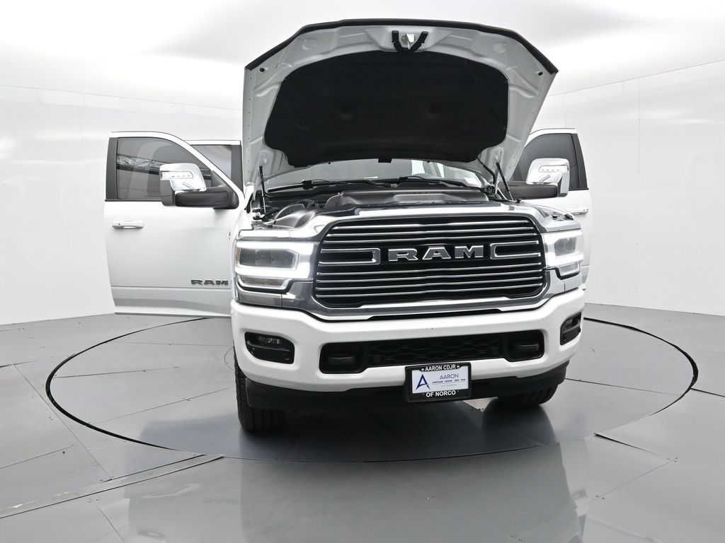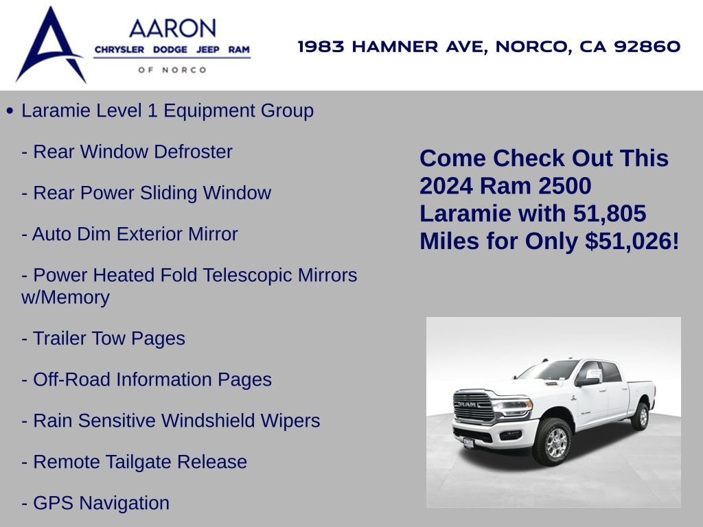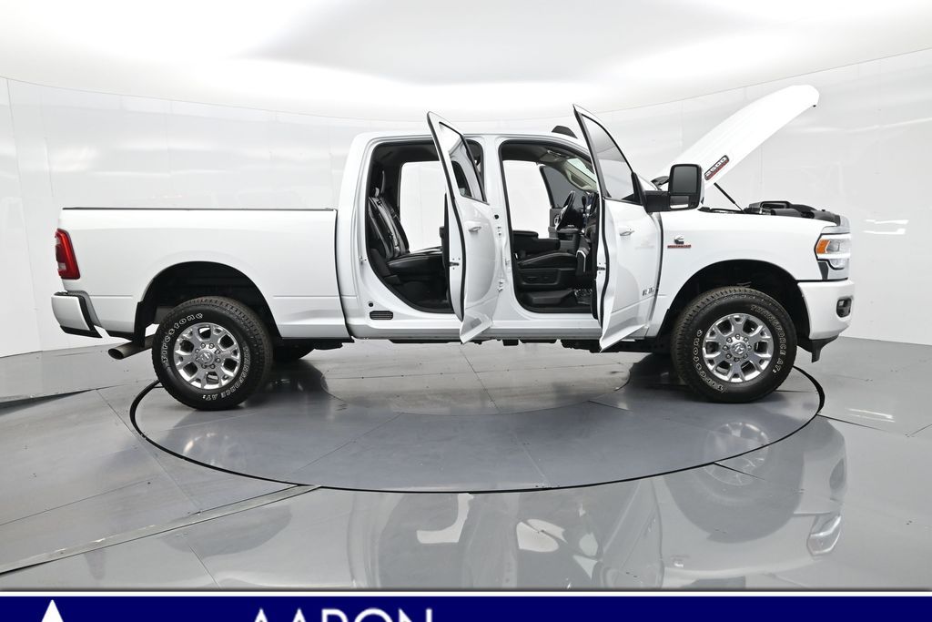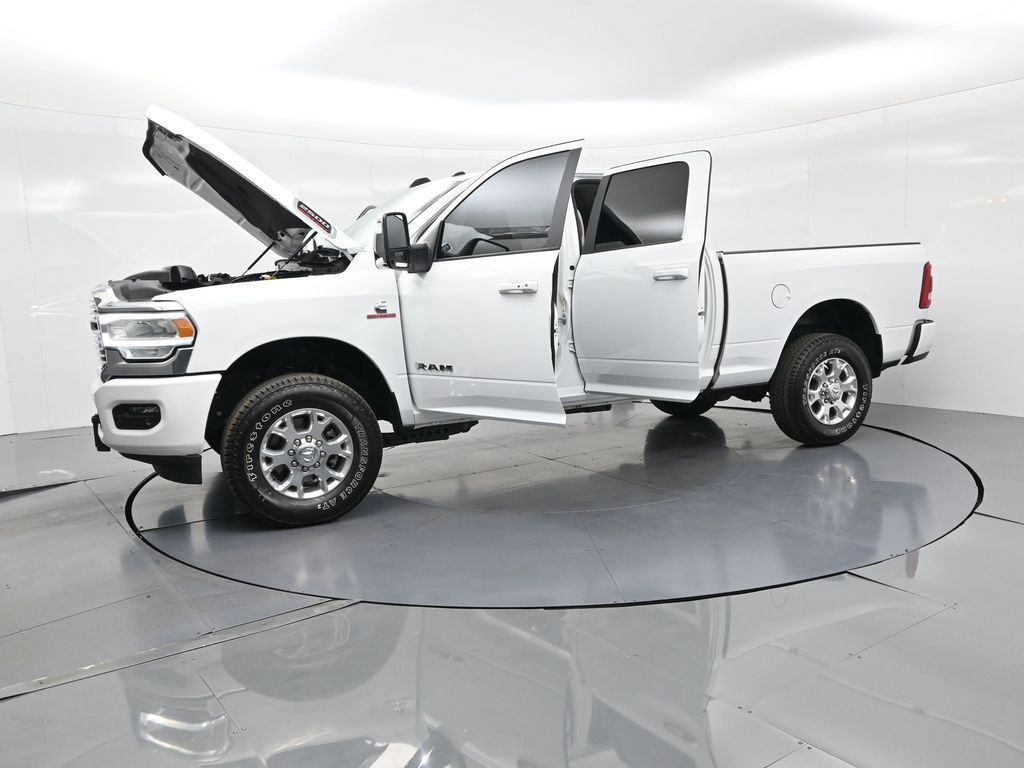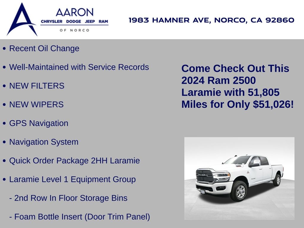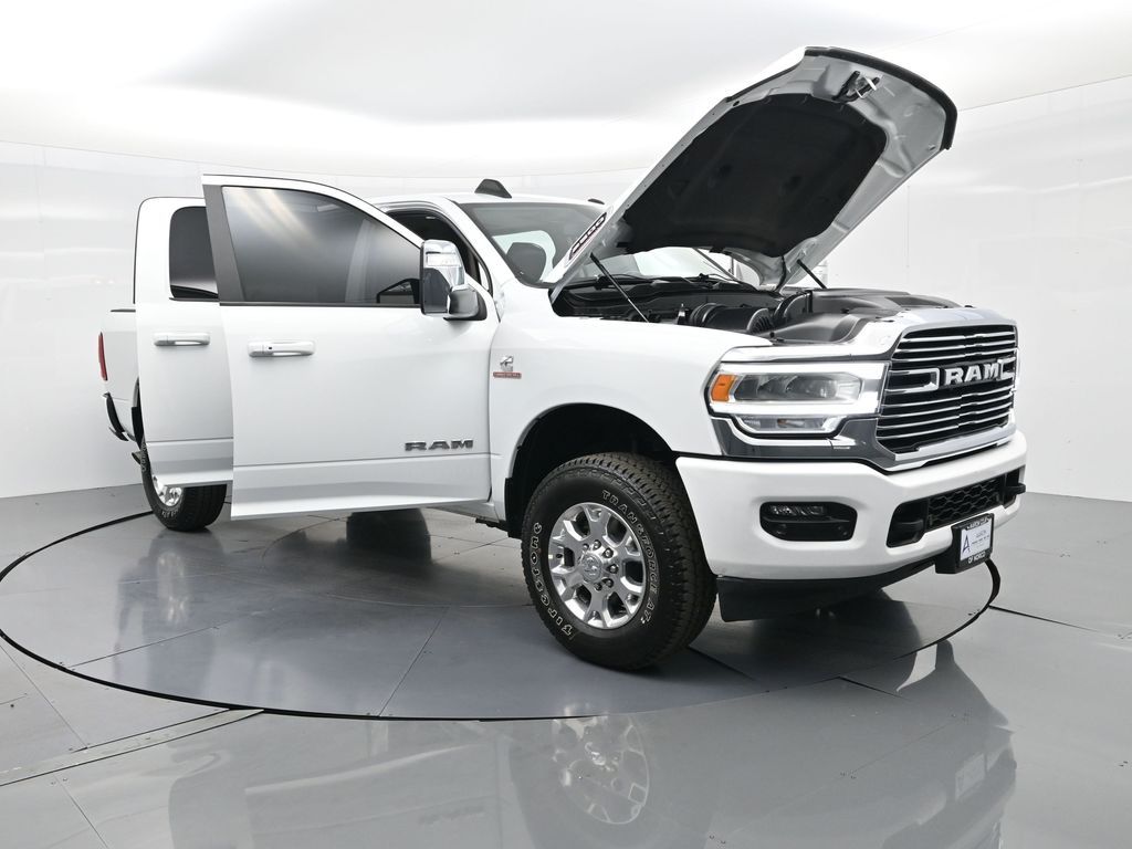 This 2024 Ram 2500 Laramie Crew Cab 4x4 in Bright White Clearcoat delivers heavy-duty performance, premium comfort, and advanced towing capability in a bold, refined package. Powered by the legendary 6.7L Cummins Turbo Diesel I6 paired with a 6-speed automatic transmission, it delivers exceptional torque for towing and hauling, supported by a Class V receiver hitch, integrated trailer brake controller, and trailer reverse guidance. The 4x4 system, anti-spin rear differential, and HD suspension with front and rear stabilizer bars provide stability and control on any terrain. The Laramie trim offers chrome bumpers and grille, LED lighting, tow hooks, power-folding trailer tow mirrors with memory, and 18-inch polished aluminum wheels wrapped in LT275/70R18 all-terrain tires. Inside, the cabin combines utility and luxury with heated and ventilated leather-trimmed front seats, heated rear seats, a heated leather-wrapped steering wheel, power-adjustable pedals with memory, and a 10-speaker Alpine audio system. The Uconnect 12-inch touchscreen infotainment system includes Apple CarPlay, Android Auto, Bluetooth, navigation, and voice command. Additional convenience features include keyless enter n go, remote start, multiple USB and 115V outlets, and abundant storage solutions. Safety is enhanced with ParkSense front and rear park assist, blind spot monitoring with cross-path detection, and a rear backup camera. With 51,805 miles, a 1-owner CARFAX history, and regular maintenance, this truck is well cared for and work-ready. Combining the strength of the Cummins diesel with the upscale amenities of the Laramie trim, this Ram 2500 is equally suited for job-site duties, long hauls, or weekend getaways. Experience its capability and comfort today.