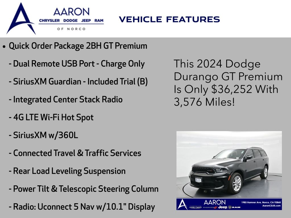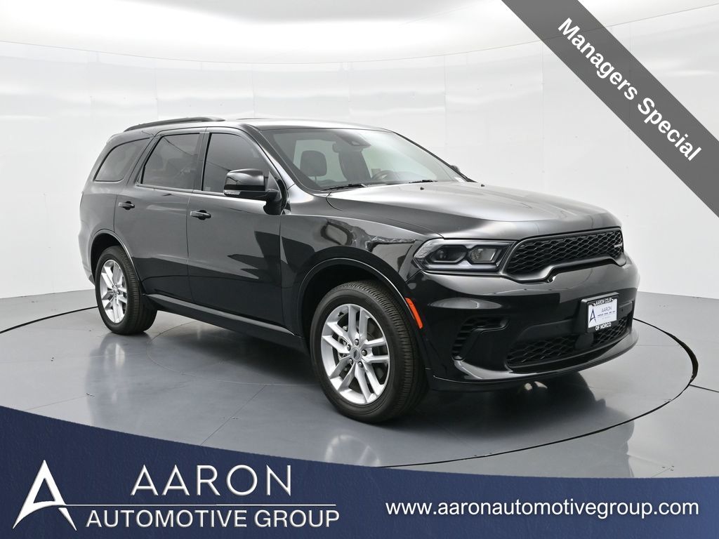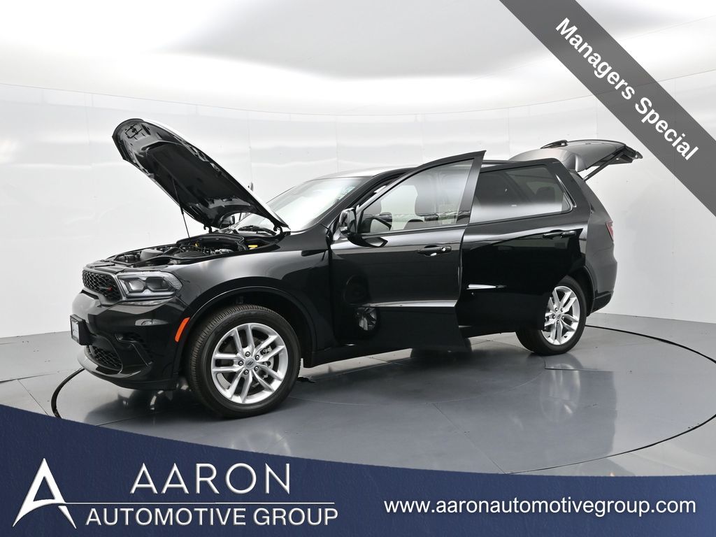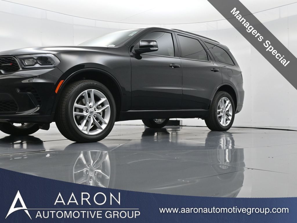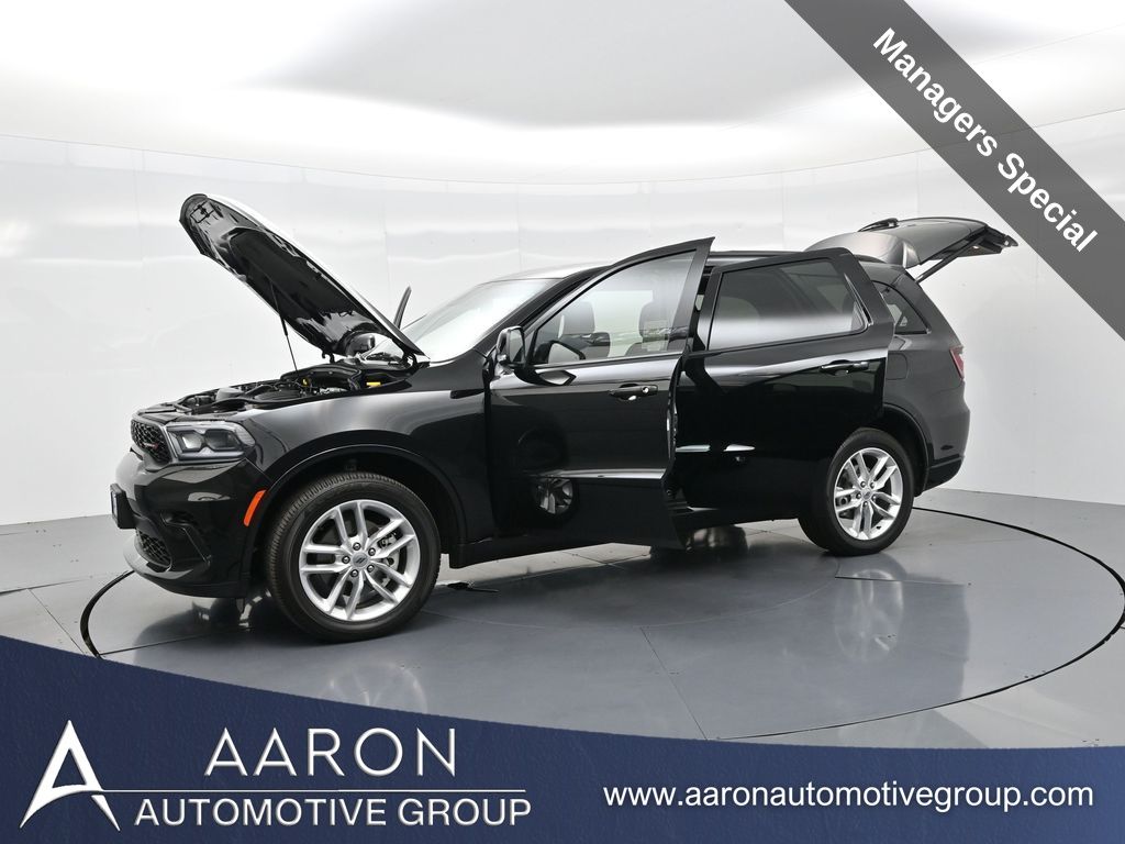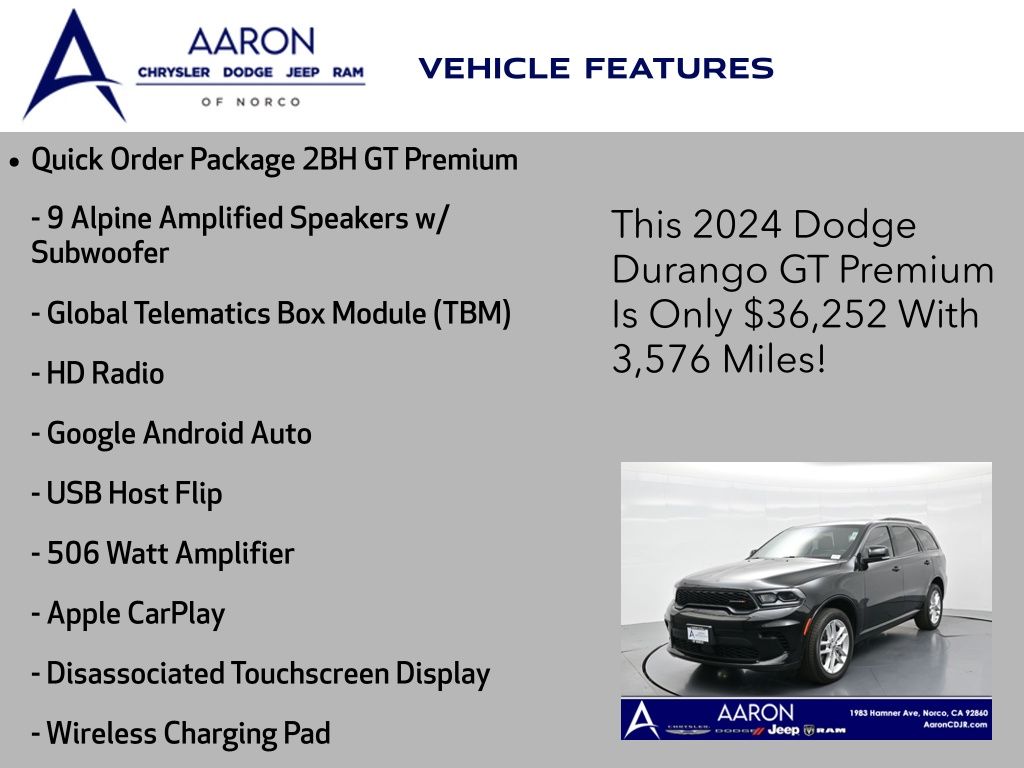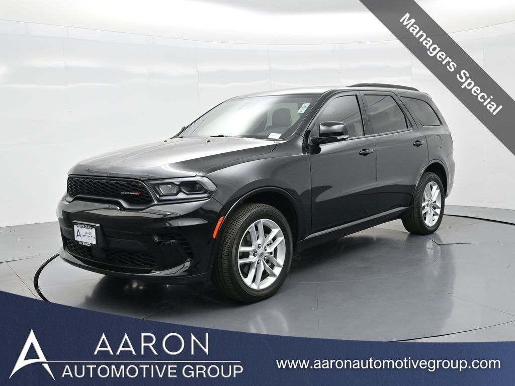 Style, strength, and spaciousness come together in this practically new 2024 Dodge Durango GT Premium AWD, a three-row SUV that delivers muscle-car spirit with full-family utility. With just 3,576 miles, a clean 2-owner Carfax, no accidents reported, personal-use history, and regular oil changes, this exceptionally maintained Durango is ready to offer years of comfort, confidence, and capability. Under the hood, the proven 3.6L Pentastar V6 engine is mated to an 8-speed automatic transmission, sending power to all four wheels through an intelligent all-wheel drive system for sure-footed traction in all conditions. Rated at 21 MPG combined (18 city / 25 highway), the Durango balances performance with efficiency, making it ideal for family road trips, commutes, or weekend adventures. Finished in Diamond Black Crystal Pearl-Coat with 20-inch Satin Carbon wheels, LED lighting, dual exhaust with bright tips, and body-color grille and bumpers, this GT Premium makes a bold first impression. Inside, the refined cabin features Black leather-trimmed seating, heated front and second-row seats, a heated leather-wrapped steering wheel, 8-way power driver and passenger seats with memory, tri-zone climate control, and seating for up to 6 with second-row captains chairs. The 10.1-inch Uconnect touchscreen with Apple CarPlay, Android Auto, navigation, SiriusXM, and Alpine 9-speaker audio system brings next-gen connectivity to every seat. Additional features include a wireless charging pad, remote start, universal garage door opener, power liftgate, and ParkView rear backup camera with ParkSense front and rear assist. Safety is comprehensive with Forward Collision Warning Plus, Adaptive Cruise Control with Stop, Lane Departure Warning, Blind Spot Monitoring, and Rain Brake Support, keeping your family protected on every drive. With power folding heated mirrors, sun visors with illuminated vanity mirrors, and memory settings for driver preferences, the details are what truly make this Durango feel premium. Backed by Dodges 5-year/60,000-mile powertrain warranty, this low-mileage GT Premium offers the luxury, space, and power your family deserves. If you're looking for a vehicle that can keep up with your family's lifestyle while keeping them comfortable and entertained, the Durango GT Premium is a choice you can feel great about, because every mile should feel like home.