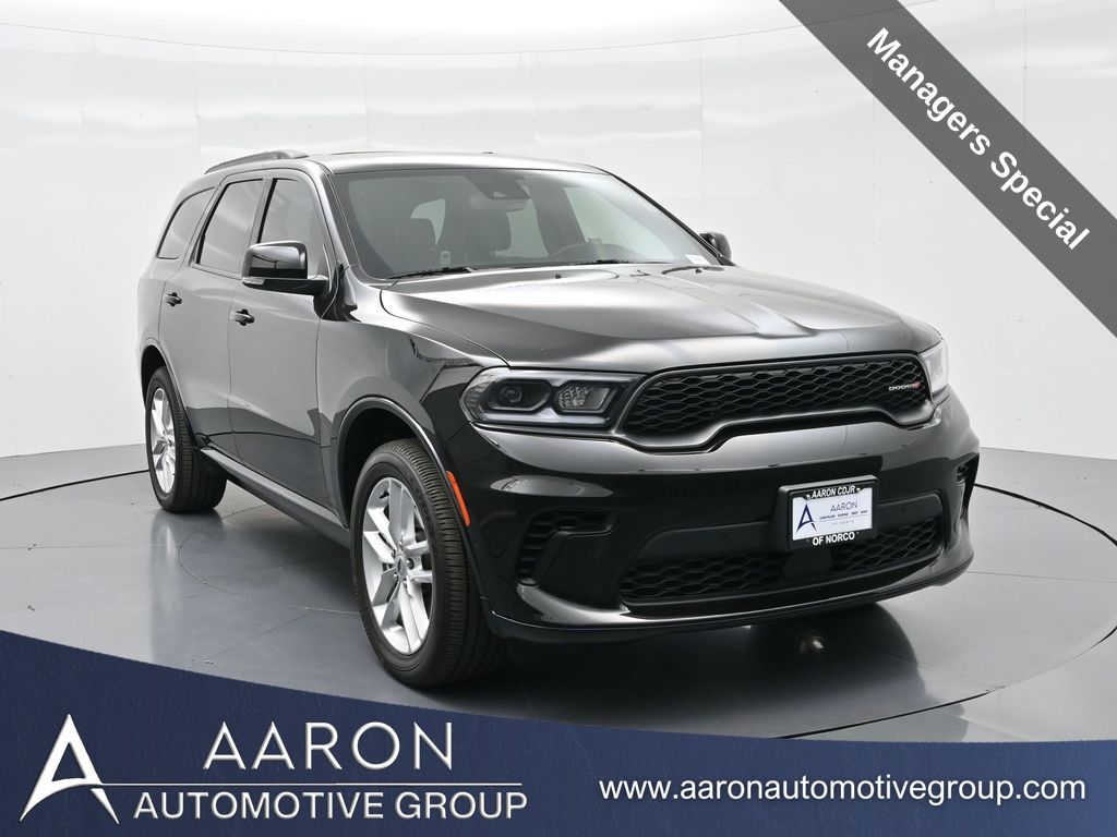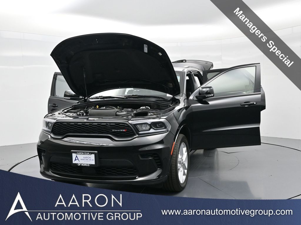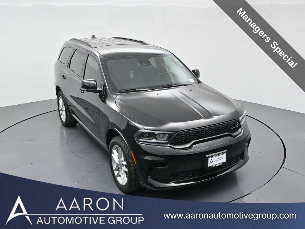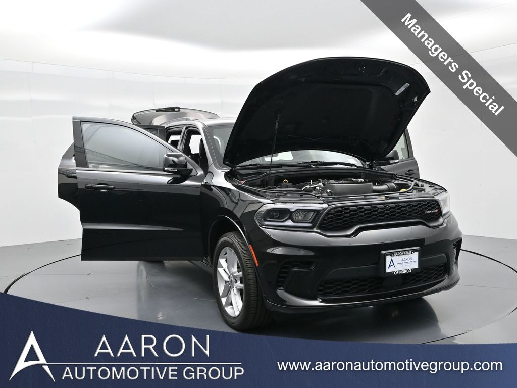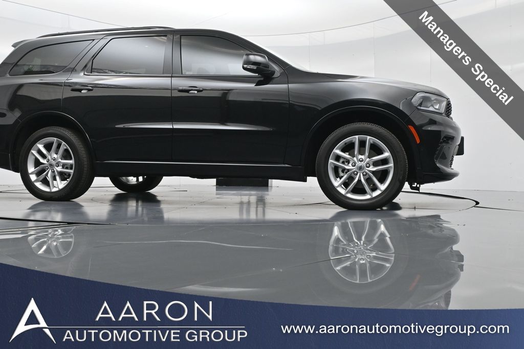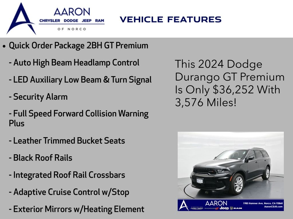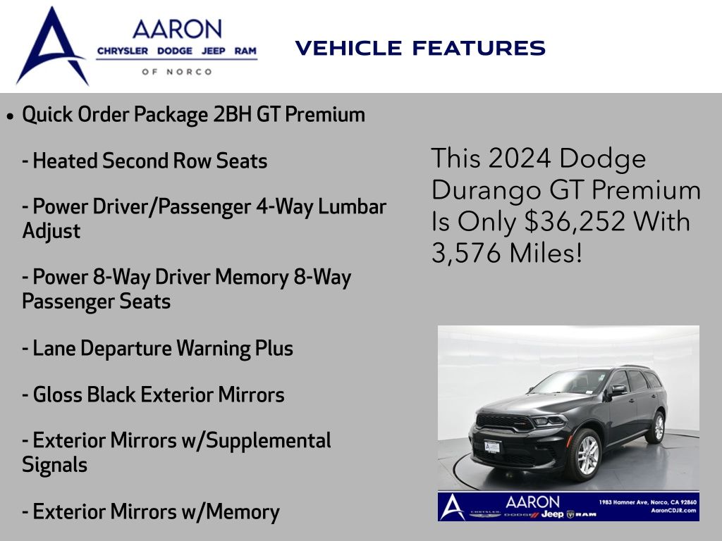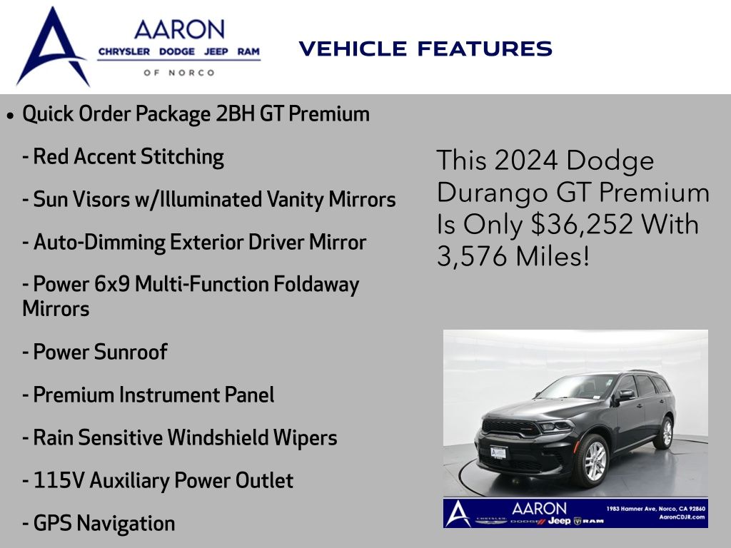 Style, strength, and spaciousness come together in this practically new 2024 Dodge Durango GT Premium AWD, a three-row SUV that delivers muscle-car spirit with full-family utility. With just 3,576 miles, a clean 2-owner Carfax, no accidents reported, personal-use history, and regular oil changes, this exceptionally maintained Durango is ready to offer years of comfort, confidence, and capability. Under the hood, the proven 3.6L Pentastar V6 engine is mated to an 8-speed automatic transmission, sending power to all four wheels through an intelligent all-wheel drive system for sure-footed traction in all conditions. Rated at 21 MPG combined (18 city / 25 highway), the Durango balances performance with efficiency, making it ideal for family road trips, commutes, or weekend adventures. Finished in Diamond Black Crystal Pearl-Coat with 20-inch Satin Carbon wheels, LED lighting, dual exhaust with bright tips, and body-color grille and bumpers, this GT Premium makes a bold first impression. Inside, the refined cabin features Black leather-trimmed seating, heated front and second-row seats, a heated leather-wrapped steering wheel, 8-way power driver and passenger seats with memory, tri-zone climate control, and seating for up to 6 with second-row captains chairs. The 10.1-inch Uconnect touchscreen with Apple CarPlay, Android Auto, navigation, SiriusXM, and Alpine 9-speaker audio system brings next-gen connectivity to every seat. Additional features include a wireless charging pad, remote start, universal garage door opener, power liftgate, and ParkView rear backup camera with ParkSense front and rear assist. Safety is comprehensive with Forward Collision Warning Plus, Adaptive Cruise Control with Stop, Lane Departure Warning, Blind Spot Monitoring, and Rain Brake Support, keeping your family protected on every drive. With power folding heated mirrors, sun visors with illuminated vanity mirrors, and memory settings for driver preferences, the details are what truly make this Durango feel premium. Backed by Dodges 5-year/60,000-mile powertrain warranty, this low-mileage GT Premium offers the luxury, space, and power your family deserves. If you're looking for a vehicle that can keep up with your family's lifestyle while keeping them comfortable and entertained, the Durango GT Premium is a choice you can feel great about, because every mile should feel like home.