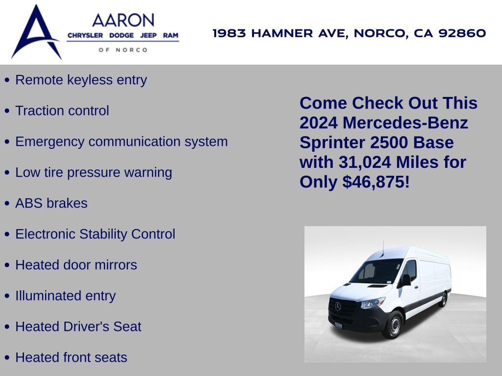 Purpose-built for commercial strength and long-haul dependability, this 2024 Mercedes-Benz Sprinter 2500 170" High Roof Diesel Cargo Van redefines what it means to move with professionalism, power, and precision. With just 31,024 miles and a clean Carfax showing one-owner history and consistent maintenance, this Arctic White Sprinter offers immense value for any business looking to elevate logistics, delivery, or service operations. Powered by a fuel-efficient 2.0L 4-cylinder high-output turbo diesel engine mated to a 9-speed automatic transmission, this rear-wheel-drive van provides robust torque and dependable performance while maximizing long-term durability and cost-efficiency. Configured with the extended 170" wheelbase, this van delivers serious cargo capacity, complemented by the Heavy-Duty Cargo Protection Package, which includes wood flooring with six D-rings, side wall paneling, loadable wheel arch, and multiple cargo lashing rails (floor level, head height, and waist level), making interior organization seamless and secure. Premium upgrades include the Parking Package with a 360-degree camera, Rain Sensor, Electric Parking Brake, Trailer Hitch, and the Premium Plus Package, featuring the advanced 10.25" MBUX touchscreen infotainment system with navigation, Traffic Sign Assist, tray for smartphone wireless charging, leather steering wheel, and Active Lane Keeping Assist. Additional features such as Attention Assist, hinged storage compartments, 115V socket, wet wiper system, digital owner's manual, and 12V outlets add a touch of comfort and functionality to daily operations. With a maximum payload of 3,737 lbs, 5,000 lbs towing capacity, a 24.5-gallon fuel tank, 3.923 rear axle ratio, and solid axle suspension with leaf springs, this Sprinter is ready to tackle demanding schedules with confidence. Safety is enhanced with active brake assist, crosswind assist, daytime running lights, and side impact airbags for both rows. Whether you're building out a fleet or upgrading your operations reliability, this 2024 Sprinter 2500 is engineered to meet the needs of todays businesses. Efficient, smart, and built to go the distance. Come see why so many commercial professionals trust the Mercedes-Benz badge to power their success.
