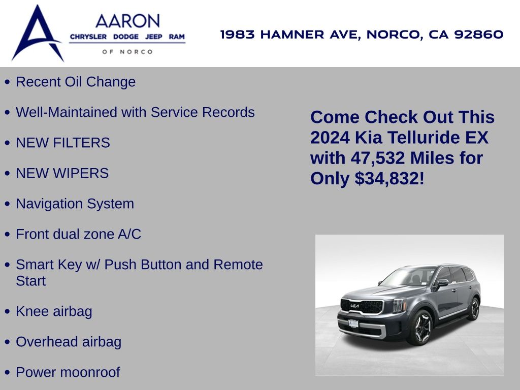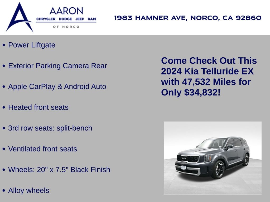 This 2024 Kia Telluride EX in Gravity Gray offers a refined balance of modern design, advanced safety, and family-friendly versatility. Powered by a 3.8L DOHC V6 with dual CVVT paired to an 8-speed automatic transmission, it delivers confident performance with an EPA-estimated 20 MPG city and 26 MPG highway. The EX trim elevates comfort with leather seat trim, heated front seats, a power-adjustable drivers seat with 2-way lumbar support, dual-zone automatic climate control, and a leather-wrapped steering wheel. The interior also features a premium infotainment system with a 12.3-inch touchscreen, navigation, Apple CarPlay, Android Auto, Bluetooth, and a wireless phone charger. Thoughtful details like Smart Power Tailgate, Smart Key with push-button start, and a 10-way power drivers seat enhance convenience, while the second-row captains chairs and sliding/reclining third row make it easy to accommodate passengers or cargo. Safety technology includes Forward Collision-Avoidance Assist, Blind-Spot View Monitor, Highway Driving Assist, Lane Keeping Assist, and Rear Cross-Traffic Collision-Avoidance Assist, providing peace of mind on every trip. Exterior highlights include LED headlights, black finish 20-inch alloy wheels, body-color door handles, and silver roof rails. With 47,532 miles, a clean CARFAX 1-owner history, and a full suite of comfort and technology features, this Telluride EX is ready to provide years of reliable service. Offering a spacious cabin, upscale amenities, and strong value, this Kia Telluride is perfect for families and adventurers alike. Experience it today and see why its one of the most awarded SUVs in its class.
