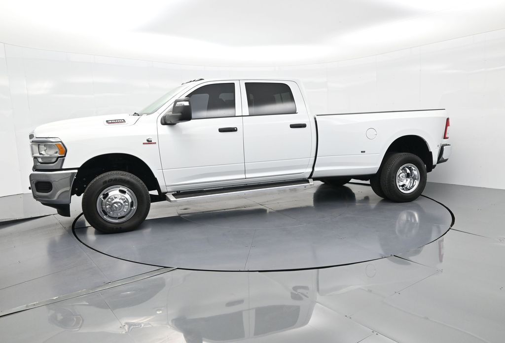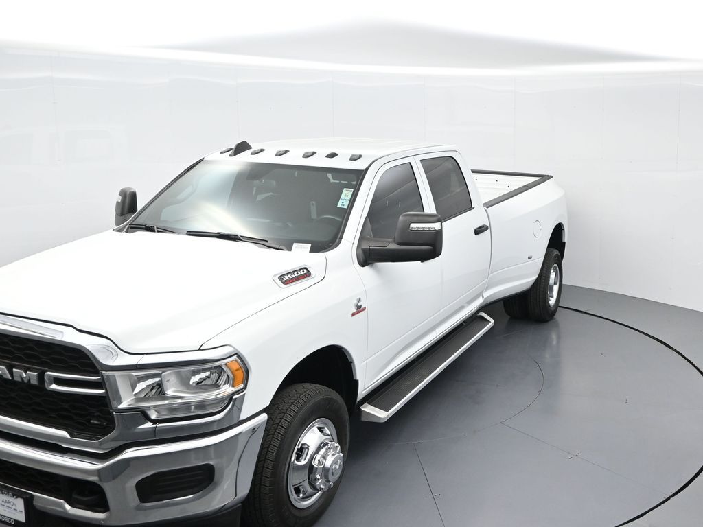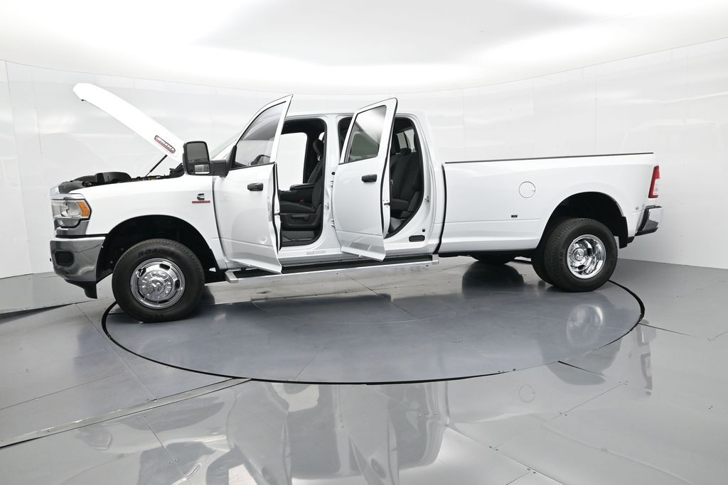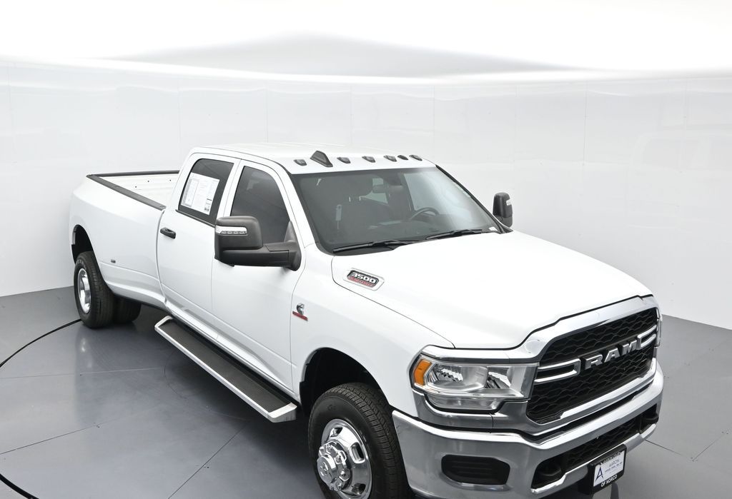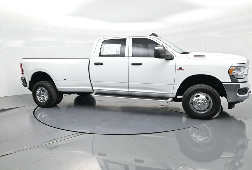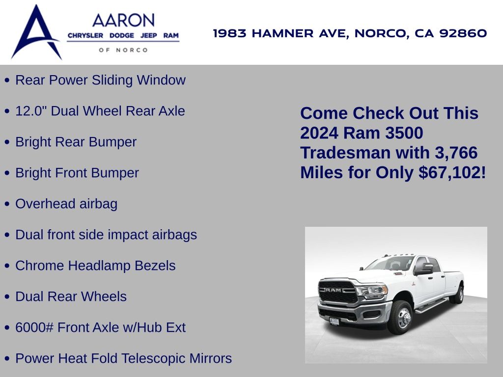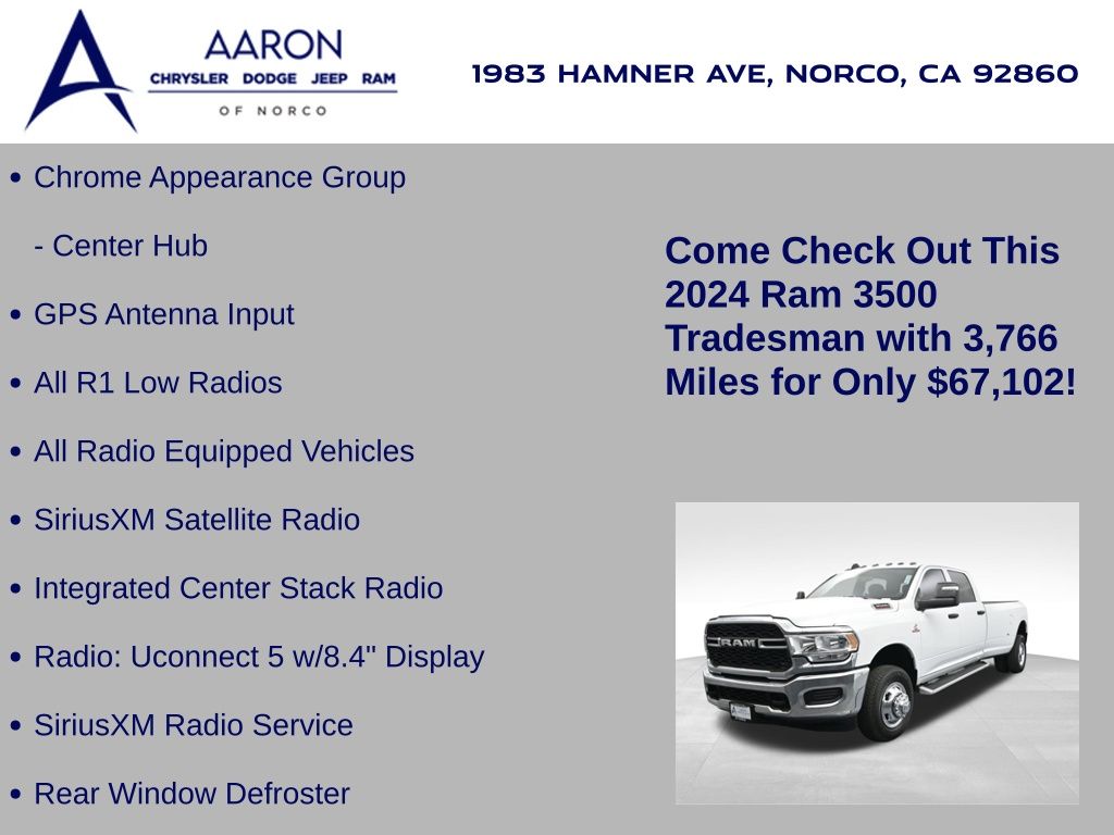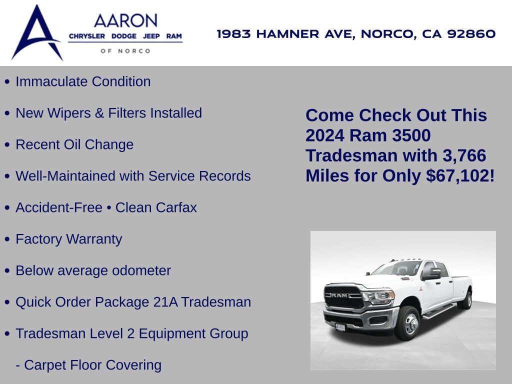 This 2024 Ram 3500 Tradesman Crew Cab 4x4 in Bright White Clearcoat is built to tackle the toughest jobs with uncompromising power, durability, and utility. Equipped with the legendary 6.7L Cummins Turbo Diesel I6 engine paired with the AISIN heavy-duty 6-speed automatic transmission, this truck delivers exceptional torque and towing capacity, making it ideal for hauling heavy loads, trailers, or equipment. The 4x4 drivetrain with an electronic shift-on-the-fly transfer case, anti-spin rear differential, and LT235/80R17 all-season tires ensures confident traction across various terrains. The truck is configured with the Chrome Appearance Group, adding chrome bumpers and grille for a polished, professional look, while the Tradesman Level 2 Equipment Group enhances functionality with features like an 8.4-inch Uconnect infotainment system, Apple CarPlay, Android Auto, SiriusXM, premium cloth seating, carpeted floors, remote keyless entry, and power windows and locks. Practical work-ready features include a spray-in bedliner, LED bed lighting, Class V receiver hitch, trailer brake controller, tow hooks, clearance lamps, power-folding trailer tow mirrors with heating, and a rear backup camera. Inside, the cabin offers a comfortable, well-equipped workspace with air conditioning, a 40/20/40 split-bench front seat, ample storage, and multiple USB and 12V power outlets. Safety is backed by multistage airbags, stability control, hill start assist, and tire pressure monitoring. With only 3,766 miles and a clean 1-owner CARFAX history, this Ram 3500 is virtually new and still under factory warranty. Designed to meet the needs of serious professionals, it combines legendary Cummins diesel performance with a comfortable, functional interiorperfect for commercial use, agriculture, construction, or heavy-duty recreational towing. If you need a dependable workhorse with the muscle to handle extreme demands, this Ram 3500 Tradesman is ready to deliver. Come see it today and experience capability without compromise.