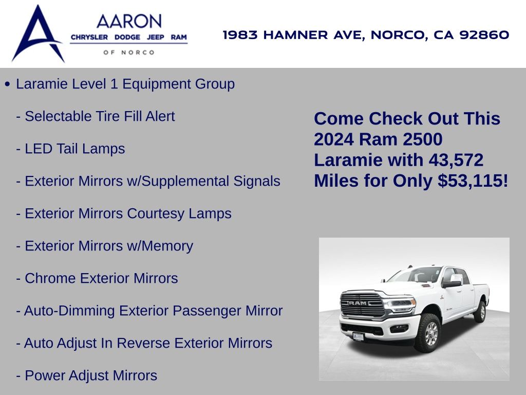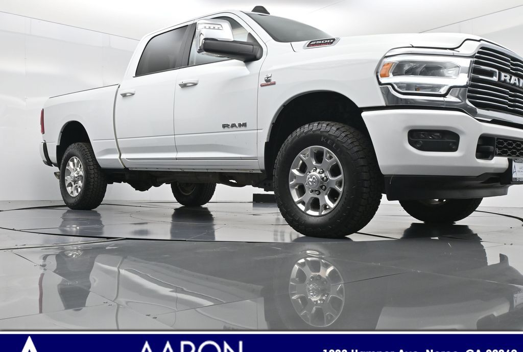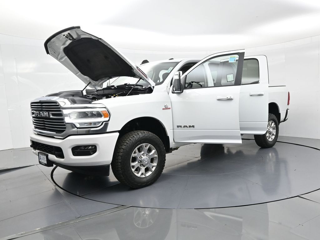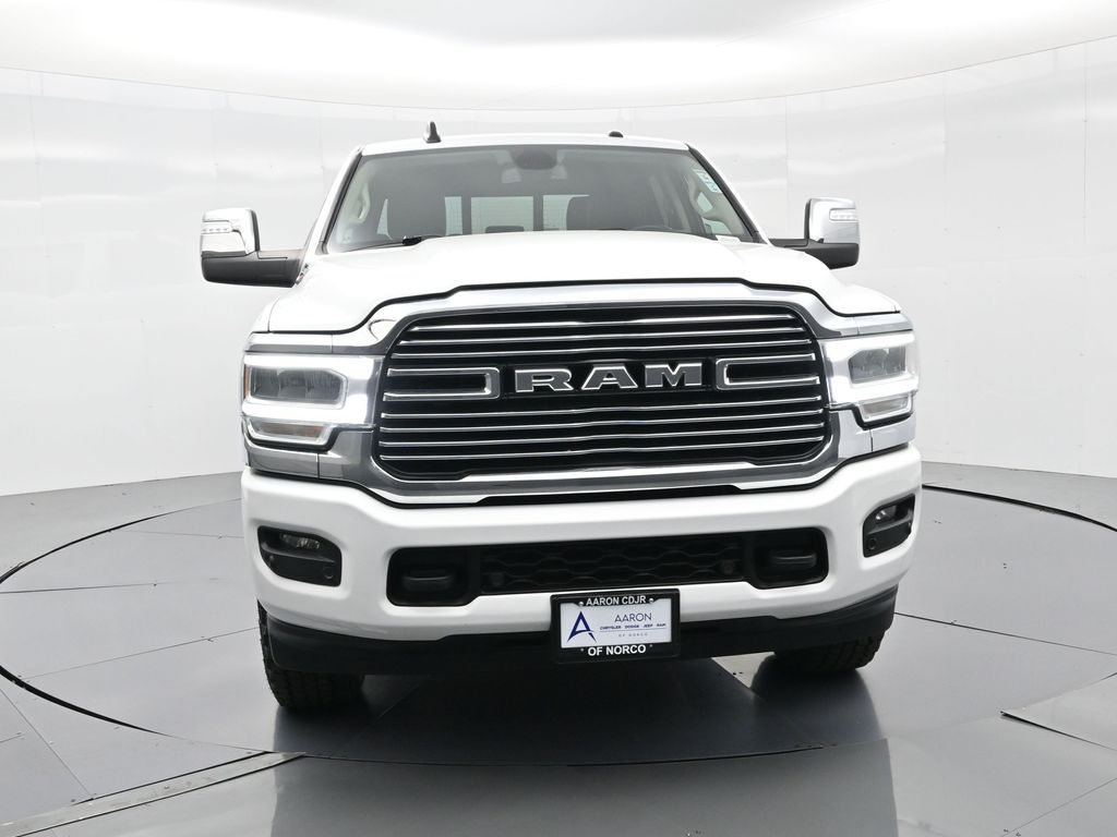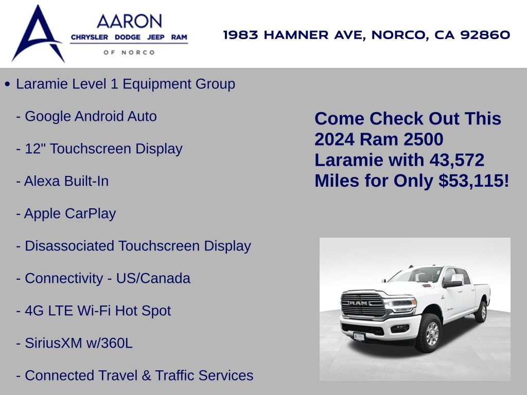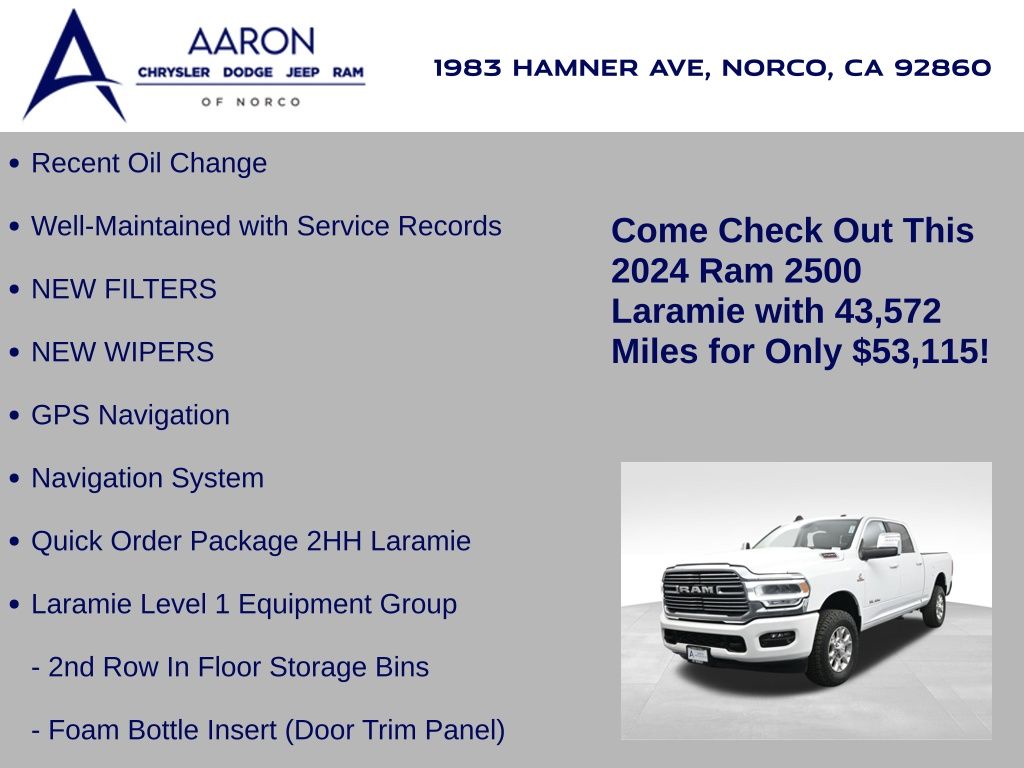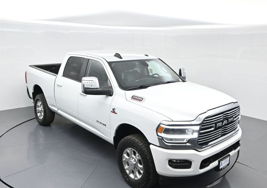 This 2024 Ram 2500 Laramie Crew Cab 4x4 in Bright White Clearcoat is a heavy-duty pickup that blends uncompromising capability with refined comfort and advanced technology. Under the hood, the legendary 6.7L Cummins Turbo Diesel I6 engine paired with a 6-speed automatic transmission delivers immense torque for towing and hauling, supported by a Class V receiver hitch, integrated trailer brake controller, and trailer reverse guidance for confident handling of large loads. The 4x4 drivetrain, anti-spin rear differential, and HD suspension with front and rear stabilizer bars ensure traction and stability in all conditions. The Laramie trim exudes style and functionality with chrome bumpers and grille, LED lighting, tow hooks, power-folding trailer tow mirrors with memory, and 18-inch polished aluminum wheels wrapped in LT275/70R18 all-terrain tires. Inside, the cabin offers heated and ventilated leather-trimmed front seats, heated rear seats, a heated leather-wrapped steering wheel, dual-zone automatic climate control, power-adjustable pedals with memory, and a power driver seat with lumbar support. The Uconnect 12-inch touchscreen infotainment system includes Apple CarPlay, Android Auto, Bluetooth, navigation, and premium Alpine audio. Convenience is enhanced with remote start, keyless enter n go, multiple USB and 115V outlets, and abundant storage options, including rear under-seat compartments. Safety features include ParkSense front and rear park assist, blind spot monitoring with cross-path detection, and a rear backup camera. With 43,572 miles and a clean 1-owner CARFAX history, this Laramie is well-maintained and still within factory coverage. Perfect for both work and leisure, this Ram 2500 offers the strength and dependability to handle demanding jobs while surrounding you with comfort and premium features. Experience the unmatched blend of capability and luxury today!