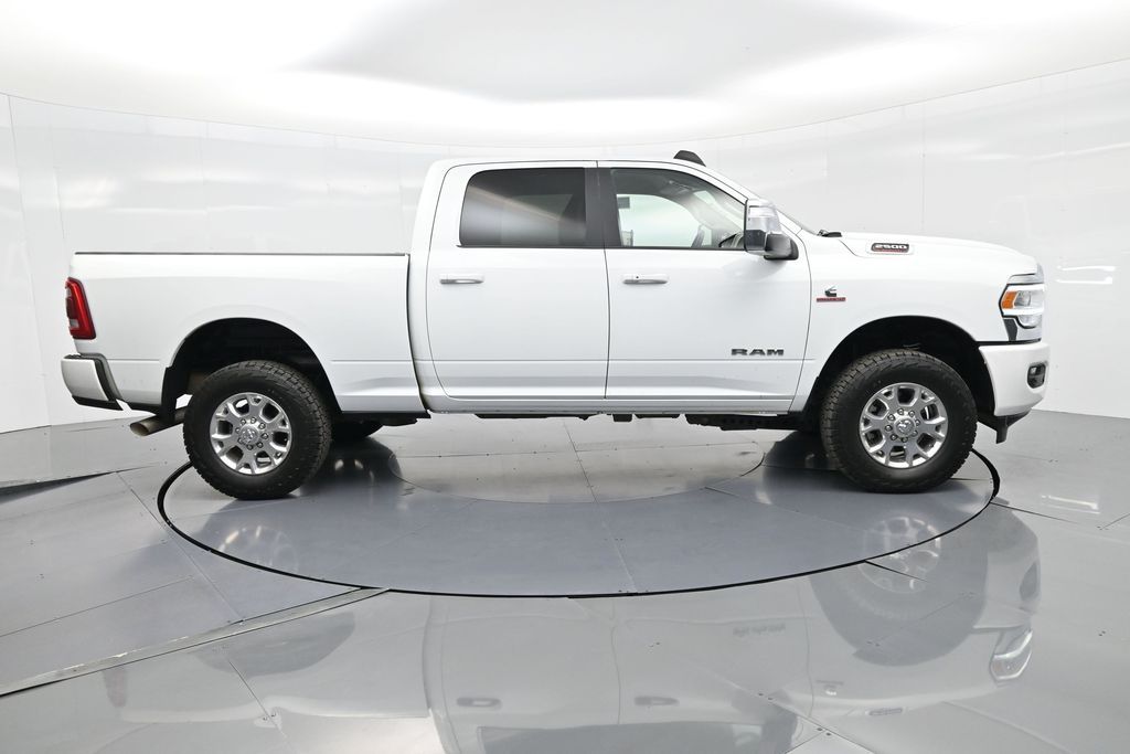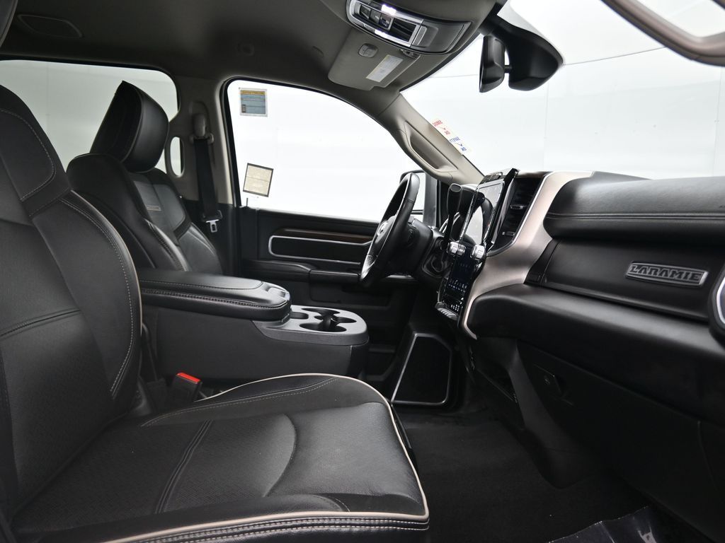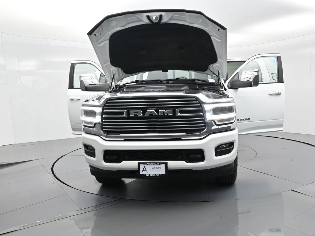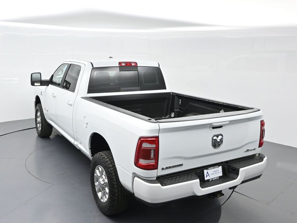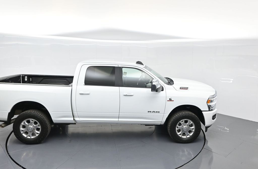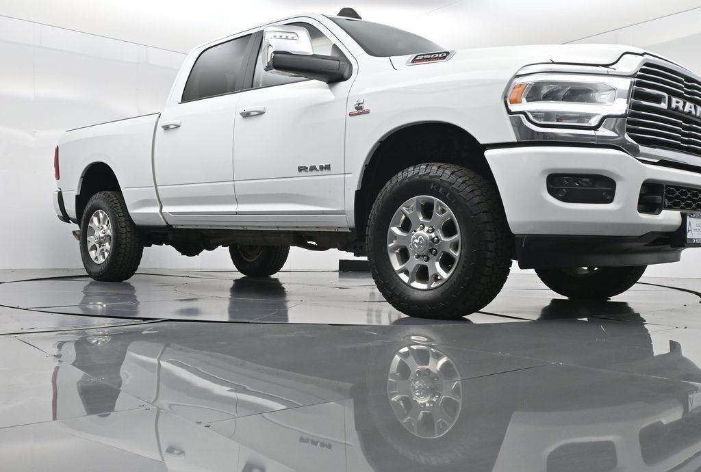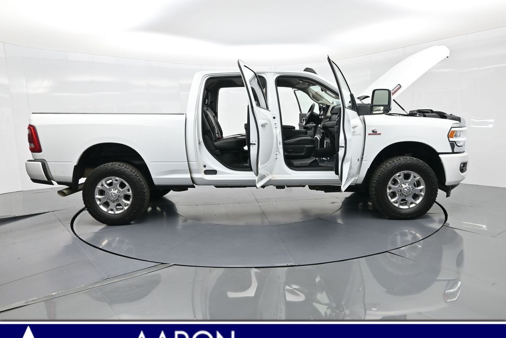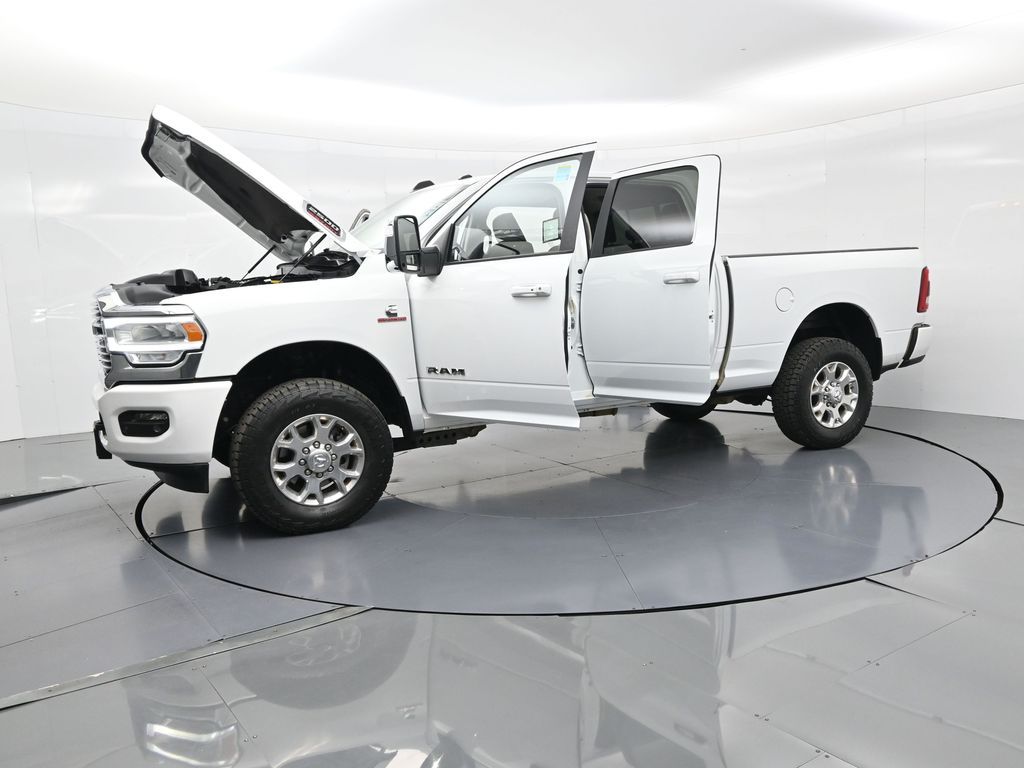 This 2024 Ram 2500 Laramie Crew Cab 4x4 in Bright White Clearcoat is a heavy-duty pickup that blends uncompromising capability with refined comfort and advanced technology. Under the hood, the legendary 6.7L Cummins Turbo Diesel I6 engine paired with a 6-speed automatic transmission delivers immense torque for towing and hauling, supported by a Class V receiver hitch, integrated trailer brake controller, and trailer reverse guidance for confident handling of large loads. The 4x4 drivetrain, anti-spin rear differential, and HD suspension with front and rear stabilizer bars ensure traction and stability in all conditions. The Laramie trim exudes style and functionality with chrome bumpers and grille, LED lighting, tow hooks, power-folding trailer tow mirrors with memory, and 18-inch polished aluminum wheels wrapped in LT275/70R18 all-terrain tires. Inside, the cabin offers heated and ventilated leather-trimmed front seats, heated rear seats, a heated leather-wrapped steering wheel, dual-zone automatic climate control, power-adjustable pedals with memory, and a power driver seat with lumbar support. The Uconnect 12-inch touchscreen infotainment system includes Apple CarPlay, Android Auto, Bluetooth, navigation, and premium Alpine audio. Convenience is enhanced with remote start, keyless enter n go, multiple USB and 115V outlets, and abundant storage options, including rear under-seat compartments. Safety features include ParkSense front and rear park assist, blind spot monitoring with cross-path detection, and a rear backup camera. With 43,572 miles and a clean 1-owner CARFAX history, this Laramie is well-maintained and still within factory coverage. Perfect for both work and leisure, this Ram 2500 offers the strength and dependability to handle demanding jobs while surrounding you with comfort and premium features. Experience the unmatched blend of capability and luxury today!