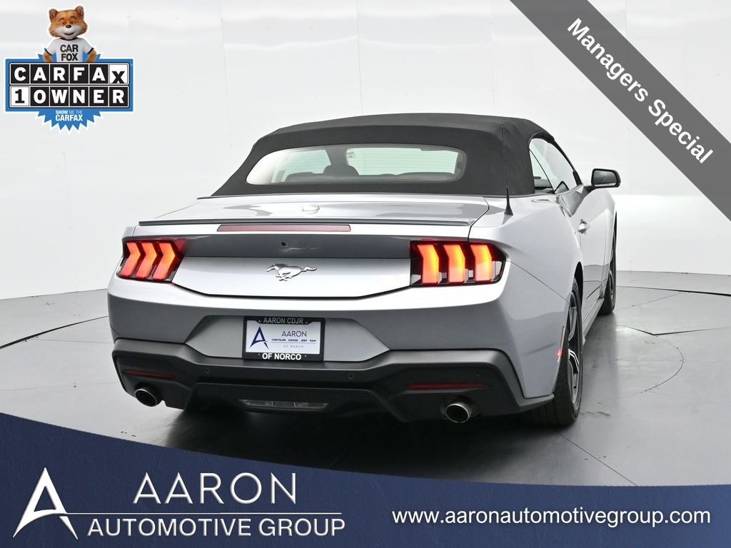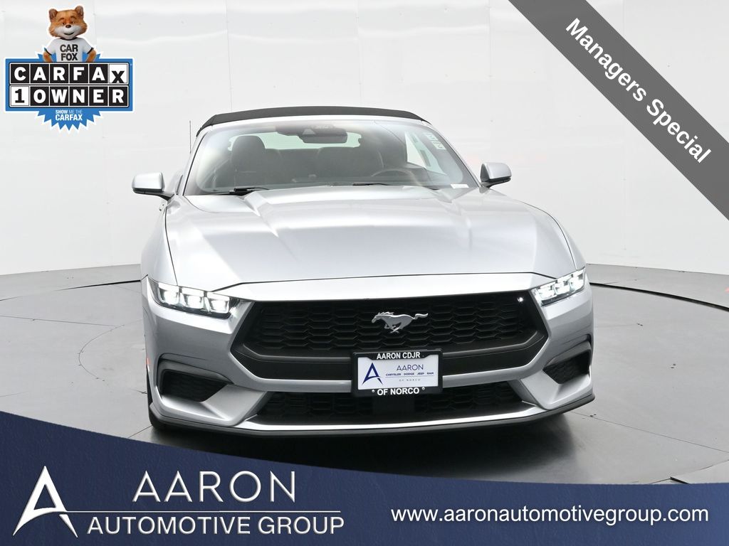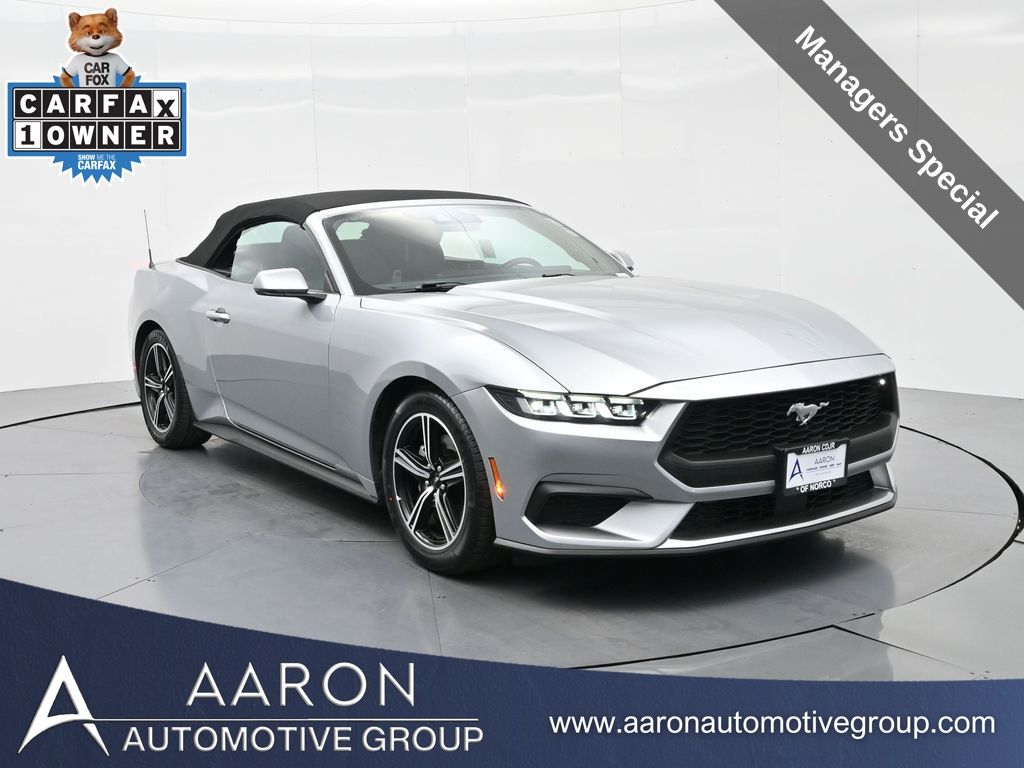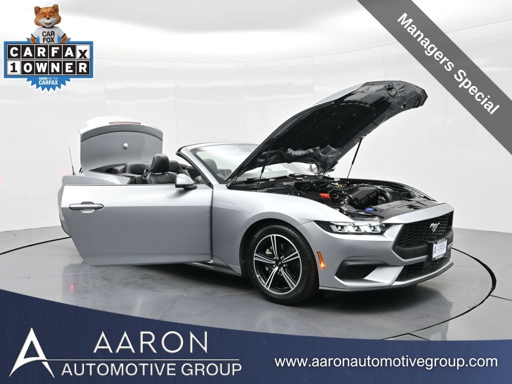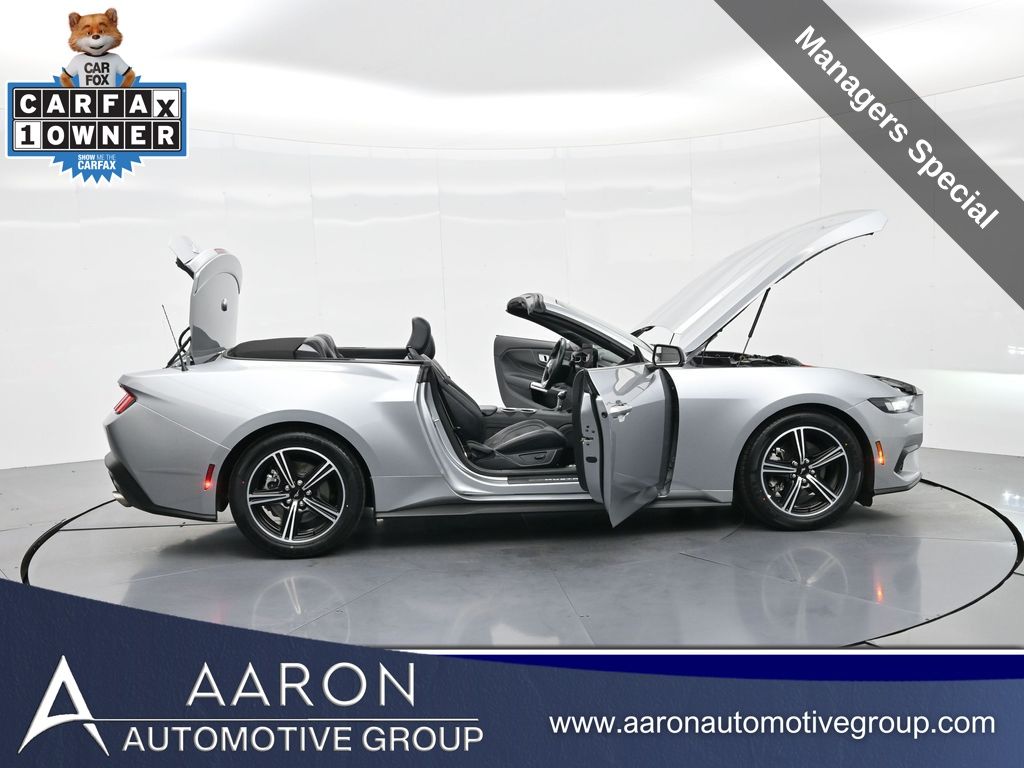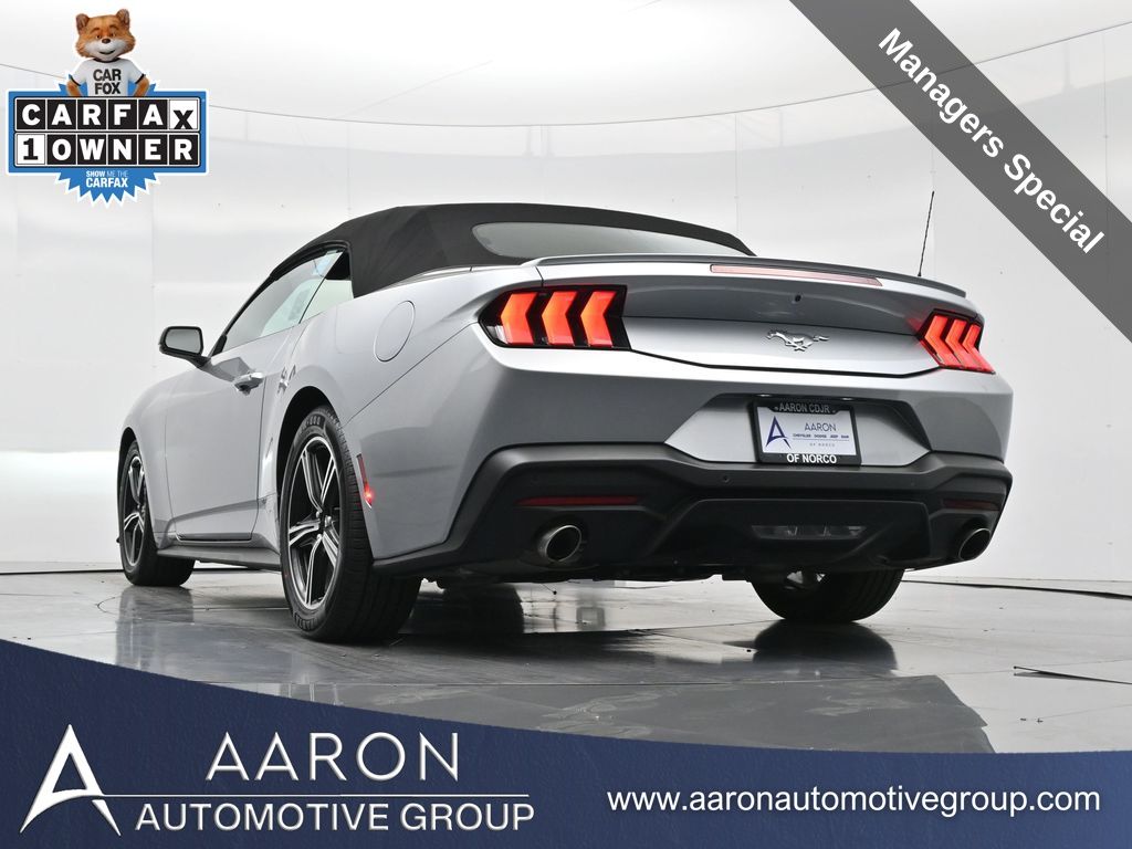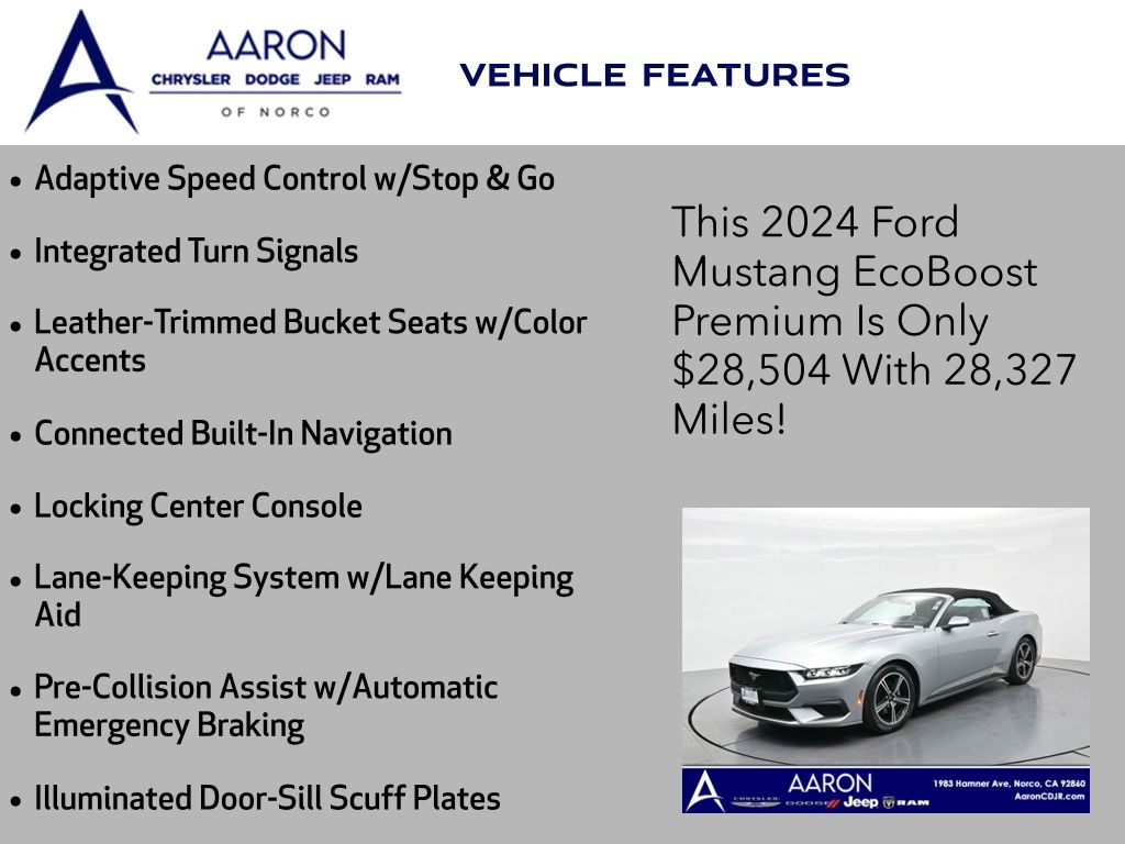 Experience the thrill of open-air driving in this 2024 Ford Mustang EcoBoost Premium Convertible, a modern American icon that blends bold styling with refined comfort and technology. Powered by a 2.3L EcoBoost I4 engine delivering 315 horsepower and paired to a smooth 10-speed automatic transmission, this Mustang offers responsive power with an impressive 26 MPG combined. Finished in Iconic Silver Metallic with a Black Onyx leather-trimmed interior, it features the Premium Package with a power soft top, 19-inch alloy wheels, and a 12.4-inch digital cluster. Inside, youll find heated and cooled front seats, ambient lighting, dual-zone automatic climate control, and Fords SYNC 4 infotainment system with a 13.2-inch touchscreen, Apple CarPlay, Android Auto, and integrated navigation. Premium touches continue with a 12-speaker B&O sound system and smart-charging USB ports. Safety is front and center with Ford Co-Pilot360, offering Pre-Collision Assist with Automatic Emergency Braking, Lane-Keeping System, Blind Spot Information System (BLIS), Rear View Camera, and Reverse Sensing System. Additional features include push-button start, Intelligent Access with remote start, Active Noise Control, and a Track Apps suite. This 1-owner, accident-free Mustang has just 28,327 miles and comes with a clean CARFAX history. Whether you're carving through canyon roads or cruising down the coast, this convertible delivers a dynamic driving experience with everyday comfort and standout tech. Don't miss your chance to take home a piece of performance heritage thats ready for every kind of drive. Sunny days are calling.