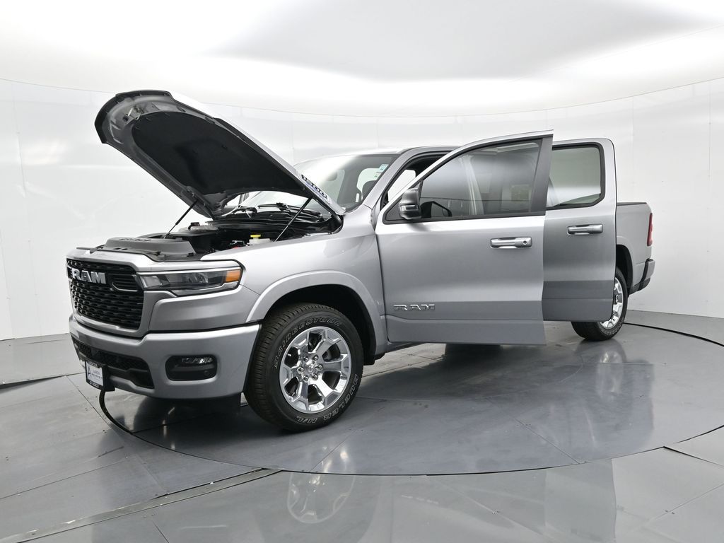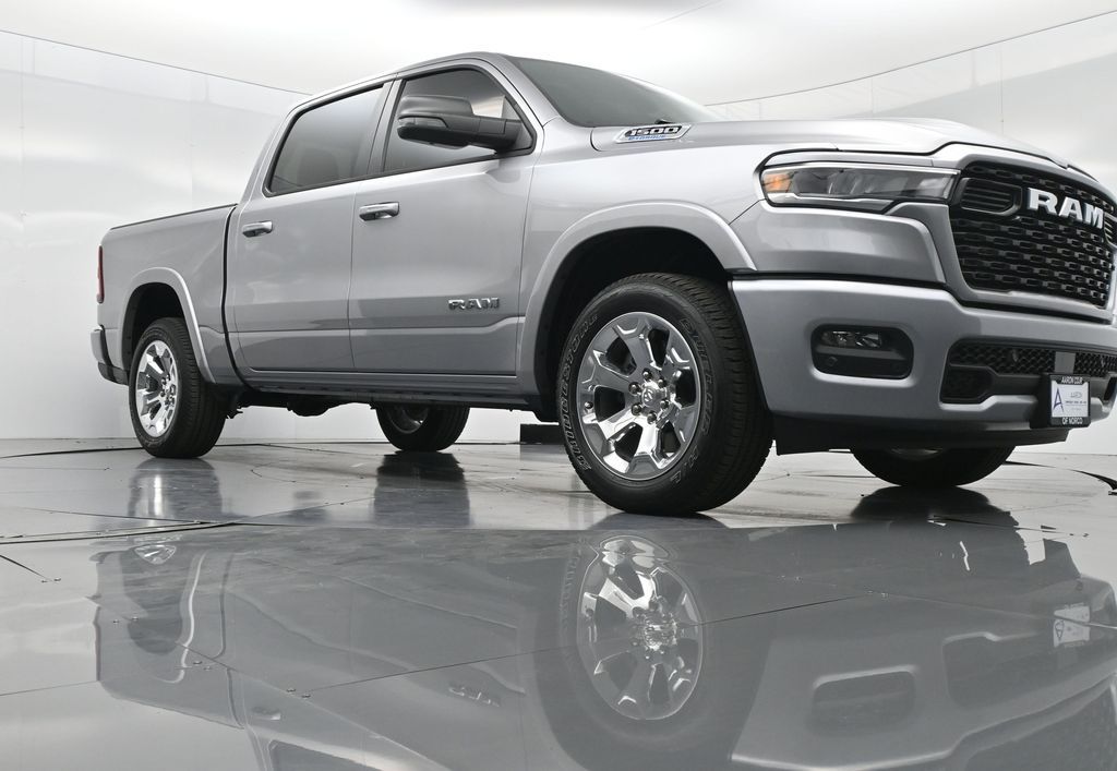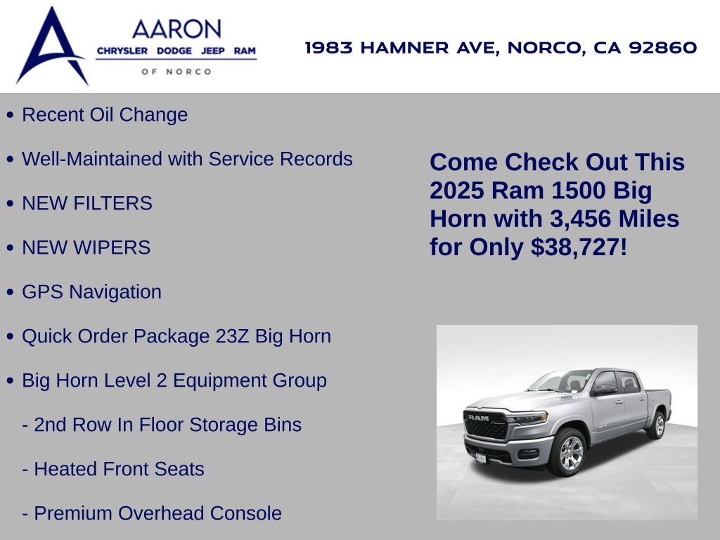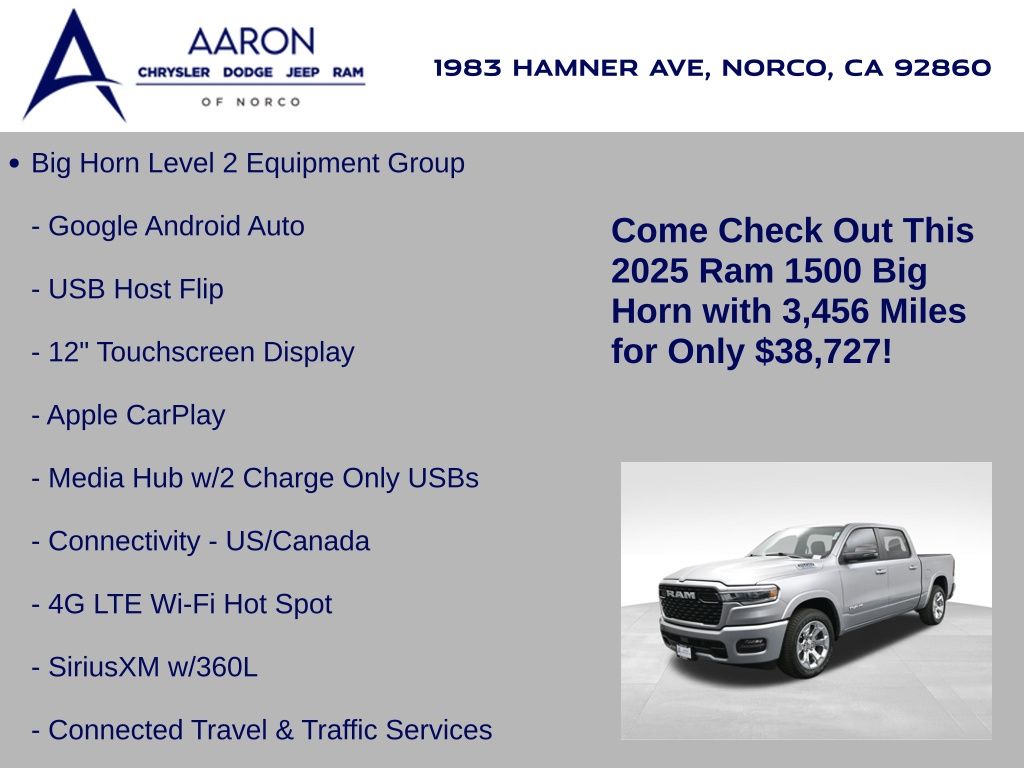 Introducing the bold and refined 2025 Ram 1500 Big Horn Crew Cab 4x2, an exceptionally well-equipped full-size pickup with just 3,456 miles and a spotless 1-owner Carfax history. Powered by the proven 3.6L Pentastar V6 engine with eTorque and paired to a smooth 8-speed automatic transmission, this Ram delivers confident everyday performance with efficiency and reliability. Designed for versatility and comfort, it offers an impressive EPA-estimated 20 MPG city / 25 MPG highway, making it a smart choice for both work and weekend driving. The striking Billet Silver Metallic Clear-Coat exterior is complemented by the optional Sport Appearance Package and Black Interior Accents, giving it a confident and modern stance. Inside, the Big Horn impresses with its spacious Deluxe Cloth Bucket Seat cabin and loaded tech including the upgraded Uconnect 5 NAV system with massive 12-inch touchscreen, wireless Apple CarPlay/Android Auto, integrated navigation, voice command, and SiriusXM 360L with 3-month trial subscription. Stay connected and in control with the 7-inch full-color digital driver display, 115V auxiliary power outlet, and dual-zone auto climate control. Convenience features include remote start, power-sliding rear window, automatic-dimming rearview mirror, and rear under-seat storage bins, while the Heated Front Seats, Heated Steering Wheel, and 8-way Power Driver Seat elevate comfort on colder mornings. This truck is also equipped with the Big Horn Level 2 Equipment Group, bundling advanced driver aids like ParkSense Front & Rear Park-Assist, ParkView Backup Camera, Blind Spot and Cross-Path Detection, and Full-Speed Forward-Collision Warning Plus. Outside, this Ram rides on premium 20-inch polished aluminum wheels with all-season tires, features automatic LED headlamps, chrome grille surround, power-folding heated mirrors, and a factory spray-in bed-liner with a Class IV receiver hitch for towing confidence. The 2025 Ram 1500 Big Horn sets the benchmark for comfort, technology, and performance in a rear-wheel-drive configuration thats ready for everyday driving or weekend towing. Backed by a 5-year/60,000-mile Powertrain Warranty and built for those who demand strength with style, this low-mileage Ram offers unbeatable value and modern capability. Contact us today to schedule a test drive or secure this like-new Big Horn before its gone. Premium full-size pickups in this condition and price point don't last long!