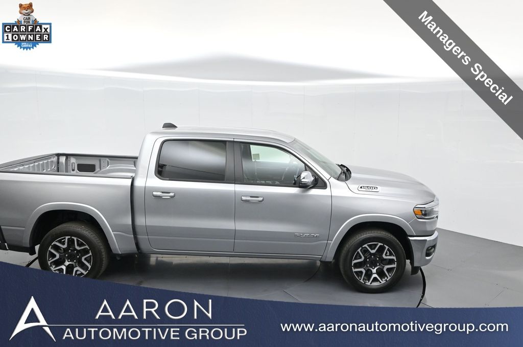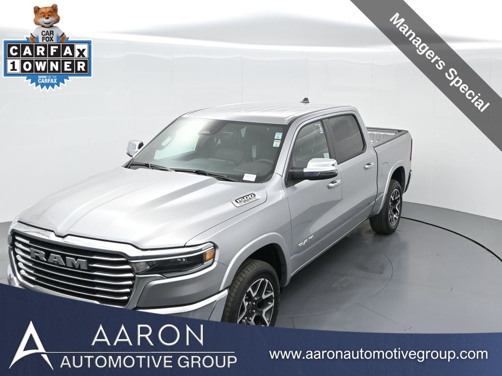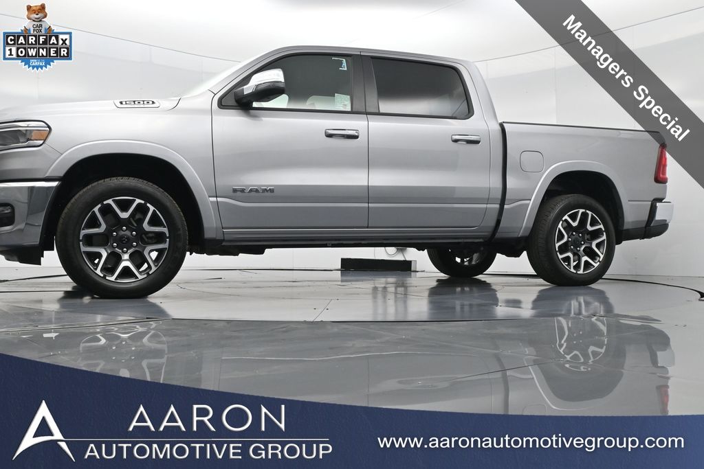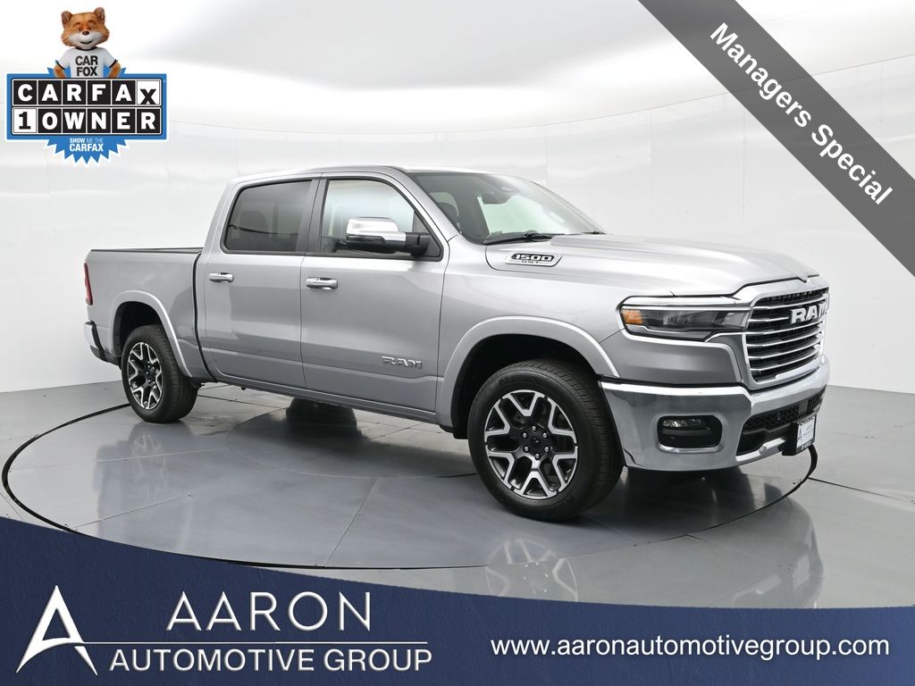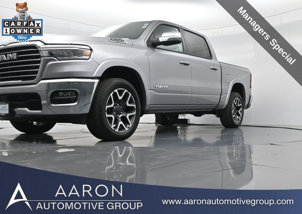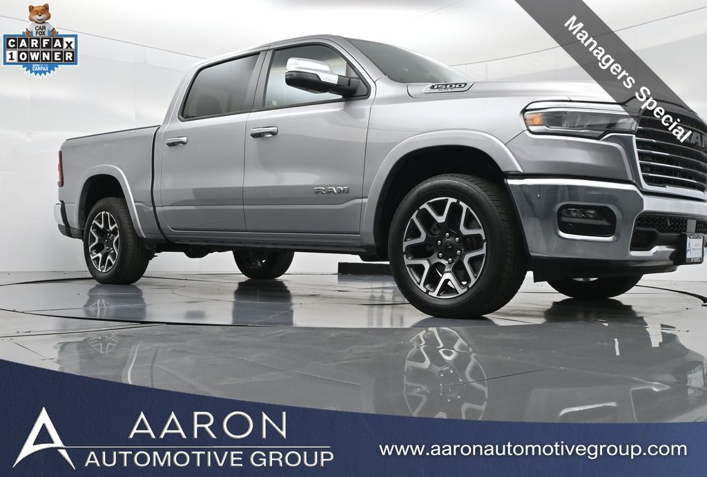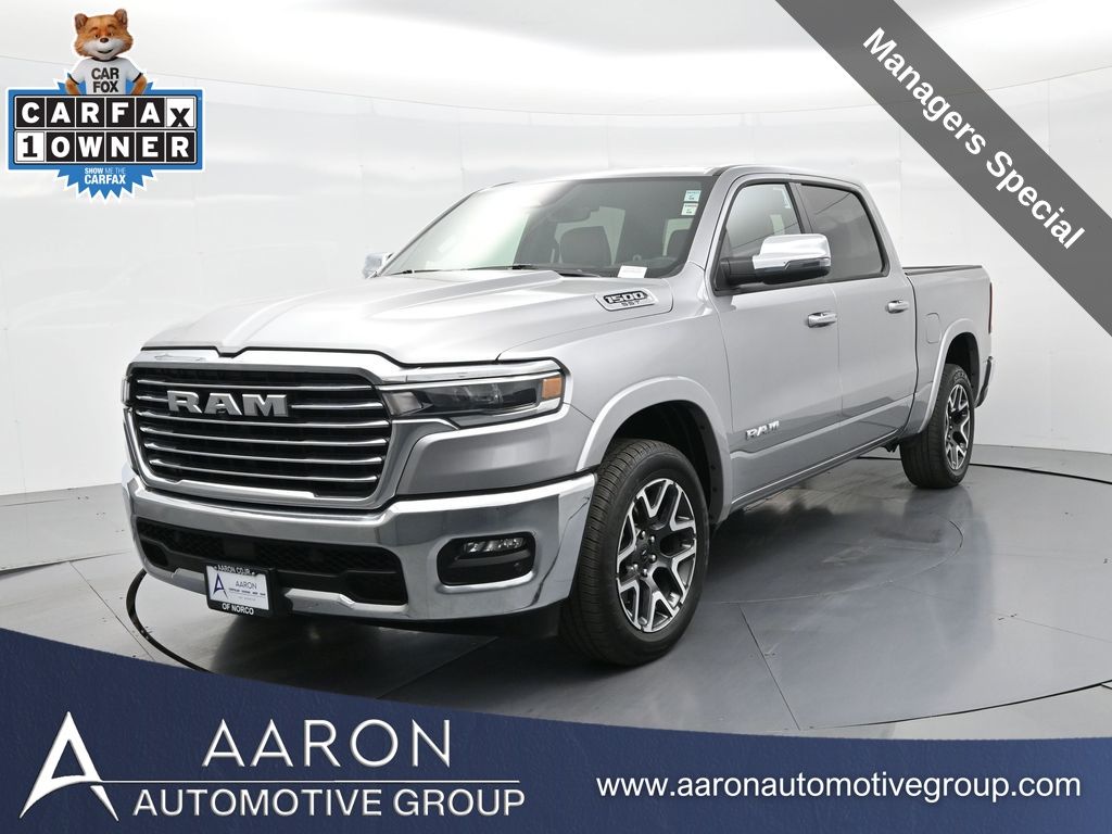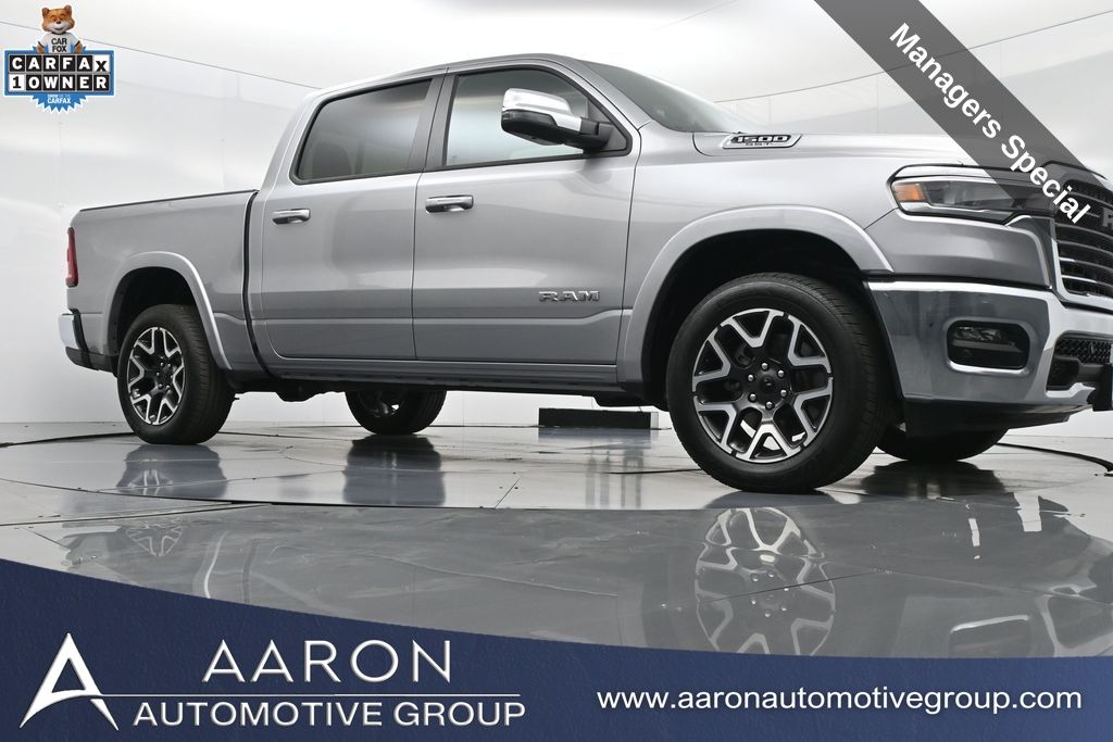 Commanding power, premium refinement, and low-mileage reliability come together in this 2025 Ram 1500 Laramie Crew Cab 4x4, a full-size pickup built for those who demand uncompromising comfort and proven performance. With just 10,840 miles, a clean 1-owner Carfax, no accidents, and documented service history, this nearly new Laramie offers outstanding value and peace of mind. Under the hood, the efficient and robust 3.0L I6 Turbocharged engine is paired with a TorqueFlite 8-speed automatic transmission and on-demand transfer case, delivering smooth acceleration and confident traction in any weather with its intelligent four-wheel-drive system. Rated at an EPA-estimated 19 MPG combined (17 city and 24 highway), this Ram offers solid efficiency for a heavy-duty performer. Dressed in Bright White Clear-Coat Paint with chrome bumpers, 20-inch polished aluminum wheels, LED reflector headlamps, and body-color mirrors, this Laramie looks as sharp as it works. Inside, the cabin is loaded with premium materials and advanced tech, including heated and ventilated leather-trimmed front seats, a 12-inch Uconnect 5 NAV touchscreen, Apple CarPlay, Android Auto, SiriusXM with 360L, 9-amplified speaker Alpine sound system, dual-zone climate control, remote start, power-adjustable pedals, memory driver settings, and a power sliding rear window. Safety features include Full-Speed Forward Collision Warning Plus, Blind Spot and Cross-Path Detection, ParkSense Front and Rear Park Assist, a backup camera, and Rain Brake Support. Added options like the Customer Preferred Package 21H, bed utility group, and anti-spin differential rear axle make this Laramie as practical as it is luxurious. Backed by Rams 5-year/60,000-mile powertrain warranty, this low-mileage truck gives you the peace of mind and confidence you deserve. Whether you're hauling gear, towing heavy loads, or cruising in comfort, this Ram 1500 Laramie is built to exceed expectations. Invest in quality, durability, and craftsmanship that works as hard as you do.