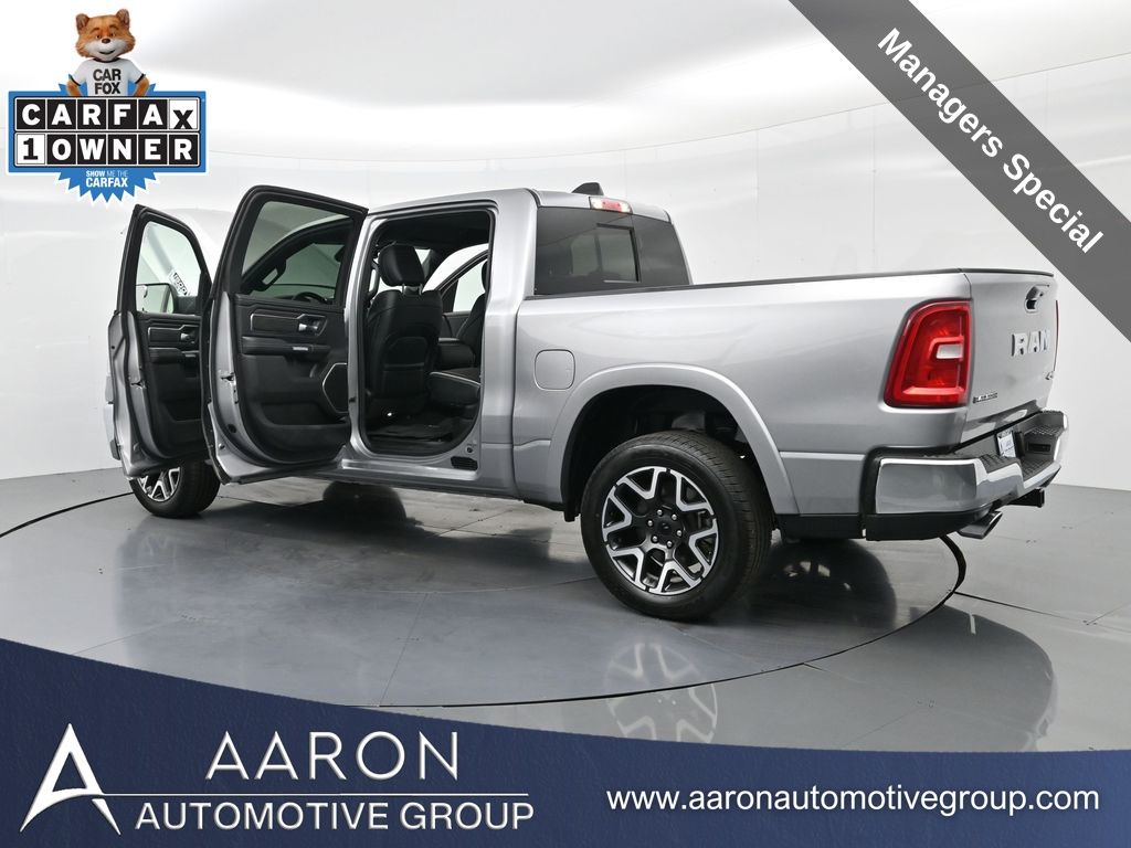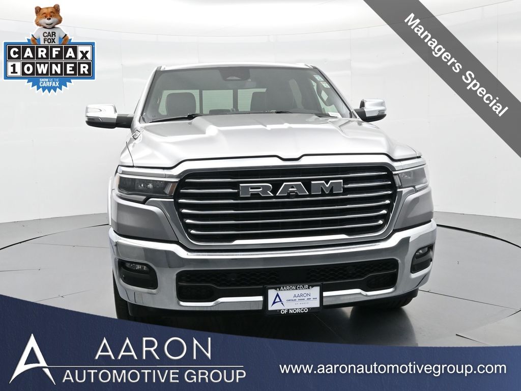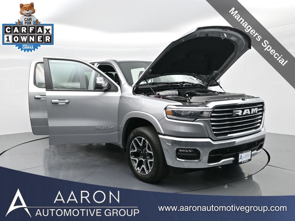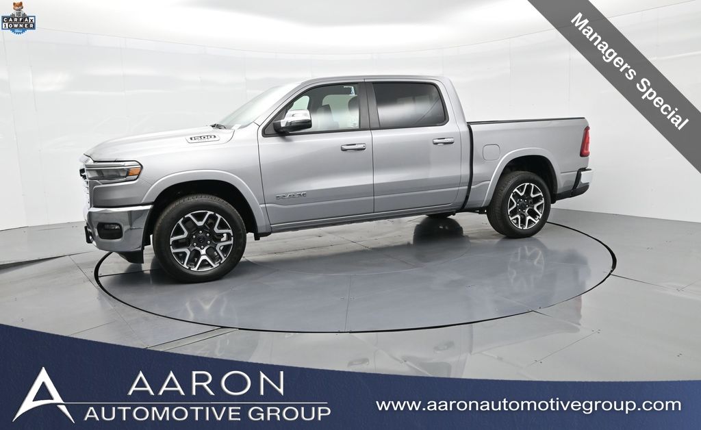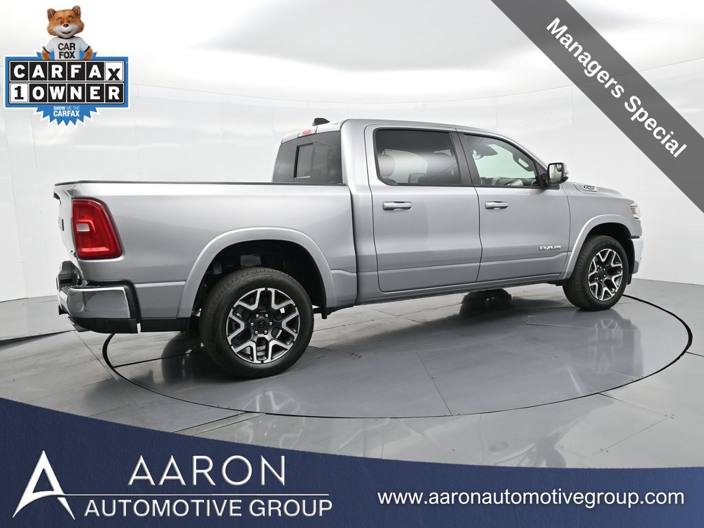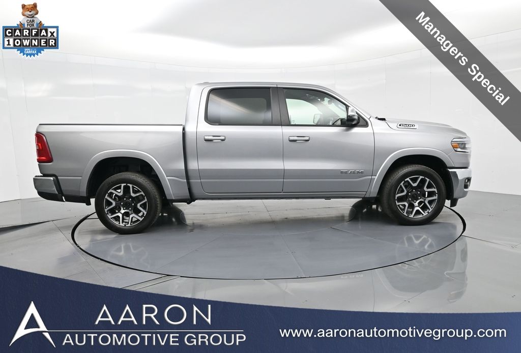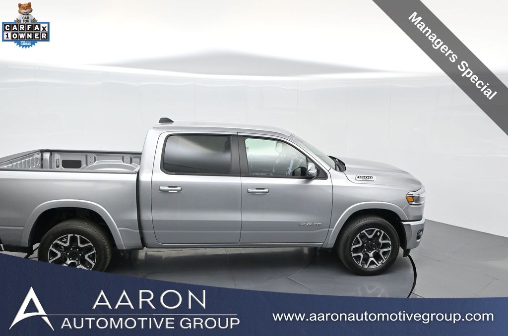 Commanding power, premium refinement, and low-mileage reliability come together in this 2025 Ram 1500 Laramie Crew Cab 4x4, a full-size pickup built for those who demand uncompromising comfort and proven performance. With just 10,840 miles, a clean 1-owner Carfax, no accidents, and documented service history, this nearly new Laramie offers outstanding value and peace of mind. Under the hood, the efficient and robust 3.0L I6 Turbocharged engine is paired with a TorqueFlite 8-speed automatic transmission and on-demand transfer case, delivering smooth acceleration and confident traction in any weather with its intelligent four-wheel-drive system. Rated at an EPA-estimated 19 MPG combined (17 city and 24 highway), this Ram offers solid efficiency for a heavy-duty performer. Dressed in Bright White Clear-Coat Paint with chrome bumpers, 20-inch polished aluminum wheels, LED reflector headlamps, and body-color mirrors, this Laramie looks as sharp as it works. Inside, the cabin is loaded with premium materials and advanced tech, including heated and ventilated leather-trimmed front seats, a 12-inch Uconnect 5 NAV touchscreen, Apple CarPlay, Android Auto, SiriusXM with 360L, 9-amplified speaker Alpine sound system, dual-zone climate control, remote start, power-adjustable pedals, memory driver settings, and a power sliding rear window. Safety features include Full-Speed Forward Collision Warning Plus, Blind Spot and Cross-Path Detection, ParkSense Front and Rear Park Assist, a backup camera, and Rain Brake Support. Added options like the Customer Preferred Package 21H, bed utility group, and anti-spin differential rear axle make this Laramie as practical as it is luxurious. Backed by Rams 5-year/60,000-mile powertrain warranty, this low-mileage truck gives you the peace of mind and confidence you deserve. Whether you're hauling gear, towing heavy loads, or cruising in comfort, this Ram 1500 Laramie is built to exceed expectations. Invest in quality, durability, and craftsmanship that works as hard as you do.