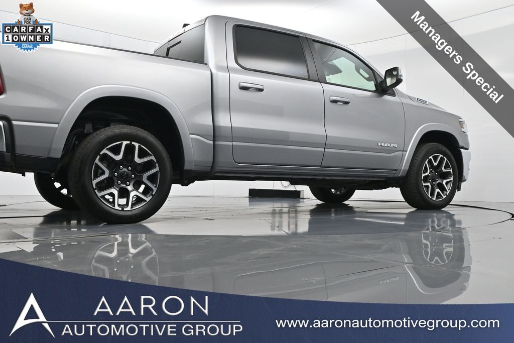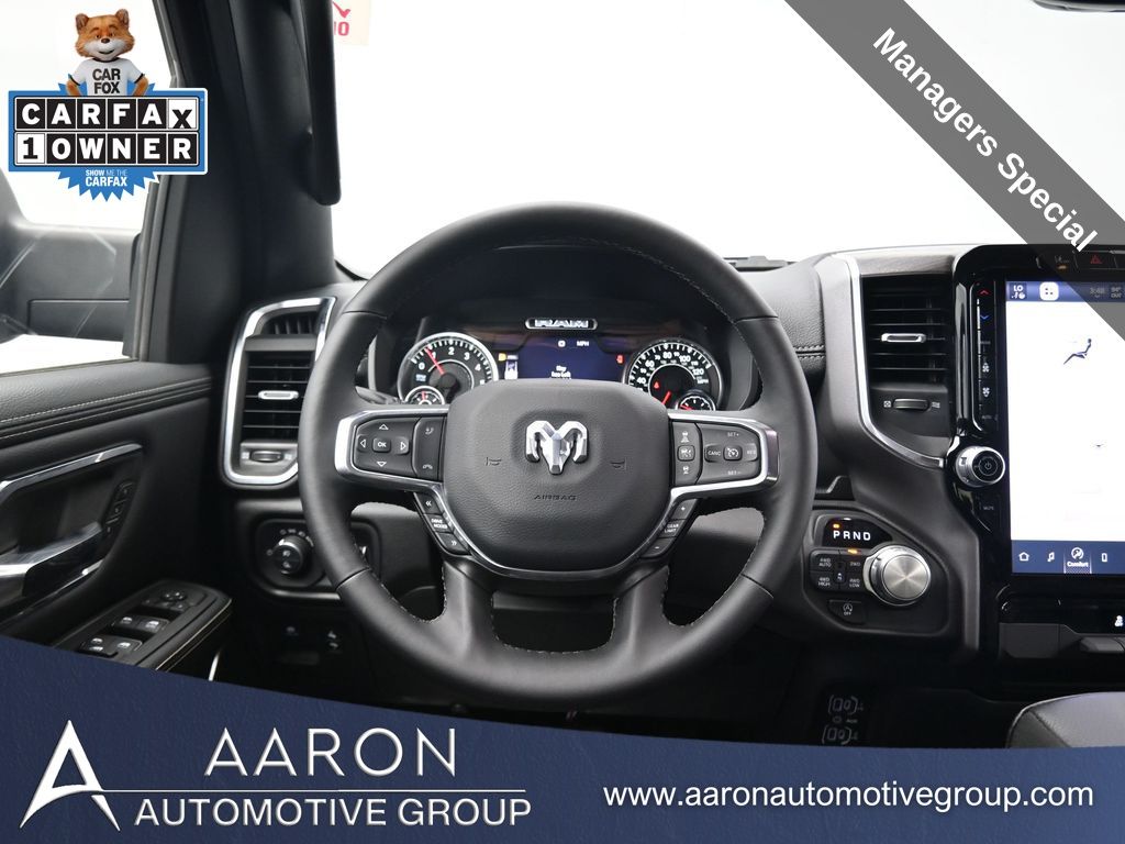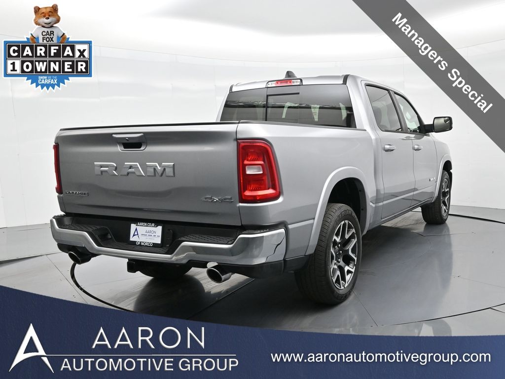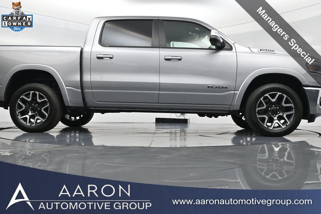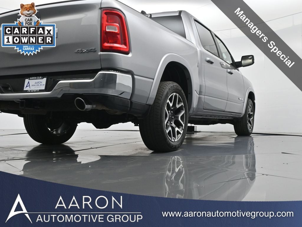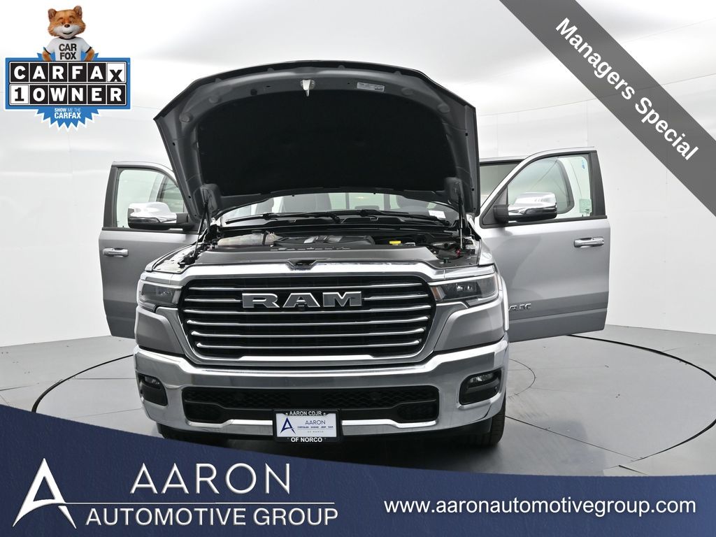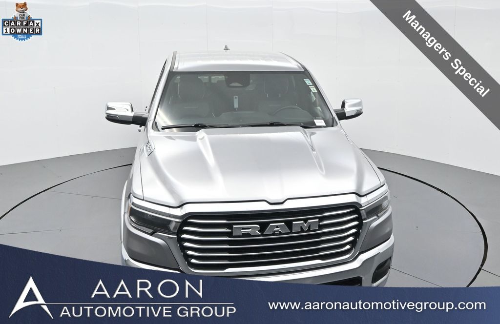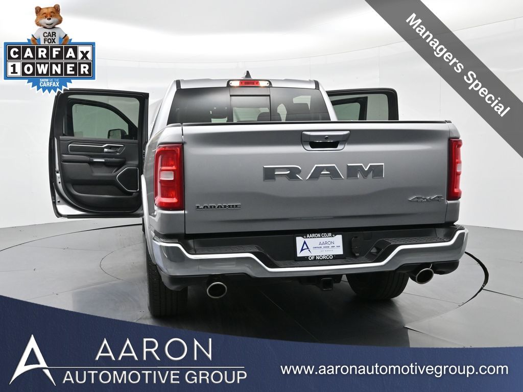 Commanding power, premium refinement, and low-mileage reliability come together in this 2025 Ram 1500 Laramie Crew Cab 4x4, a full-size pickup built for those who demand uncompromising comfort and proven performance. With just 10,840 miles, a clean 1-owner Carfax, no accidents, and documented service history, this nearly new Laramie offers outstanding value and peace of mind. Under the hood, the efficient and robust 3.0L I6 Turbocharged engine is paired with a TorqueFlite 8-speed automatic transmission and on-demand transfer case, delivering smooth acceleration and confident traction in any weather with its intelligent four-wheel-drive system. Rated at an EPA-estimated 19 MPG combined (17 city and 24 highway), this Ram offers solid efficiency for a heavy-duty performer. Dressed in Bright White Clear-Coat Paint with chrome bumpers, 20-inch polished aluminum wheels, LED reflector headlamps, and body-color mirrors, this Laramie looks as sharp as it works. Inside, the cabin is loaded with premium materials and advanced tech, including heated and ventilated leather-trimmed front seats, a 12-inch Uconnect 5 NAV touchscreen, Apple CarPlay, Android Auto, SiriusXM with 360L, 9-amplified speaker Alpine sound system, dual-zone climate control, remote start, power-adjustable pedals, memory driver settings, and a power sliding rear window. Safety features include Full-Speed Forward Collision Warning Plus, Blind Spot and Cross-Path Detection, ParkSense Front and Rear Park Assist, a backup camera, and Rain Brake Support. Added options like the Customer Preferred Package 21H, bed utility group, and anti-spin differential rear axle make this Laramie as practical as it is luxurious. Backed by Rams 5-year/60,000-mile powertrain warranty, this low-mileage truck gives you the peace of mind and confidence you deserve. Whether you're hauling gear, towing heavy loads, or cruising in comfort, this Ram 1500 Laramie is built to exceed expectations. Invest in quality, durability, and craftsmanship that works as hard as you do.